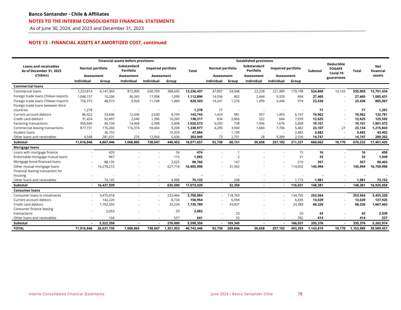 Banco Santander - Chile & Affiliates NOTES TO THE INTERIM CONSOLIDATED FINANCIAL STATEMENTS As of June 30, 2024, and 2023 and December 31, 2023 Interim Consolidated Financial Statements June 2024 / Banco Santander-Chile 78 NOTE 13 - FINANCIAL ASSETS AT AMORTIZED COST, continued Loans and receivables As of December 31, 2023 (Ch$mn) Financial assets before provisions Total Established provisions Subtotal Deductible FOGAPE Covid-19 guarantees Total Net financial assets Normal portfolio Substandard Portfolio Impaired portfolio Normal portfolio Substandard Portfolio Impaired portfolio Assessment Assessment Assessment Assessment Assessment Assessment Individual Group Individual Individual Group Individual Group Individual Individual Group Commercial loans Commercial loans 7,253,814 4,147,369 815,900 630,709 388,645 13,236,437 47,897 54,048 22,228 221,489 179,198 524,860 10,143 535,003 12,701,434 Foreign trade loans Chilean exports 1,048,157 10,206 36,345 17,098 1,090 1,112,896 14,596 402 2,444 9,329 694 27,465 - 27,465 1,085,431 Foreign trade loans Chilean imports 756,372 48,973 9,926 11,748 1,484 828,503 14,241 1,276 1,499 5,446 974 23,436 - 23,436 805,067 Foreign trade loans between third countries 1,278 - - - - 1,278 77 - - - - 77 - 77 1,201 Current account debtors 86,922 33,646 12,436 2,630 8,109 143,743 1,424 981 957 1,493 6,107 10,962 - 10,962 132,781 Credit card debtors 31,424 92,497 2,640 1,396 10,260 138,217 834 2,866 322 664 7,939 12,625 - 12,625 125,592 Factoring transactions 956,600 40,109 14,968 2,998 5,898 1,020,573 9,293 738 1,496 1,676 5,898 19,101 - 19,101 1,001,472 Commercial leasing transactions 877,731 176,260 116,374 59,404 9,208 1,238,977 4,295 3,940 1,684 7,706 5,482 23,107 27 23,134 1,215,843 Student loans - 36,755 - - 10,329 47,084 - 1,199 - - 2,483 3,682 - 3,682 43,402 Other loans and receivables 4,548 281,631 276 12,064 5,430 303,949 73 2,701 28 9,389 2,556 14,747 - 14,747 289,202 Subtotal 11,016,846 4,867,446 1,008,865 738,047 440,453 18,071,657 92,730 68,151 30,658 257,192 211,331 660,062 10,170 670,232 17,401,425 Mortgage loans Loans with mortgage finance - 420 - - 54 474 - 1 - - 15 16 - 16 458 Endorsable mortgage mutual loans - 967 - - 115 1,082 - 2 - - 31 33 - 33 1,049 Mortgage bond-financed loans - 88,135 - - 2,625 90,760 - 147 - - 210 357 - 357 90,403 Other mutual mortgage loans - 16,278,272 - - 627,718 16,905,990 - 31,992 - - 114,002 145,994 - 145,994 16,759,996 Financial leasing transaction for housing - - - - - - - - - - - - - - - Other loans and receivables - 70,145 - - 4,988 75,133 - 208 - - 1,773 1,981 - 1,981 73,152 Subtotal - 16,437,939 - - 635,500 17,073,439 - 32,350 - - 116,031 148,381 - 148,381 16,925,058 Consumer loans Consumer loans in instalments - 3,475,418 - - 233,466 3,708,884 - 118,769 - - 134,795 253,564 - 253,564 3,455,320 Current account debtors - 142,220 - - 8,734 150,954 - 6,594 - - 6,435 13,029 - 13,029 137,925 Credit card debtors - 1,702,555 - - 33,234 1,735,789 - 43,937 - - 24,389 68,326 - 68,326 1,667,463 Consumer finance leasing transactions - 2,053 - - 29 2,082 - 23 - - 20 43 - 43 2,039 Other loans and receivables - 104 - - 537 641 - 22 - - 392 414 - 414 227 Subtotal - 5,322,350 - - 276,000 5,598,350 - 169,345 - - 166,031 335,376 - 335,376 5,262,974 TOTAL 11,016,846 26,627,735 1,008,865 738,047 1,351,953 40,743,446 92,730 269,846 30,658 257,192 493,393 1,143,819 10,170 1,153,989 39,589,457