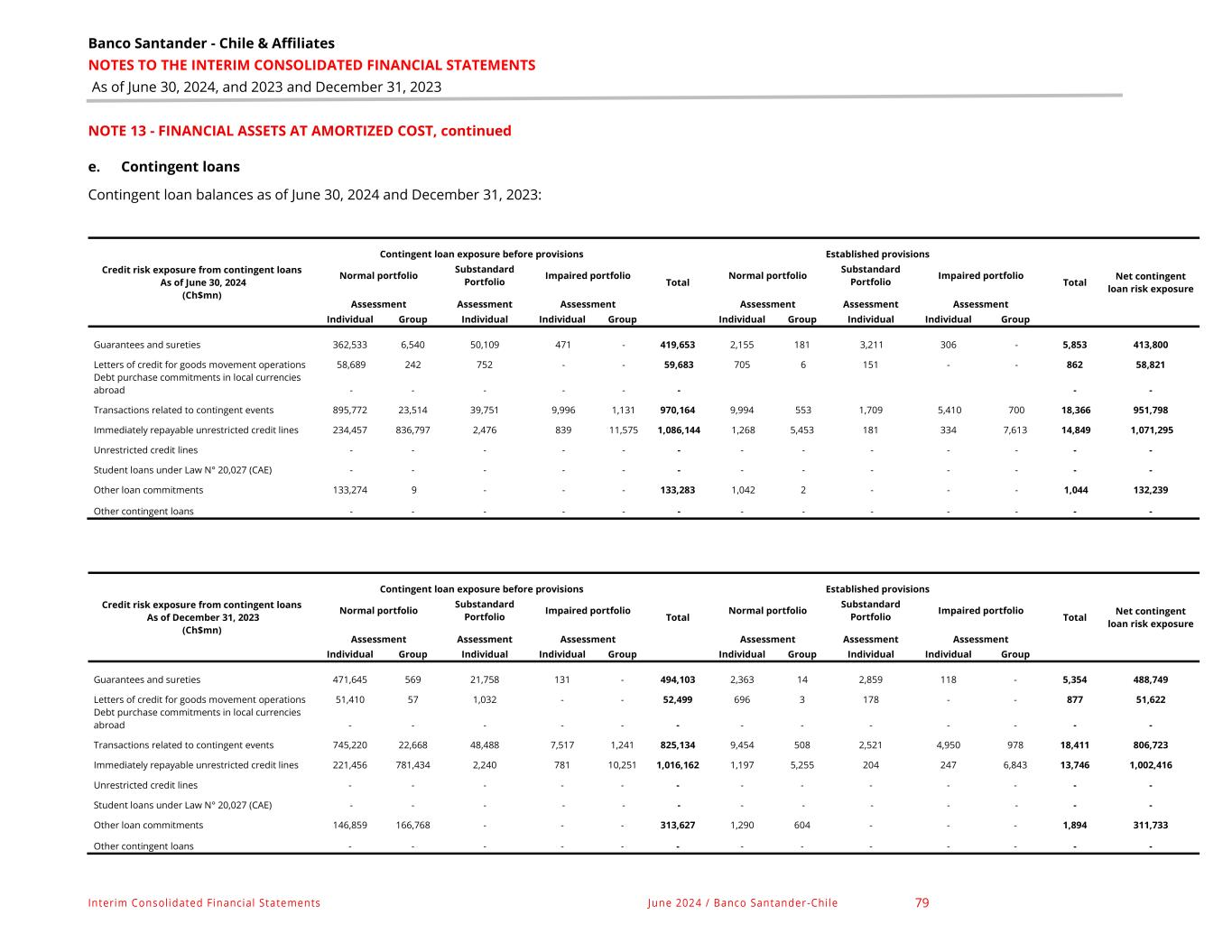 Banco Santander - Chile & Affiliates NOTES TO THE INTERIM CONSOLIDATED FINANCIAL STATEMENTS As of June 30, 2024, and 2023 and December 31, 2023 Interim Consolidated Financial Statements June 2024 / Banco Santander-Chile 79 NOTE 13 - FINANCIAL ASSETS AT AMORTIZED COST, continued e. Contingent loans Contingent loan balances as of June 30, 2024 and December 31, 2023: Credit risk exposure from contingent loans As of June 30, 2024 (Ch$mn) Contingent loan exposure before provisions Total Established provisions Total Net contingent loan risk exposure Normal portfolio Substandard Portfolio Impaired portfolio Normal portfolio Substandard Portfolio Impaired portfolio Assessment Assessment Assessment Assessment Assessment Assessment Individual Group Individual Individual Group Individual Group Individual Individual Group Guarantees and sureties 362,533 6,540 50,109 471 - 419,653 2,155 181 3,211 306 - 5,853 413,800 Letters of credit for goods movement operations 58,689 242 752 - - 59,683 705 6 151 - - 862 58,821 Debt purchase commitments in local currencies abroad - - - - - - - - Transactions related to contingent events 895,772 23,514 39,751 9,996 1,131 970,164 9,994 553 1,709 5,410 700 18,366 951,798 Immediately repayable unrestricted credit lines 234,457 836,797 2,476 839 11,575 1,086,144 1,268 5,453 181 334 7,613 14,849 1,071,295 Unrestricted credit lines - - - - - - - - - - - - - Student loans under Law N° 20,027 (CAE) - - - - - - - - - - - - - Other loan commitments 133,274 9 - - - 133,283 1,042 2 - - - 1,044 132,239 Other contingent loans - - - - - - - - - - - - - Credit risk exposure from contingent loans As of December 31, 2023 (Ch$mn) Contingent loan exposure before provisions Total Established provisions Total Net contingent loan risk exposure Normal portfolio Substandard Portfolio Impaired portfolio Normal portfolio Substandard Portfolio Impaired portfolio Assessment Assessment Assessment Assessment Assessment Assessment Individual Group Individual Individual Group Individual Group Individual Individual Group Guarantees and sureties 471,645 569 21,758 131 - 494,103 2,363 14 2,859 118 - 5,354 488,749 Letters of credit for goods movement operations 51,410 57 1,032 - - 52,499 696 3 178 - - 877 51,622 Debt purchase commitments in local currencies abroad - - - - - - - - - - - - - Transactions related to contingent events 745,220 22,668 48,488 7,517 1,241 825,134 9,454 508 2,521 4,950 978 18,411 806,723 Immediately repayable unrestricted credit lines 221,456 781,434 2,240 781 10,251 1,016,162 1,197 5,255 204 247 6,843 13,746 1,002,416 Unrestricted credit lines - - - - - - - - - - - - - Student loans under Law N° 20,027 (CAE) - - - - - - - - - - - - - Other loan commitments 146,859 166,768 - - - 313,627 1,290 604 - - - 1,894 311,733 Other contingent loans - - - - - - - - - - - - -