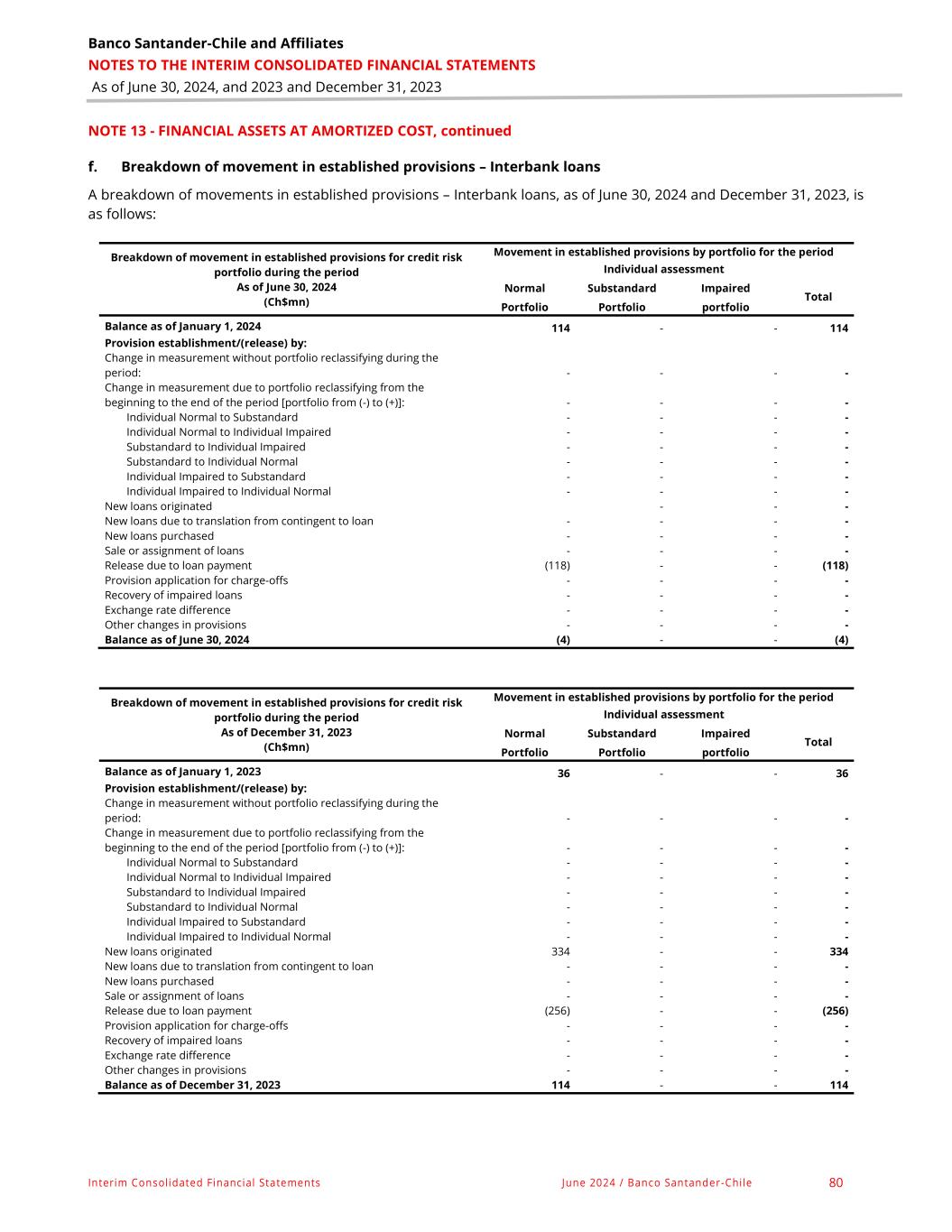 Banco Santander-Chile and Affiliates NOTES TO THE INTERIM CONSOLIDATED FINANCIAL STATEMENTS As of June 30, 2024, and 2023 and December 31, 2023 Interim Consolidated Financial Statements June 2024 / Banco Santander-Chile 80 NOTE 13 - FINANCIAL ASSETS AT AMORTIZED COST, continued f. Breakdown of movement in established provisions – Interbank loans A breakdown of movements in established provisions – Interbank loans, as of June 30, 2024 and December 31, 2023, is as follows: Breakdown of movement in established provisions for credit risk portfolio during the period As of June 30, 2024 (Ch$mn) Movement in established provisions by portfolio for the period Individual assessment Normal Substandard Impaired Total Portfolio Portfolio portfolio Balance as of January 1, 2024 114 - - 114 Provision establishment/(release) by: Change in measurement without portfolio reclassifying during the period: - - - - Change in measurement due to portfolio reclassifying from the beginning to the end of the period [portfolio from (-) to (+)]: - - - - Individual Normal to Substandard - - - - Individual Normal to Individual Impaired - - - - Substandard to Individual Impaired - - - - Substandard to Individual Normal - - - - Individual Impaired to Substandard - - - - Individual Impaired to Individual Normal - - - - New loans originated - - - New loans due to translation from contingent to loan - - - - New loans purchased - - - - Sale or assignment of loans - - - - Release due to loan payment (118) - - (118) Provision application for charge-offs - - - - Recovery of impaired loans - - - - Exchange rate difference - - - - Other changes in provisions - - - - Balance as of June 30, 2024 (4) - - (4) Breakdown of movement in established provisions for credit risk portfolio during the period As of December 31, 2023 (Ch$mn) Movement in established provisions by portfolio for the period Individual assessment Normal Substandard Impaired Total Portfolio Portfolio portfolio Balance as of January 1, 2023 36 - - 36 Provision establishment/(release) by: Change in measurement without portfolio reclassifying during the period: - - - - Change in measurement due to portfolio reclassifying from the beginning to the end of the period [portfolio from (-) to (+)]: - - - - Individual Normal to Substandard - - - - Individual Normal to Individual Impaired - - - - Substandard to Individual Impaired - - - - Substandard to Individual Normal - - - - Individual Impaired to Substandard - - - - Individual Impaired to Individual Normal - - - - New loans originated 334 - - 334 New loans due to translation from contingent to loan - - - - New loans purchased - - - - Sale or assignment of loans - - - - Release due to loan payment (256) - - (256) Provision application for charge-offs - - - - Recovery of impaired loans - - - - Exchange rate difference - - - - Other changes in provisions - - - - Balance as of December 31, 2023 114 - - 114