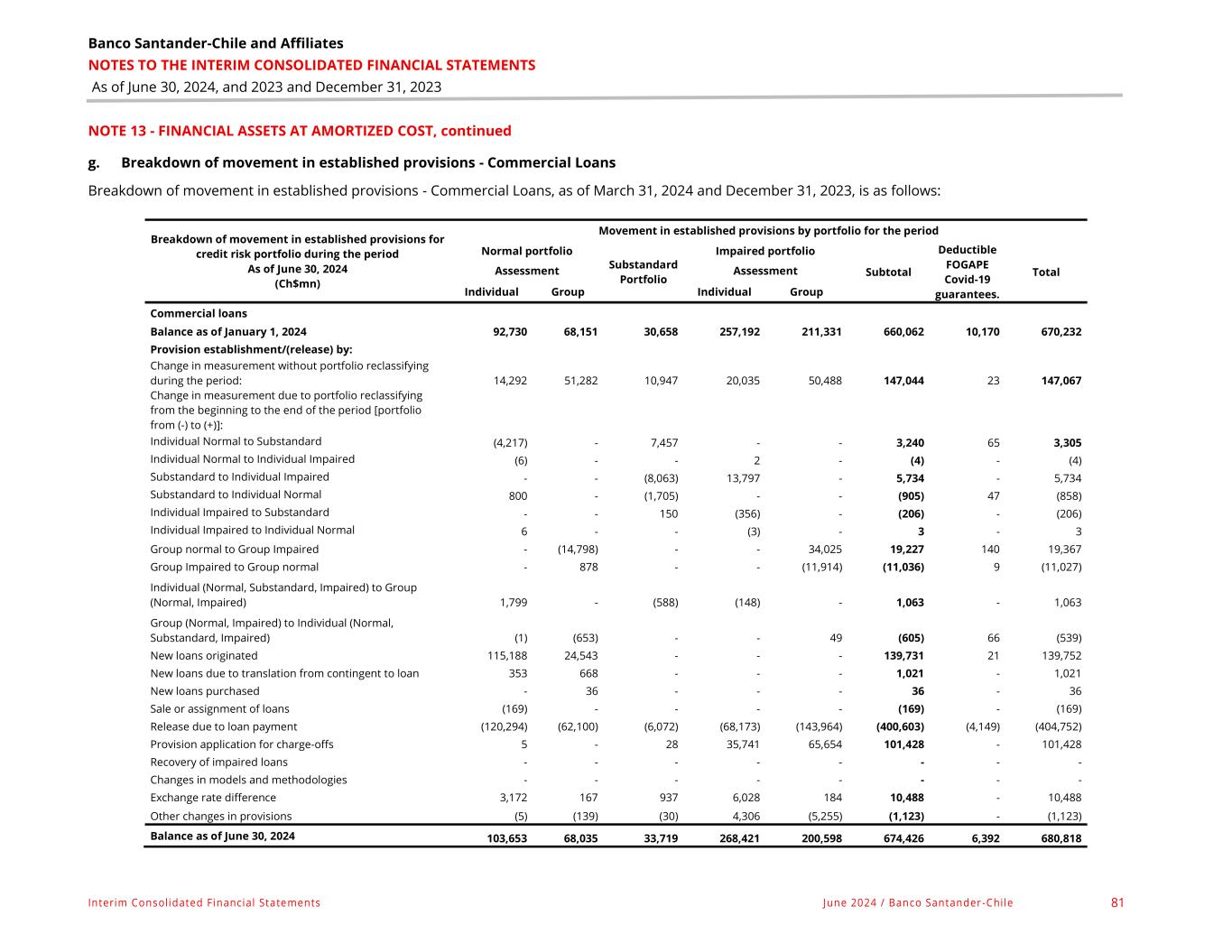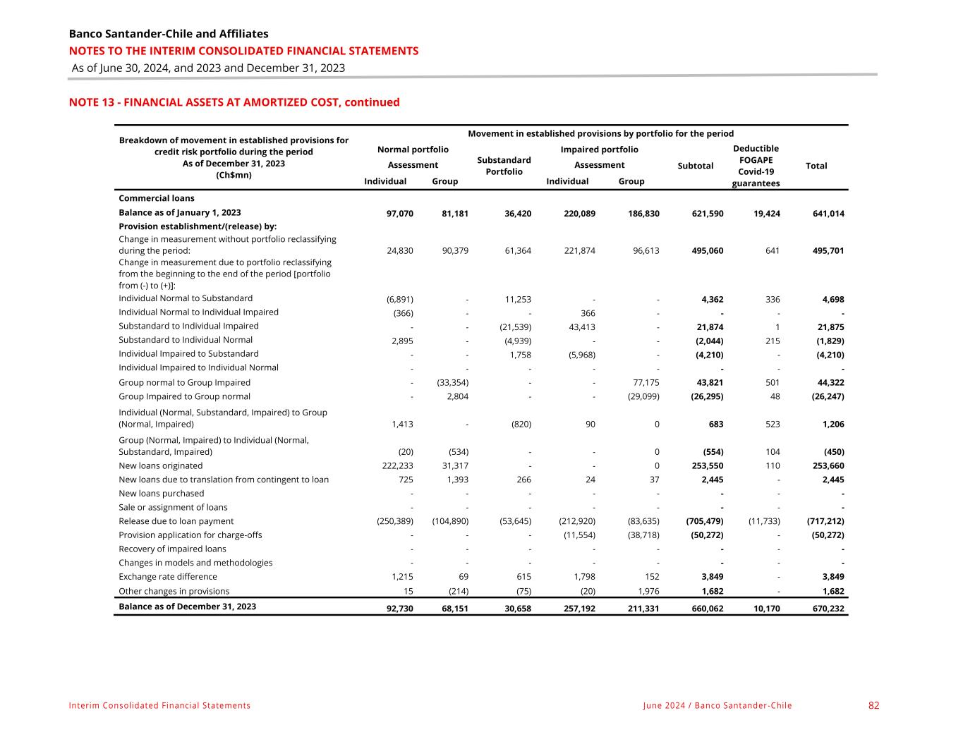 Banco Santander-Chile and Affiliates NOTES TO THE INTERIM CONSOLIDATED FINANCIAL STATEMENTS As of June 30, 2024, and 2023 and December 31, 2023 Interim Consolidated Financial Statements June 2024 / Banco Santander -Chile 82 NOTE 13 - FINANCIAL ASSETS AT AMORTIZED COST, continued Breakdown of movement in established provisions for credit risk portfolio during the period As of December 31, 2023 (Ch$mn) Movement in established provisions by portfolio for the period Normal portfolio Substandard Portfolio Impaired portfolio Subtotal Deductible FOGAPE Covid-19 guarantees Total Assessment Assessment Individual Group Individual Group Commercial loans Balance as of January 1, 2023 97,070 81,181 36,420 220,089 186,830 621,590 19,424 641,014 Provision establishment/(release) by: Change in measurement without portfolio reclassifying during the period: 24,830 90,379 61,364 221,874 96,613 495,060 641 495,701 Change in measurement due to portfolio reclassifying from the beginning to the end of the period [portfolio from (-) to (+)]: Individual Normal to Substandard (6,891) - 11,253 - - 4,362 336 4,698 Individual Normal to Individual Impaired (366) - - 366 - - - - Substandard to Individual Impaired - - (21,539) 43,413 - 21,874 1 21,875 Substandard to Individual Normal 2,895 - (4,939) - - (2,044) 215 (1,829) Individual Impaired to Substandard - - 1,758 (5,968) - (4,210) - (4,210) Individual Impaired to Individual Normal - - - - - - - - Group normal to Group Impaired - (33,354) - - 77,175 43,821 501 44,322 Group Impaired to Group normal - 2,804 - - (29,099) (26,295) 48 (26,247) Individual (Normal, Substandard, Impaired) to Group (Normal, Impaired) 1,413 - (820) 90 0 683 523 1,206 Group (Normal, Impaired) to Individual (Normal, Substandard, Impaired) (20) (534) - - 0 (554) 104 (450) New loans originated 222,233 31,317 - - 0 253,550 110 253,660 New loans due to translation from contingent to loan 725 1,393 266 24 37 2,445 - 2,445 New loans purchased - - - - - - - - Sale or assignment of loans - - - - - - - - Release due to loan payment (250,389) (104,890) (53,645) (212,920) (83,635) (705,479) (11,733) (717,212) Provision application for charge-offs - - - (11,554) (38,718) (50,272) - (50,272) Recovery of impaired loans - - - - - - - - Changes in models and methodologies - - - - - - - - Exchange rate difference 1,215 69 615 1,798 152 3,849 - 3,849 Other changes in provisions 15 (214) (75) (20) 1,976 1,682 - 1,682 Balance as of December 31, 2023 92,730 68,151 30,658 257,192 211,331 660,062 10,170 670,232