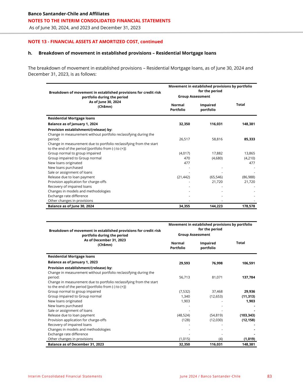 Banco Santander-Chile and Affiliates NOTES TO THE INTERIM CONSOLIDATED FINANCIAL STATEMENTS As of June 30, 2024, and 2023 and December 31, 2023 Interim Consolidated Financial Statements June 2024 / Banco Santander -Chile 83 NOTE 13 - FINANCIAL ASSETS AT AMORTIZED COST, continued h. Breakdown of movement in established provisions – Residential Mortgage loans The breakdown of movement in established provisions – Residential Mortgage loans, as of June 30, 2024 and December 31, 2023, is as follows: Breakdown of movement in established provisions for credit risk portfolio during the period As of June 30, 2024 (Ch$mn) Movement in established provisions by portfolio for the period Group Assessment Total Normal Portfolio Impaired portfolio Residential Mortgage loans Balance as of January 1, 2024 32,350 116,031 148,381 Provision establishment/(release) by: Change in measurement without portfolio reclassifying during the period: 26,517 58,816 85,333 Change in measurement due to portfolio reclassifying from the start to the end of the period [portfolio from (-) to (+)]: Group normal to group impaired (4,017) 17,882 13,865 Group impaired to Group normal 470 (4,680) (4,210) New loans originated 477 477 New loans purchased - - - Sale or assignment of loans - - - Release due to loan payment (21,442) (65,546) (86,988) Provision application for charge-offs - 21,720 21,720 Recovery of impaired loans - - - Changes in models and methodologies - - - Exchange rate difference - - - Other changes in provisions - - - Balance as of June 30, 2024 34,355 144,223 178,578 Breakdown of movement in established provisions for credit risk portfolio during the period As of December 31, 2023 (Ch$mn) Movement in established provisions by portfolio for the period Group Assessment Total Normal Portfolio Impaired portfolio Residential Mortgage loans Balance as of January 1, 2023 29,593 76,998 106,591 Provision establishment/(release) by: Change in measurement without portfolio reclassifying during the period: 56,713 81,071 137,784 Change in measurement due to portfolio reclassifying from the start to the end of the period [portfolio from (-) to (+)]: Group normal to group impaired (7,532) 37,468 29,936 Group impaired to Group normal 1,340 (12,653) (11,313) New loans originated 1,903 - 1,903 New loans purchased - - - Sale or assignment of loans - - - Release due to loan payment (48,524) (54,819) (103,343) Provision application for charge-offs (128) (12,030) (12,158) Recovery of impaired loans - - - Changes in models and methodologies - - - Exchange rate difference - - - Other changes in provisions (1,015) (4) (1,019) Balance as of December 31, 2023 32,350 116,031 148,381