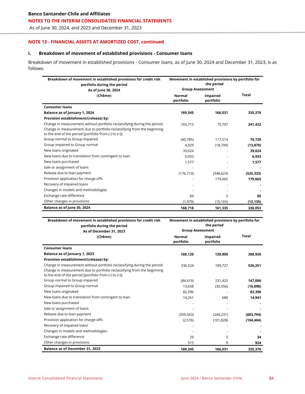 Banco Santander-Chile and Affiliates NOTES TO THE INTERIM CONSOLIDATED FINANCIAL STATEMENTS As of June 30, 2024, and 2023 and December 31, 2023 Interim Consolidated Financial Statements June 2024 / Banco Santander -Chile 84 NOTE 13 - FINANCIAL ASSETS AT AMORTIZED COST, continued i. Breakdown of movement of established provisions - Consumer loans Breakdown of movement in established provisions - Consumer loans, as of June 30, 2024 and December 31, 2023, is as follows: Breakdown of movement in established provisions for credit risk portfolio during the period As of June 30, 2024 (Ch$mn) Movement in established provisions by portfolio for the period Group Assessment Total Normal portfolio Impaired portfolio Consumer loans Balance as of January 1, 2024 169,345 166,031 335,376 Provision establishment/(release) by: Change in measurement without portfolio reclassifying during the period: 165,715 75,707 241,422 Change in measurement due to portfolio reclassifying from the beginning to the end of the period [portfolio from (-) to (+)]: Group normal to Group impaired (40,785) 117,514 76,729 Group impaired to Group normal 4,929 (18,799) (13,870) New loans originated 39,624 - 39,624 New loans due to translation from contingent to loan 6,933 - 6,933 New loans purchased 1,577 - 1,577 Sale or assignment of loans - - - Release due to loan payment (176,710) (348,623) (525,333) Provision application for charge-offs - 179,665 179,665 Recovery of impaired loans - - - Changes in models and methodologies - - - Exchange rate difference 60 5 65 Other changes in provisions (1,970) (10,165) (12,135) Balance as of June 30, 2024 168,718 161,335 330,053 Breakdown of movement in established provisions for credit risk portfolio during the period As of December 31, 2023 (Ch$mn) Movement in established provisions by portfolio for the period Group Assessment Total Normal portfolio Impaired portfolio Consumer loans Balance as of January 1, 2023 168,120 120,800 288,920 Provision establishment/(release) by: Change in measurement without portfolio reclassifying during the period: 336,524 189,727 526,251 Change in measurement due to portfolio reclassifying from the beginning to the end of the period [portfolio from (-) to (+)]: Group normal to Group impaired (84,419) 231,425 147,006 Group impaired to Group normal 13,658 (30,556) (16,898) New loans originated 82,396 - 82,396 New loans due to translation from contingent to loan 14,261 680 14,941 New loans purchased - - - Sale or assignment of loans - - - Release due to loan payment (359,563) (244,231) (603,794) Provision application for charge-offs (2,576) (101,828) (104,404) Recovery of impaired loans - - - Changes in models and methodologies - - - Exchange rate difference 29 5 34 Other changes in provisions 915 9 924 Balance as of December 31, 2023 169,345 166,031 335,376