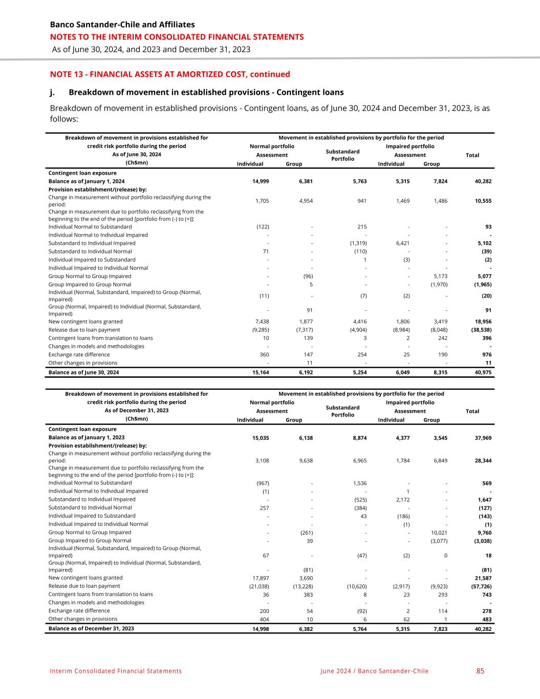 Banco Santander-Chile and Affiliates NOTES TO THE INTERIM CONSOLIDATED FINANCIAL STATEMENTS As of June 30, 2024, and 2023 and December 31, 2023 Interim Consolidated Financial Statements June 2024 / Banco Santander -Chile 85 NOTE 13 - FINANCIAL ASSETS AT AMORTIZED COST, continued j. Breakdown of movement in established provisions - Contingent loans Breakdown of movement in established provisions - Contingent loans, as of June 30, 2024 and December 31, 2023, is as follows: Breakdown of movement in provisions established for credit risk portfolio during the period As of June 30, 2024 (Ch$mn) Movement in established provisions by portfolio for the period Normal portfolio Substandard Portfolio Impaired portfolio Total Assessment Assessment Individual Group Individual Group Contingent loan exposure Balance as of January 1, 2024 14,999 6,381 5,763 5,315 7,824 40,282 Provision establishment/(release) by: Change in measurement without portfolio reclassifying during the period: 1,705 4,954 941 1,469 1,486 10,555 Change in measurement due to portfolio reclassifying from the beginning to the end of the period [portfolio from (-) to (+)]: Individual Normal to Substandard (122) - 215 - - 93 Individual Normal to Individual Impaired - - - - - - Substandard to Individual Impaired - - (1,319) 6,421 - 5,102 Substandard to Individual Normal 71 - (110) - - (39) Individual Impaired to Substandard - - 1 (3) - (2) Individual Impaired to Individual Normal - - - - - - Group Normal to Group Impaired - (96) - - 5,173 5,077 Group Impaired to Group Normal - 5 - - (1,970) (1,965) Individual (Normal, Substandard, Impaired) to Group (Normal, Impaired) (11) - (7) (2) - (20) Group (Normal, Impaired) to Individual (Normal, Substandard, Impaired) - 91 - - - 91 New contingent loans granted 7,438 1,877 4,416 1,806 3,419 18,956 Release due to loan payment (9,285) (7,317) (4,904) (8,984) (8,048) (38,538) Contingent loans from translation to loans 10 139 3 2 242 396 Changes in models and methodologies - - - - - - Exchange rate difference 360 147 254 25 190 976 Other changes in provisions - 11 - - - 11 Balance as of June 30, 2024 15,164 6,192 5,254 6,049 8,315 40,975 Breakdown of movement in provisions established for credit risk portfolio during the period As of December 31, 2023 (Ch$mn) Movement in established provisions by portfolio for the period Normal portfolio Substandard Portfolio Impaired portfolio Total Assessment Assessment Individual Group Individual Group Contingent loan exposure Balance as of January 1, 2023 15,035 6,138 8,874 4,377 3,545 37,969 Provision establishment/(release) by: Change in measurement without portfolio reclassifying during the period: 3,108 9,638 6,965 1,784 6,849 28,344 Change in measurement due to portfolio reclassifying from the beginning to the end of the period [portfolio from (-) to (+)]: Individual Normal to Substandard (967) - 1,536 - - 569 Individual Normal to Individual Impaired (1) - - 1 - - Substandard to Individual Impaired - - (525) 2,172 - 1,647 Substandard to Individual Normal 257 - (384) - - (127) Individual Impaired to Substandard - - 43 (186) - (143) Individual Impaired to Individual Normal - - - (1) - (1) Group Normal to Group Impaired - (261) - - 10,021 9,760 Group Impaired to Group Normal - 39 - - (3,077) (3,038) Individual (Normal, Substandard, Impaired) to Group (Normal, Impaired) 67 - (47) (2) 0 18 Group (Normal, Impaired) to Individual (Normal, Substandard, Impaired) - (81) - - - (81) New contingent loans granted 17,897 3,690 - - - 21,587 Release due to loan payment (21,038) (13,228) (10,620) (2,917) (9,923) (57,726) Contingent loans from translation to loans 36 383 8 23 293 743 Changes in models and methodologies - - - - - - Exchange rate difference 200 54 (92) 2 114 278 Other changes in provisions 404 10 6 62 1 483 Balance as of December 31, 2023 14,998 6,382 5,764 5,315 7,823 40,282