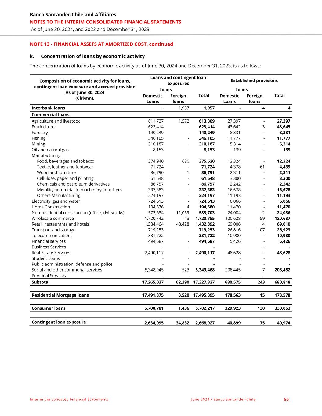 Banco Santander-Chile and Affiliates NOTES TO THE INTERIM CONSOLIDATED FINANCIAL STATEMENTS As of June 30, 2024, and 2023 and December 31, 2023 Interim Consolidated Financial Statements June 2024 / Banco Santander -Chile 86 NOTE 13 - FINANCIAL ASSETS AT AMORTIZED COST, continued k. Concentration of loans by economic activity The concentration of loans by economic activity as of June 30, 2024 and December 31, 2023, is as follows: Composition of economic activity for loans, contingent loan exposure and accrued provision As of June 30, 2024 (Ch$mn). Loans and contingent loan exposures Established provisions Loans Total Loans Total Domestic Loans Foreign loans Domestic Loans Foreign loans Interbank loans - 1,957 1,957 - 4 4 Commercial loans Agriculture and livestock 611,737 1,572 613,309 27,397 - 27,397 Fruticulture 623,414 - 623,414 43,642 3 43,645 Forestry 140,249 - 140,249 8,331 - 8,331 Fishing 346,105 - 346,105 11,777 - 11,777 Mining 310,187 - 310,187 5,314 - 5,314 Oil and natural gas 8,153 - 8,153 139 - 139 Manufacturing Food, beverages and tobacco 374,940 680 375,620 12,324 - 12,324 Textile, leather and footwear 71,724 - 71,724 4,378 61 4,439 Wood and furniture 86,790 1 86,791 2,311 - 2,311 Cellulose, paper and printing 61,648 - 61,648 3,300 - 3,300 Chemicals and petroleum derivatives 86,757 - 86,757 2,242 - 2,242 Metallic, non-metallic, machinery, or others 337,383 - 337,383 16,678 - 16,678 Others Manufacturing 224,197 - 224,197 11,193 - 11,193 Electricity, gas and water 724,613 - 724,613 6,066 - 6,066 Home Construction 194,576 4 194,580 11,470 - 11,470 Non-residential construction (office, civil works) 572,634 11,069 583,703 24,084 2 24,086 Wholesale commerce 1,720,742 13 1,720,755 120,628 59 120,687 Retail, restaurants and hotels 1,384,464 48,428 1,432,892 69,006 4 69,010 Transport and storage 719,253 - 719,253 26,816 107 26,923 Telecommunications 331,722 - 331,722 10,980 - 10,980 Financial services 494,687 - 494,687 5,426 - 5,426 Business Services - - - - - - Real Estate Services 2,490,117 - 2,490,117 48,628 - 48,628 Student Loans - - - - - - Public administration, defense and police - - - - - - Social and other communal services 5,348,945 523 5,349,468 208,445 7 208,452 Personal Services - - - - - - Subtotal 17,265,037 62,290 17,327,327 680,575 243 680,818 Residential Mortgage loans 17,491,875 3,520 17,495,395 178,563 15 178,578 Consumer loans 5,700,781 1,436 5,702,217 329,923 130 330,053 Contingent loan exposure 2,634,095 34,832 2,668,927 40,899 75 40,974