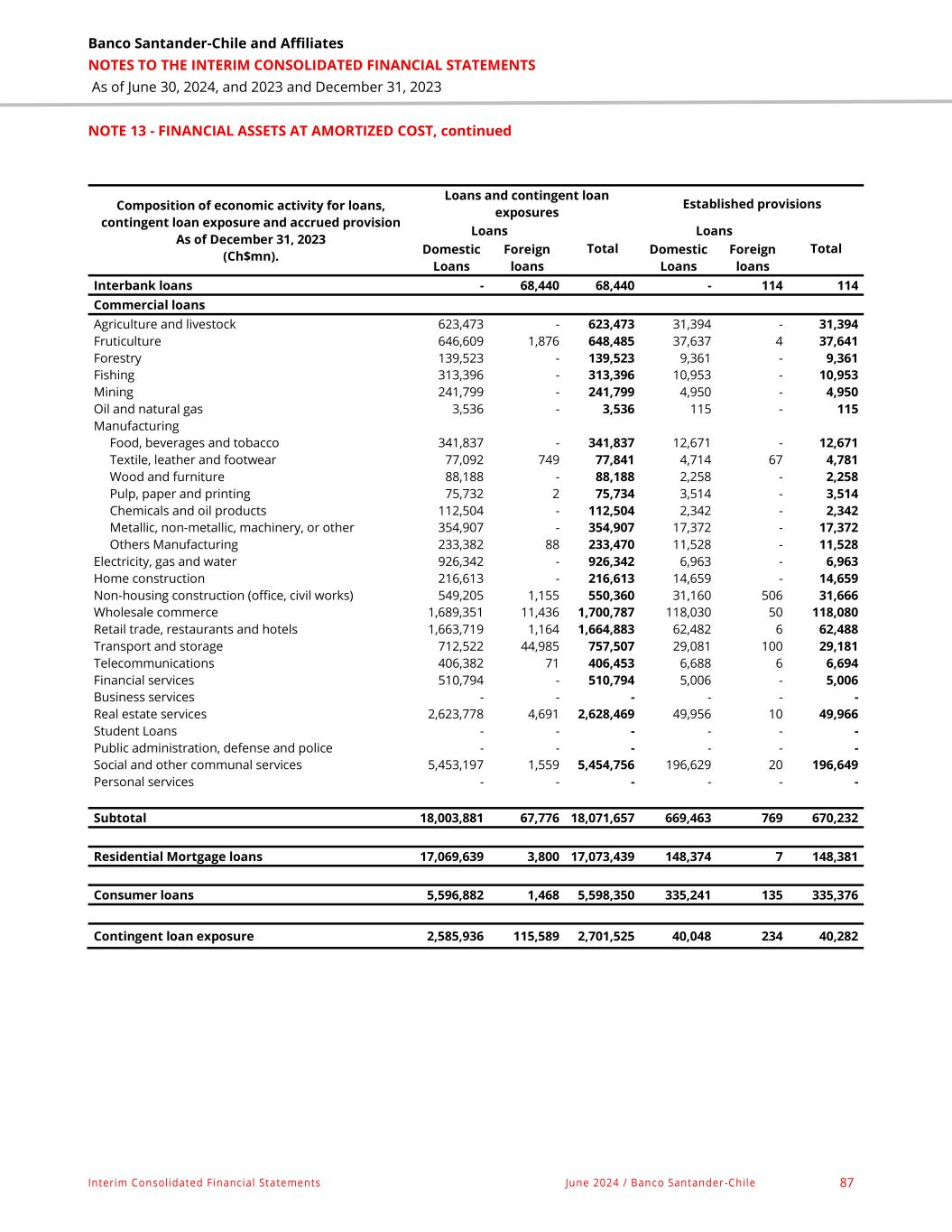Banco Santander-Chile and Affiliates NOTES TO THE INTERIM CONSOLIDATED FINANCIAL STATEMENTS As of June 30, 2024, and 2023 and December 31, 2023 Interim Consolidated Financial Statements June 2024 / Banco Santander -Chile 87 NOTE 13 - FINANCIAL ASSETS AT AMORTIZED COST, continued Composition of economic activity for loans, contingent loan exposure and accrued provision As of December 31, 2023 (Ch$mn). Loans and contingent loan exposures Established provisions Loans Total Loans Total Domestic Loans Foreign loans Domestic Loans Foreign loans Interbank loans - 68,440 68,440 - 114 114 Commercial loans Agriculture and livestock 623,473 - 623,473 31,394 - 31,394 Fruticulture 646,609 1,876 648,485 37,637 4 37,641 Forestry 139,523 - 139,523 9,361 - 9,361 Fishing 313,396 - 313,396 10,953 - 10,953 Mining 241,799 - 241,799 4,950 - 4,950 Oil and natural gas 3,536 - 3,536 115 - 115 Manufacturing Food, beverages and tobacco 341,837 - 341,837 12,671 - 12,671 Textile, leather and footwear 77,092 749 77,841 4,714 67 4,781 Wood and furniture 88,188 - 88,188 2,258 - 2,258 Pulp, paper and printing 75,732 2 75,734 3,514 - 3,514 Chemicals and oil products 112,504 - 112,504 2,342 - 2,342 Metallic, non-metallic, machinery, or other 354,907 - 354,907 17,372 - 17,372 Others Manufacturing 233,382 88 233,470 11,528 - 11,528 Electricity, gas and water 926,342 - 926,342 6,963 - 6,963 Home construction 216,613 - 216,613 14,659 - 14,659 Non-housing construction (office, civil works) 549,205 1,155 550,360 31,160 506 31,666 Wholesale commerce 1,689,351 11,436 1,700,787 118,030 50 118,080 Retail trade, restaurants and hotels 1,663,719 1,164 1,664,883 62,482 6 62,488 Transport and storage 712,522 44,985 757,507 29,081 100 29,181 Telecommunications 406,382 71 406,453 6,688 6 6,694 Financial services 510,794 - 510,794 5,006 - 5,006 Business services - - - - - - Real estate services 2,623,778 4,691 2,628,469 49,956 10 49,966 Student Loans - - - - - - Public administration, defense and police - - - - - - Social and other communal services 5,453,197 1,559 5,454,756 196,629 20 196,649 Personal services - - - - - - Subtotal 18,003,881 67,776 18,071,657 669,463 769 670,232 Residential Mortgage loans 17,069,639 3,800 17,073,439 148,374 7 148,381 Consumer loans 5,596,882 1,468 5,598,350 335,241 135 335,376 Contingent loan exposure 2,585,936 115,589 2,701,525 40,048 234 40,282