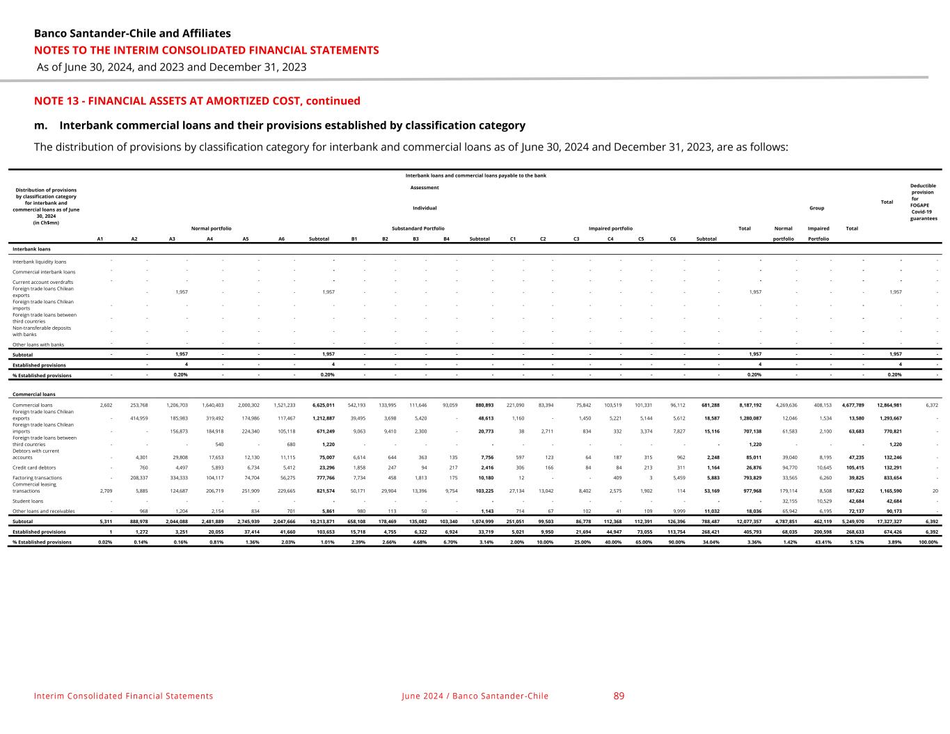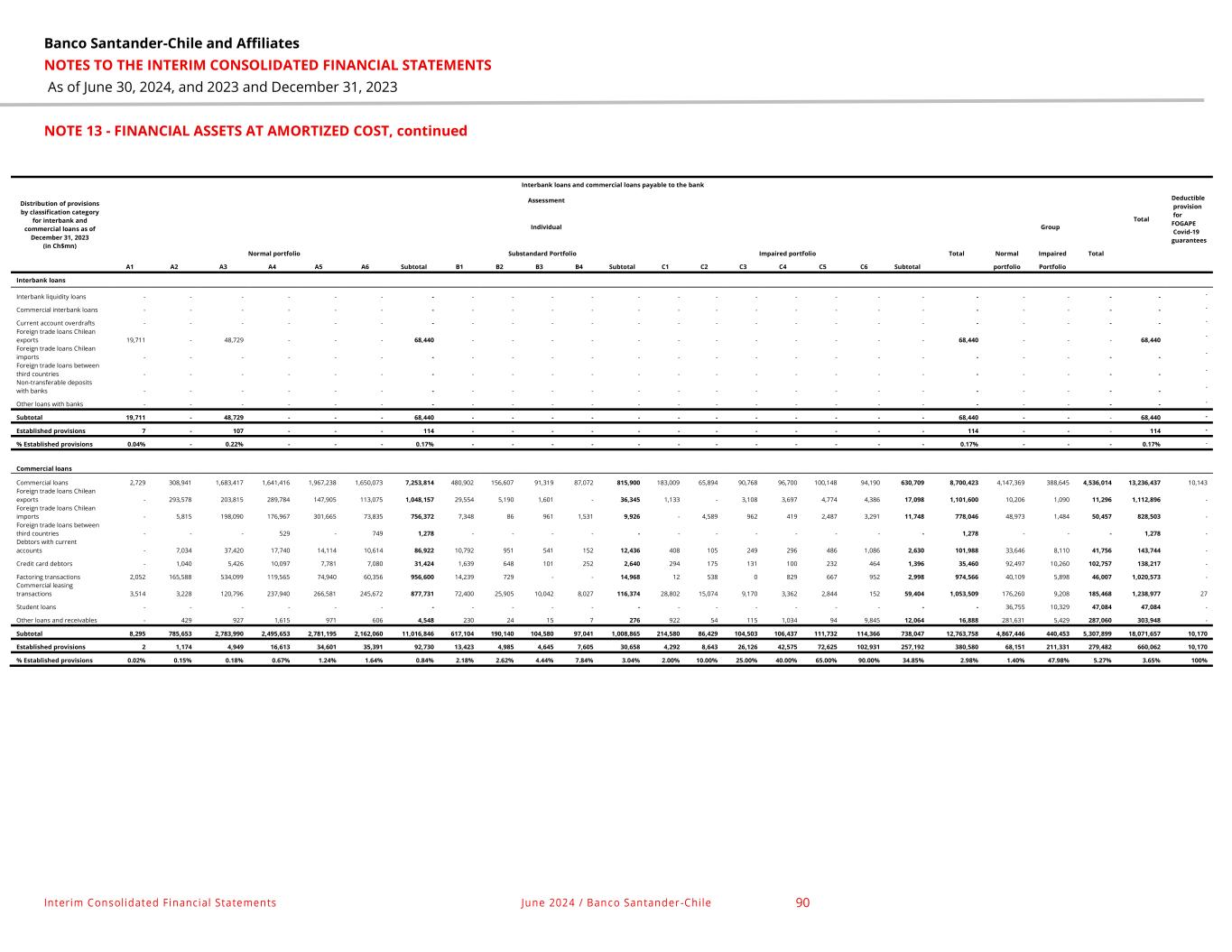 Banco Santander-Chile and Affiliates NOTES TO THE INTERIM CONSOLIDATED FINANCIAL STATEMENTS As of June 30, 2024, and 2023 and December 31, 2023 Interim Consolidated Financial Statements June 2024 / Banco Santander -Chile 89 NOTE 13 - FINANCIAL ASSETS AT AMORTIZED COST, continued m. Interbank commercial loans and their provisions established by classification category The distribution of provisions by classification category for interbank and commercial loans as of June 30, 2024 and December 31, 2023, are as follows: Distribution of provisions by classification category for interbank and commercial loans as of June 30, 2024 (in Ch$mn) Interbank loans and commercial loans payable to the bank Assessment Total Deductible provision for FOGAPE Covid-19 guarantees Individual Group Normal portfolio Substandard Portfolio Impaired portfolio Total Normal Impaired Total A1 A2 A3 A4 A5 A6 Subtotal B1 B2 B3 B4 Subtotal C1 C2 C3 C4 C5 C6 Subtotal portfolio Portfolio Interbank loans Interbank liquidity loans - - - - - - - - - - - - - - - - - - - - - - - - - Commercial interbank loans - - - - - - - - - - - - - - - - - - - - - - - - - Current account overdrafts - - - - - - - - - - - - - - - - - - - - - - - - - Foreign trade loans Chilean exports - 1,957 - - - 1,957 - - - - - - - - - - - - 1,957 - - - 1,957 - Foreign trade loans Chilean imports - - - - - - - - - - - - - - - - - - - - - - - - - Foreign trade loans between third countries - - - - - - - - - - - - - - - - - - - - - - - - - Non-transferable deposits with banks - - - - - - - - - - - - - - - - - - - - - - - - - Other loans with banks - - - - - - - - - - - - - - - - - - - - - - - - - Subtotal - - 1,957 - - - 1,957 - - - - - - - - - - - - 1,957 - - - 1,957 - Established provisions - 4 - - - 4 - - - - - - - - - - - - 4 - - - 4 - % Established provisions - - 0.20% - - - 0.20% - - - - - - - - - - - - 0.20% - - - 0.20% - Commercial loans Commercial loans 2,602 253,768 1,206,703 1,640,403 2,000,302 1,521,233 6,625,011 542,193 133,995 111,646 93,059 880,893 221,090 83,394 75,842 103,519 101,331 96,112 681,288 8,187,192 4,269,636 408,153 4,677,789 12,864,981 6,372 Foreign trade loans Chilean exports - 414,959 185,983 319,492 174,986 117,467 1,212,887 39,495 3,698 5,420 - 48,613 1,160 - 1,450 5,221 5,144 5,612 18,587 1,280,087 12,046 1,534 13,580 1,293,667 - Foreign trade loans Chilean imports - - 156,873 184,918 224,340 105,118 671,249 9,063 9,410 2,300 - 20,773 38 2,711 834 332 3,374 7,827 15,116 707,138 61,583 2,100 63,683 770,821 - Foreign trade loans between third countries - - - 540 - 680 1,220 - - - - - - - - - - - - 1,220 - - - 1,220 - Debtors with current accounts - 4,301 29,808 17,653 12,130 11,115 75,007 6,614 644 363 135 7,756 597 123 64 187 315 962 2,248 85,011 39,040 8,195 47,235 132,246 - Credit card debtors - 760 4,497 5,893 6,734 5,412 23,296 1,858 247 94 217 2,416 306 166 84 84 213 311 1,164 26,876 94,770 10,645 105,415 132,291 - Factoring transactions - 208,337 334,333 104,117 74,704 56,275 777,766 7,734 458 1,813 175 10,180 12 - - 409 3 5,459 5,883 793,829 33,565 6,260 39,825 833,654 - Commercial leasing transactions 2,709 5,885 124,687 206,719 251,909 229,665 821,574 50,171 29,904 13,396 9,754 103,225 27,134 13,042 8,402 2,575 1,902 114 53,169 977,968 179,114 8,508 187,622 1,165,590 20 Student loans - - - - - - - - - - - - - - - - - - - - 32,155 10,529 42,684 42,684 - Other loans and receivables - 968 1,204 2,154 834 701 5,861 980 113 50 - 1,143 714 67 102 41 109 9,999 11,032 18,036 65,942 6,195 72,137 90,173 - Subtotal 5,311 888,978 2,044,088 2,481,889 2,745,939 2,047,666 10,213,871 658,108 178,469 135,082 103,340 1,074,999 251,051 99,503 86,778 112,368 112,391 126,396 788,487 12,077,357 4,787,851 462,119 5,249,970 17,327,327 6,392 Established provisions 1 1,272 3,251 20,055 37,414 41,660 103,653 15,718 4,755 6,322 6,924 33,719 5,021 9,950 21,694 44,947 73,055 113,754 268,421 405,793 68,035 200,598 268,633 674,426 6,392 % Established provisions 0.02% 0.14% 0.16% 0.81% 1.36% 2.03% 1.01% 2.39% 2.66% 4.68% 6.70% 3.14% 2.00% 10.00% 25.00% 40.00% 65.00% 90.00% 34.04% 3.36% 1.42% 43.41% 5.12% 3.89% 100.00%