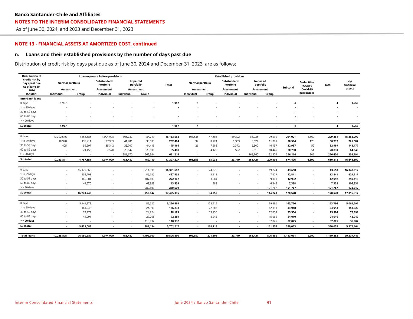 Banco Santander-Chile and Affiliates NOTES TO THE INTERIM CONSOLIDATED FINANCIAL STATEMENTS As of June 30, 2024, and 2023 and December 31, 2023 Interim Consolidated Financial Statements June 2024 / Banco Santander -Chile 91 NOTE 13 - FINANCIAL ASSETS AT AMORTIZED COST, continued n. Loans and their established provisions by the number of days past due Distribution of credit risk by days past due as of June 30, 2024 and December 31, 2023, are as follows: Distribution of credit risk by days past due As of June 30, 2024 (Ch$mn) Loan exposure before provisions Total Established provisions Total Net financial assets Normal portfolio Substandard Portfolio Impaired portfolio Normal portfolio Substandard Portfolio Impaired portfolio Subtotal Deductible FOGAPE Covid-19 guarantees Assessment Assessment Assessment Assessment Assessment Assessment Individual Group Individual Individual Group Individual Group Individual Individual Group Interbank loans 0 days 1,957 - - - - 1,957 4 - - - - 4 - 4 1,953 1 to 29 days - - - - - - - - - - - - - - - 30 to 59 days - - - - - - - - - - - - - - - 60 to 89 days - - - - - - - - - - - - - - - > = 90 days - - - - - - - - - - - - - - - Subtotal 1,957 - - - - 1,957 4 - - - - 4 - 4 1,953 0 days 10,202,546 4,565,888 1,004,098 305,782 84,749 16,163,063 103,535 47,606 29,392 83,938 29,530 294,001 5,860 299,861 15,863,202 1 to 29 days 10,920 138,211 27,989 41,781 33,503 252,404 92 8,724 1,363 8,624 11,791 30,594 123 30,717 221,687 30 to 59 days 405 59,297 35,342 35,707 44,415 175,166 26 7,582 2,372 6,500 16,457 32,937 52 32,989 142,177 60 to 89 days - 24,455 7,570 23,547 29,908 85,480 - 4,123 592 5,619 10,446 20,780 51 20,831 64,649 > = 90 days - - - 381,670 269,544 651,214 - - - 163,740 132,374 296,114 306 296,420 354,794 Subtotal 10,213,871 4,787,851 1,074,999 788,487 462,119 17,327,327 103,653 68,035 33,719 268,421 200,598 674,426 6,392 680,818 16,646,509 0 days - 16,179,666 - - 211,996 16,391,662 - 24,376 - - 19,274 43,650 - 43,650 16,348,012 1 to 29 days - 352,408 - - 85,150 437,558 - 5,312 - - 7,529 12,841 - 12,841 424,717 30 to 59 days - 165,004 - - 107,103 272,107 - 3,684 - - 9,308 12,992 - 12,992 259,115 60 to 89 days - 44,670 - - 68,889 113,559 - 983 - - 6,345 7,328 - 7,328 106,231 > = 90 days - - - - 280,509 280,509 - - - - 101,767 101,767 - 101,767 178,742 Subtotal - 16,741,748 - - 753,647 17,495,395 - 34,355 - - 144,223 178,578 - 178,578 17,316,817 0 days - 5,141,373 - - 85,220 5,226,593 - 123,916 - - 39,880 163,796 - 163,796 5,062,797 1 to 29 days - 161,248 - - 24,990 186,238 - 22,607 - - 12,311 34,918 - 34,918 151,320 30 to 59 days - 73,471 - - 24,724 98,195 - 13,250 - - 12,054 25,304 - 25,304 72,891 60 to 89 days - 44,991 - - 27,268 72,259 - 8,945 - - 15,065 24,010 - 24,010 48,249 > = 90 days - - - - 118,932 118,932 - - - - 82,025 82,025 - 82,025 36,907 Subtotal - 5,421,083 - - 281,134 5,702,217 - 168,718 - - 161,335 330,053 - 330,053 5,372,164 Total loans 10,215,828 26,950,682 1,074,999 788,487 1,496,900 40,526,896 103,657 271,108 33,719 268,421 506,156 1,183,061 6,392 1,189,453 39,337,443