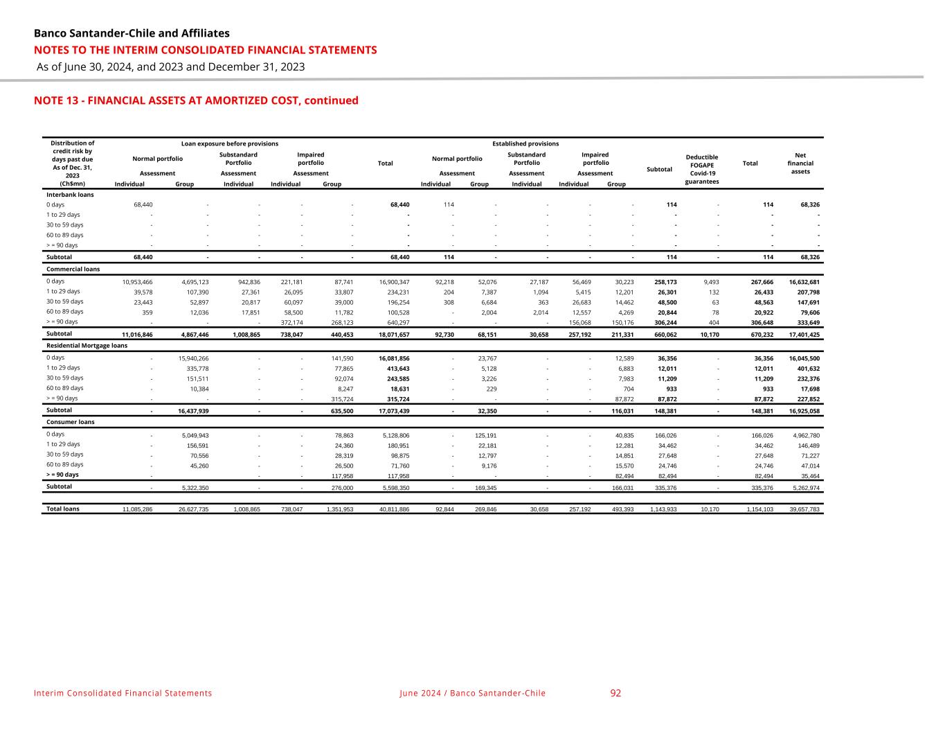Banco Santander-Chile and Affiliates NOTES TO THE INTERIM CONSOLIDATED FINANCIAL STATEMENTS As of June 30, 2024, and 2023 and December 31, 2023 Interim Consolidated Financial Statements June 2024 / Banco Santander -Chile 92 NOTE 13 - FINANCIAL ASSETS AT AMORTIZED COST, continued Distribution of credit risk by days past due As of Dec. 31, 2023 (Ch$mn) Loan exposure before provisions Total Established provisions Total Net financial assets Normal portfolio Substandard Portfolio Impaired portfolio Normal portfolio Substandard Portfolio Impaired portfolio Subtotal Deductible FOGAPE Covid-19 guarantees Assessment Assessment Assessment Assessment Assessment Assessment Individual Group Individual Individual Group Individual Group Individual Individual Group Interbank loans 0 days 68,440 - - - - 68,440 114 - - - - 114 - 114 68,326 1 to 29 days - - - - - - - - - - - - - - - 30 to 59 days - - - - - - - - - - - - - - - 60 to 89 days - - - - - - - - - - - - - - - > = 90 days - - - - - - - - - - - - - - - Subtotal 68,440 - - - - 68,440 114 - - - - 114 - 114 68,326 Commercial loans 0 days 10,953,466 4,695,123 942,836 221,181 87,741 16,900,347 92,218 52,076 27,187 56,469 30,223 258,173 9,493 267,666 16,632,681 1 to 29 days 39,578 107,390 27,361 26,095 33,807 234,231 204 7,387 1,094 5,415 12,201 26,301 132 26,433 207,798 30 to 59 days 23,443 52,897 20,817 60,097 39,000 196,254 308 6,684 363 26,683 14,462 48,500 63 48,563 147,691 60 to 89 days 359 12,036 17,851 58,500 11,782 100,528 - 2,004 2,014 12,557 4,269 20,844 78 20,922 79,606 > = 90 days - - - 372,174 268,123 640,297 - - - 156,068 150,176 306,244 404 306,648 333,649 Subtotal 11,016,846 4,867,446 1,008,865 738,047 440,453 18,071,657 92,730 68,151 30,658 257,192 211,331 660,062 10,170 670,232 17,401,425 Residential Mortgage loans 0 days - 15,940,266 - - 141,590 16,081,856 - 23,767 - - 12,589 36,356 - 36,356 16,045,500 1 to 29 days - 335,778 - - 77,865 413,643 - 5,128 - - 6,883 12,011 - 12,011 401,632 30 to 59 days - 151,511 - - 92,074 243,585 - 3,226 - - 7,983 11,209 - 11,209 232,376 60 to 89 days - 10,384 - - 8,247 18,631 - 229 - - 704 933 - 933 17,698 > = 90 days - - - - 315,724 315,724 - - - - 87,872 87,872 - 87,872 227,852 Subtotal - 16,437,939 - - 635,500 17,073,439 - 32,350 - - 116,031 148,381 - 148,381 16,925,058 Consumer loans 0 days - 5,049,943 - - 78,863 5,128,806 - 125,191 - - 40,835 166,026 - 166,026 4,962,780 1 to 29 days - 156,591 - - 24,360 180,951 - 22,181 - - 12,281 34,462 - 34,462 146,489 30 to 59 days - 70,556 - - 28,319 98,875 - 12,797 - - 14,851 27,648 - 27,648 71,227 60 to 89 days - 45,260 - - 26,500 71,760 - 9,176 - - 15,570 24,746 - 24,746 47,014 > = 90 days - - - 117,958 117,958 - - - - 82,494 82,494 - 82,494 35,464 Subtotal - 5,322,350 - - 276,000 5,598,350 - 169,345 - - 166,031 335,376 - 335,376 5,262,974 Total loans 11,085,286 26,627,735 1,008,865 738,047 1,351,953 40,811,886 92,844 269,846 30,658 257,192 493,393 1,143,933 10,170 1,154,103 39,657,783