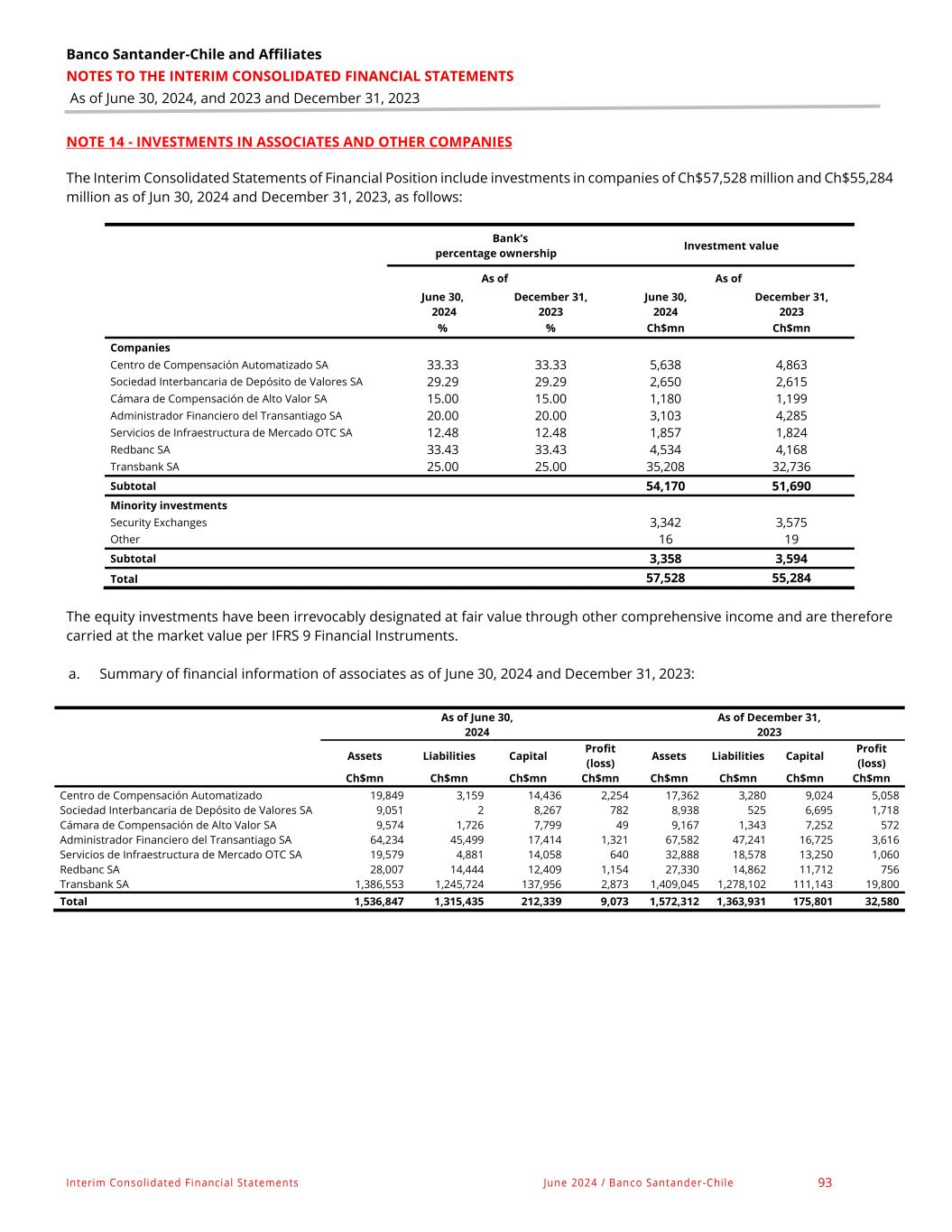 Banco Santander-Chile and Affiliates NOTES TO THE INTERIM CONSOLIDATED FINANCIAL STATEMENTS As of June 30, 2024, and 2023 and December 31, 2023 Interim Consolidated Financial Statements June 2024 / Banco Santander -Chile 93 NOTE 14 - INVESTMENTS IN ASSOCIATES AND OTHER COMPANIES The Interim Consolidated Statements of Financial Position include investments in companies of Ch$57,528 million and Ch$55,284 million as of Jun 30, 2024 and December 31, 2023, as follows: Bank’s percentage ownership Investment value As of As of June 30, 2024 December 31, 2023 June 30, 2024 December 31, 2023 % % Ch$mn Ch$mn Companies Centro de Compensación Automatizado SA 33.33 33.33 5,638 4,863 Sociedad Interbancaria de Depósito de Valores SA 29.29 29.29 2,650 2,615 Cámara de Compensación de Alto Valor SA 15.00 15.00 1,180 1,199 Administrador Financiero del Transantiago SA 20.00 20.00 3,103 4,285 Servicios de Infraestructura de Mercado OTC SA 12.48 12.48 1,857 1,824 Redbanc SA 33.43 33.43 4,534 4,168 Transbank SA 25.00 25.00 35,208 32,736 Subtotal 54,170 51,690 Minority investments Security Exchanges 3,342 3,575 Other 16 19 Subtotal 3,358 3,594 Total 57,528 55,284 The equity investments have been irrevocably designated at fair value through other comprehensive income and are therefore carried at the market value per IFRS 9 Financial Instruments. a. Summary of financial information of associates as of June 30, 2024 and December 31, 2023: As of June 30, As of December 31, 2024 2023 Assets Liabilities Capital Profit (loss) Assets Liabilities Capital Profit (loss) Ch$mn Ch$mn Ch$mn Ch$mn Ch$mn Ch$mn Ch$mn Ch$mn Centro de Compensación Automatizado 19,849 3,159 14,436 2,254 17,362 3,280 9,024 5,058 Sociedad Interbancaria de Depósito de Valores SA 9,051 2 8,267 782 8,938 525 6,695 1,718 Cámara de Compensación de Alto Valor SA 9,574 1,726 7,799 49 9,167 1,343 7,252 572 Administrador Financiero del Transantiago SA 64,234 45,499 17,414 1,321 67,582 47,241 16,725 3,616 Servicios de Infraestructura de Mercado OTC SA 19,579 4,881 14,058 640 32,888 18,578 13,250 1,060 Redbanc SA 28,007 14,444 12,409 1,154 27,330 14,862 11,712 756 Transbank SA 1,386,553 1,245,724 137,956 2,873 1,409,045 1,278,102 111,143 19,800 Total 1,536,847 1,315,435 212,339 9,073 1,572,312 1,363,931 175,801 32,580
