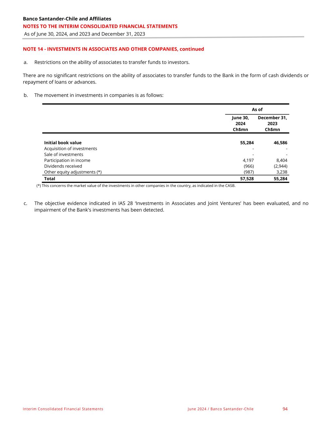 Banco Santander-Chile and Affiliates NOTES TO THE INTERIM CONSOLIDATED FINANCIAL STATEMENTS As of June 30, 2024, and 2023 and December 31, 2023 Interim Consolidated Financial Statements June 2024 / Banco Santander -Chile 94 NOTE 14 - INVESTMENTS IN ASSOCIATES AND OTHER COMPANIES, continued a. Restrictions on the ability of associates to transfer funds to investors. There are no significant restrictions on the ability of associates to transfer funds to the Bank in the form of cash dividends or repayment of loans or advances. b. The movement in investments in companies is as follows: As of June 30, 2024 December 31, 2023 Ch$mn Ch$mn Initial book value 55,284 46,586 Acquisition of investments - - Sale of investments - - Participation in income 4,197 8,404 Dividends received (966) (2,944) Other equity adjustments (*) (987) 3,238 Total 57,528 55,284 (*) This concerns the market value of the investments in other companies in the country, as indicated in the CASB. c. The objective evidence indicated in IAS 28 ‘Investments in Associates and Joint Ventures’ has been evaluated, and no impairment of the Bank's investments has been detected.