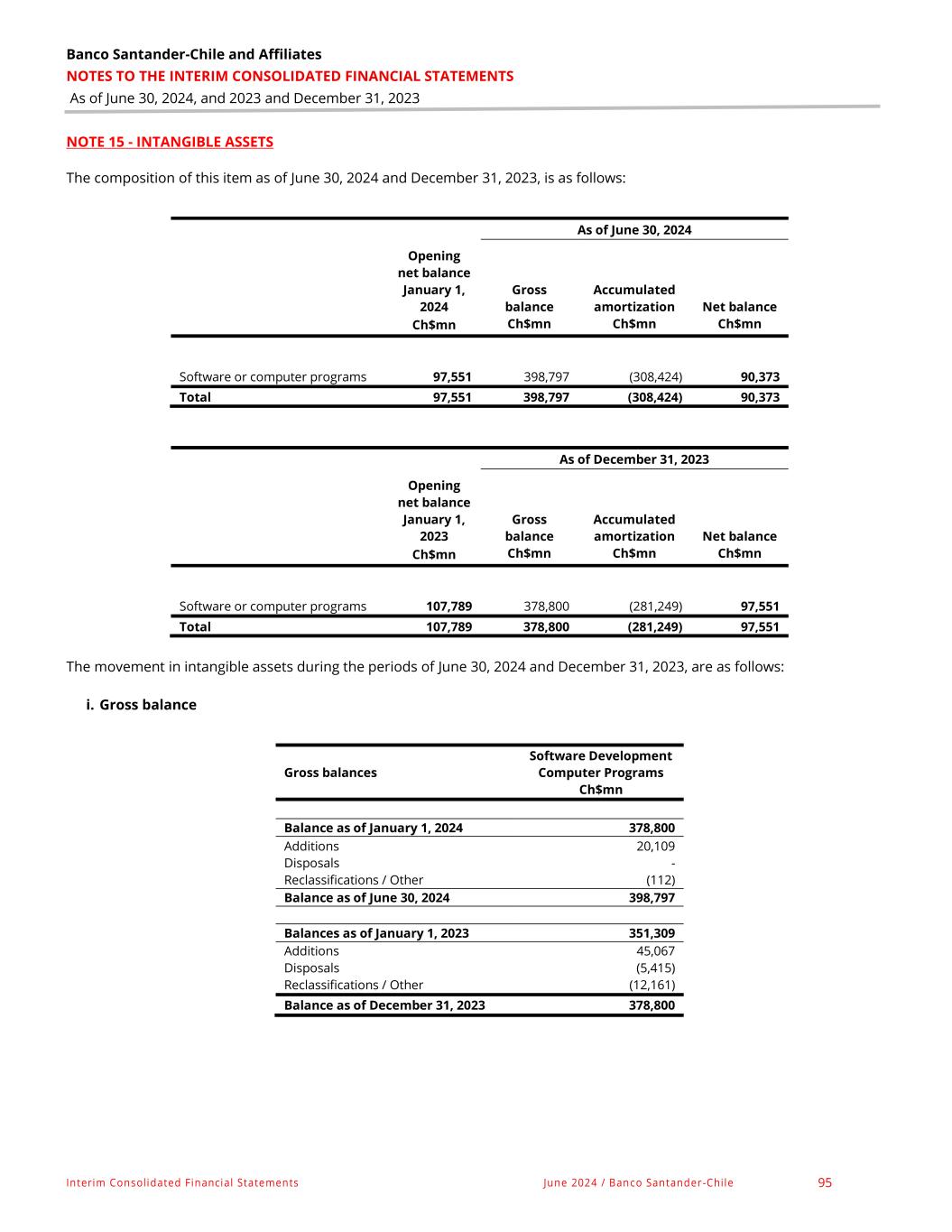 Banco Santander-Chile and Affiliates NOTES TO THE INTERIM CONSOLIDATED FINANCIAL STATEMENTS As of June 30, 2024, and 2023 and December 31, 2023 Interim Consolidated Financial Statements June 2024 / Banco Santander -Chile 95 NOTE 15 - INTANGIBLE ASSETS The composition of this item as of June 30, 2024 and December 31, 2023, is as follows: As of June 30, 2024 Opening net balance January 1, 2024 Gross balance Accumulated amortization Net balance Ch$mn Ch$mn Ch$mn Ch$mn Software or computer programs 97,551 398,797 (308,424) 90,373 Total 97,551 398,797 (308,424) 90,373 As of December 31, 2023 Opening net balance January 1, 2023 Gross balance Accumulated amortization Net balance Ch$mn Ch$mn Ch$mn Ch$mn Software or computer programs 107,789 378,800 (281,249) 97,551 Total 107,789 378,800 (281,249) 97,551 The movement in intangible assets during the periods of June 30, 2024 and December 31, 2023, are as follows: i. Gross balance Gross balances Software Development Computer Programs Ch$mn Balance as of January 1, 2024 378,800 Additions 20,109 Disposals - Reclassifications / Other (112) Balance as of June 30, 2024 398,797 Balances as of January 1, 2023 351,309 Additions 45,067 Disposals (5,415) Reclassifications / Other (12,161) Balance as of December 31, 2023 378,800