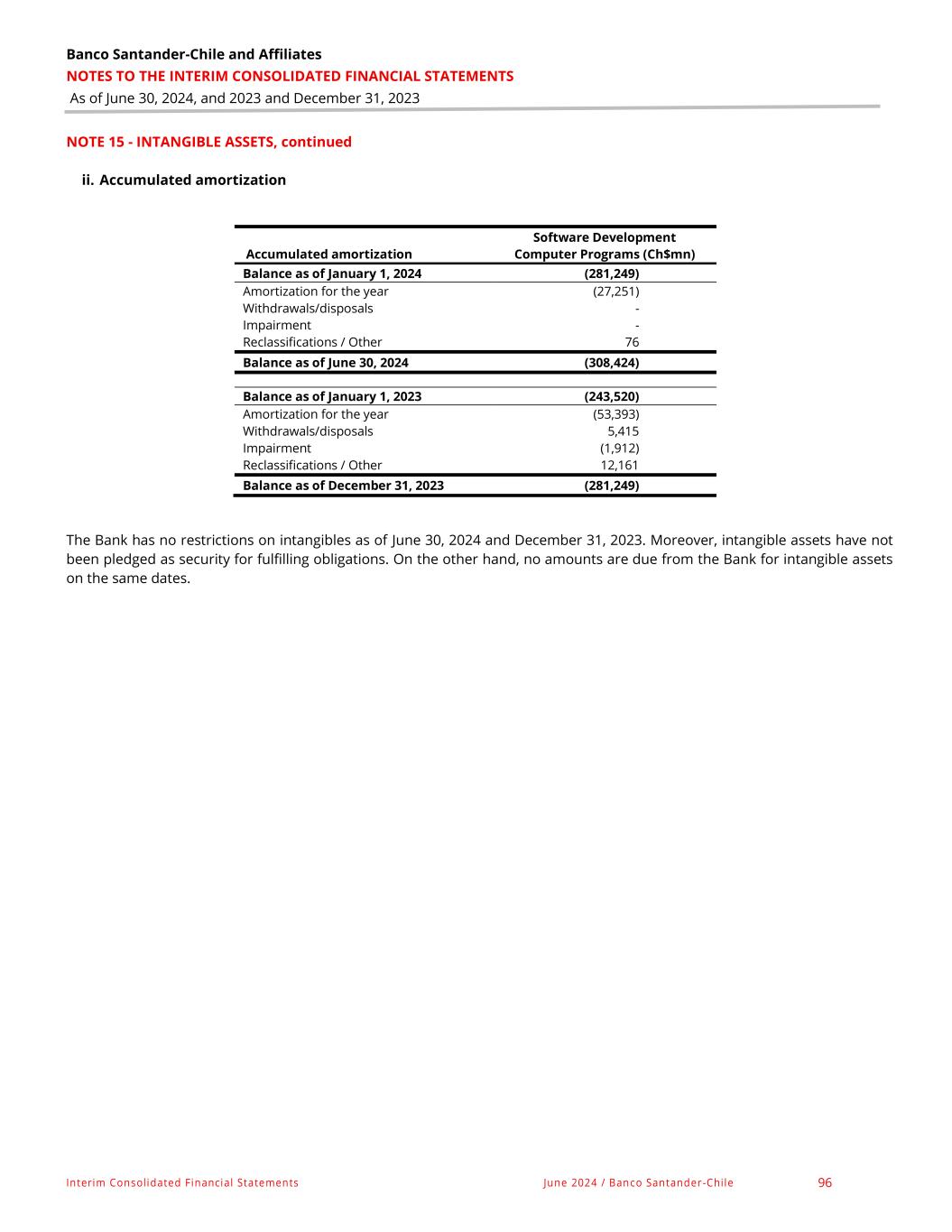 Banco Santander-Chile and Affiliates NOTES TO THE INTERIM CONSOLIDATED FINANCIAL STATEMENTS As of June 30, 2024, and 2023 and December 31, 2023 Interim Consolidated Financial Statements June 2024 / Banco Santander -Chile 96 NOTE 15 - INTANGIBLE ASSETS, continued ii. Accumulated amortization The Bank has no restrictions on intangibles as of June 30, 2024 and December 31, 2023. Moreover, intangible assets have not been pledged as security for fulfilling obligations. On the other hand, no amounts are due from the Bank for intangible assets on the same dates. Accumulated amortization Software Development Computer Programs (Ch$mn) Balance as of January 1, 2024 (281,249) Amortization for the year (27,251) Withdrawals/disposals - Impairment - Reclassifications / Other 76 Balance as of June 30, 2024 (308,424) Balance as of January 1, 2023 (243,520) Amortization for the year (53,393) Withdrawals/disposals 5,415 Impairment (1,912) Reclassifications / Other 12,161 Balance as of December 31, 2023 (281,249)