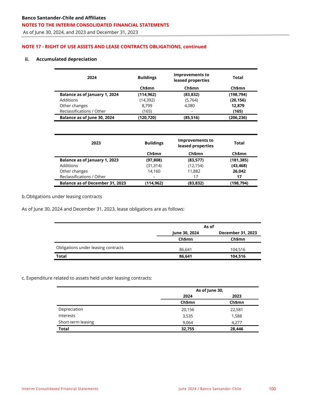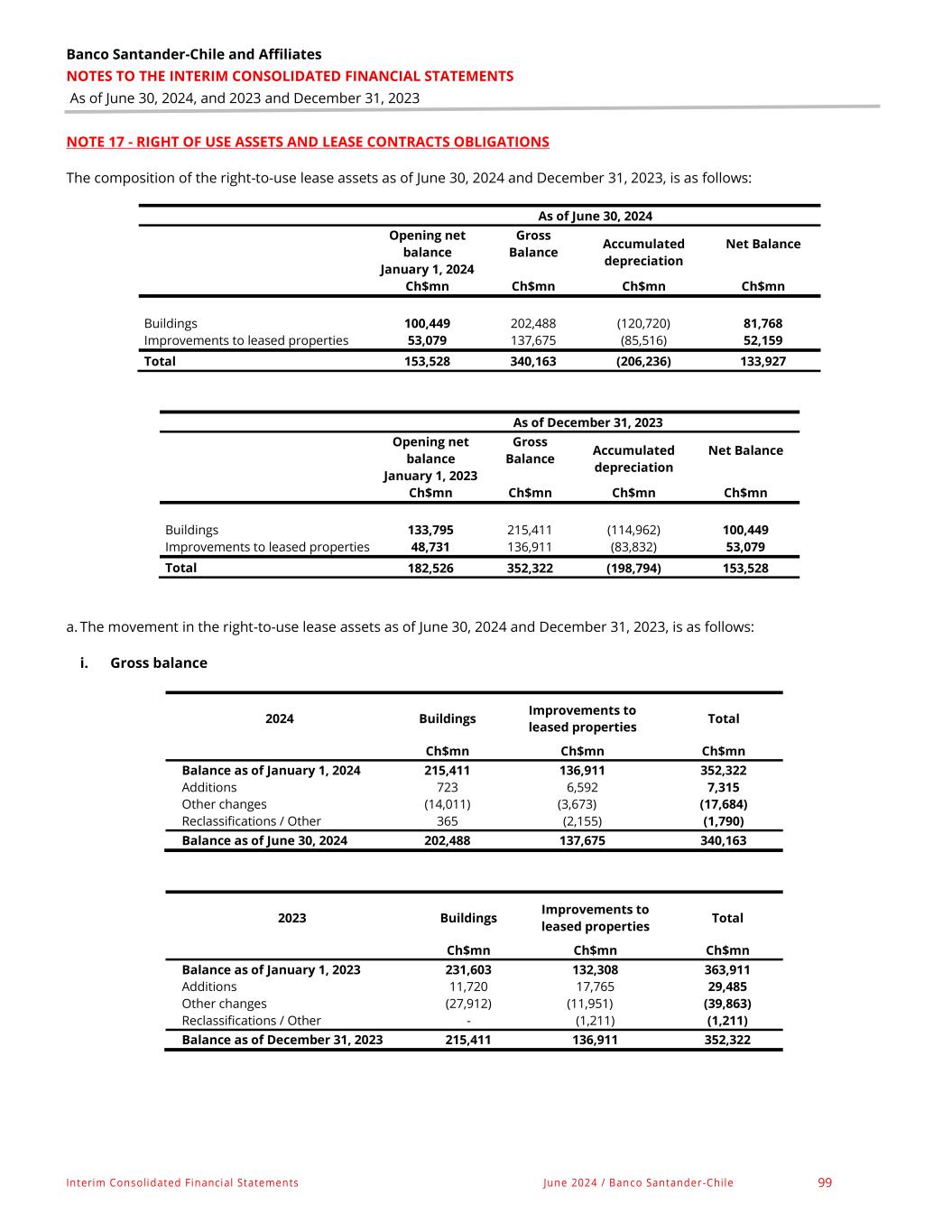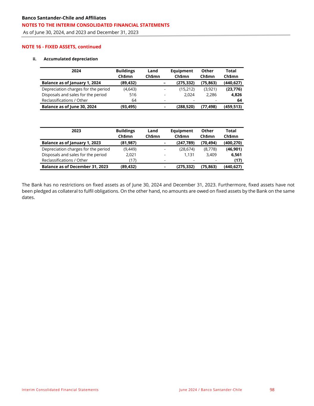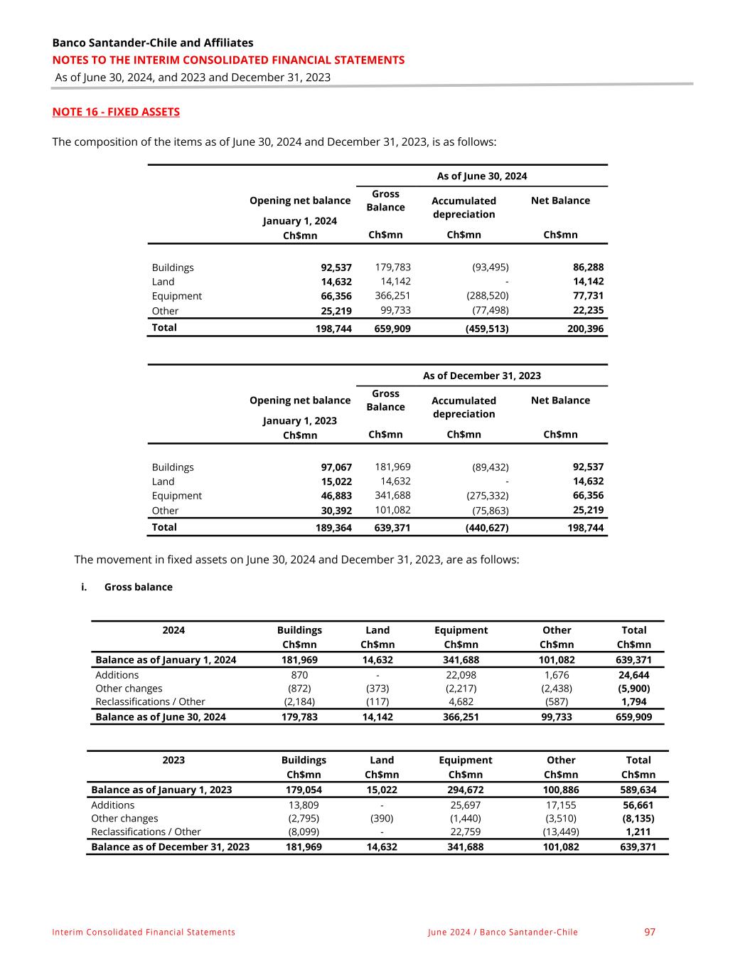 Banco Santander-Chile and Affiliates NOTES TO THE INTERIM CONSOLIDATED FINANCIAL STATEMENTS As of June 30, 2024, and 2023 and December 31, 2023 Interim Consolidated Financial Statements June 2024 / Banco Santander -Chile 97 NOTE 16 - FIXED ASSETS The composition of the items as of June 30, 2024 and December 31, 2023, is as follows: As of June 30, 2024 Opening net balance Gross Balance Accumulated depreciation Net Balance January 1, 2024 Ch$mn Ch$mn Ch$mn Ch$mn Buildings 92,537 179,783 (93,495) 86,288 Land 14,632 14,142 - 14,142 Equipment 66,356 366,251 (288,520) 77,731 Other 25,219 99,733 (77,498) 22,235 Total 198,744 659,909 (459,513) 200,396 As of December 31, 2023 Opening net balance Gross Balance Accumulated depreciation Net Balance January 1, 2023 Ch$mn Ch$mn Ch$mn Ch$mn Buildings 97,067 181,969 (89,432) 92,537 Land 15,022 14,632 - 14,632 Equipment 46,883 341,688 (275,332) 66,356 Other 30,392 101,082 (75,863) 25,219 Total 189,364 639,371 (440,627) 198,744 The movement in fixed assets on June 30, 2024 and December 31, 2023, are as follows: i. Gross balance 2024 Buildings Land Equipment Other Total Ch$mn Ch$mn Ch$mn Ch$mn Ch$mn Balance as of January 1, 2024 181,969 14,632 341,688 101,082 639,371 Additions 870 - 22,098 1,676 24,644 Other changes (872) (373) (2,217) (2,438) (5,900) Reclassifications / Other (2,184) (117) 4,682 (587) 1,794 Balance as of June 30, 2024 179,783 14,142 366,251 99,733 659,909 2023 Buildings Land Equipment Other Total Ch$mn Ch$mn Ch$mn Ch$mn Ch$mn Balance as of January 1, 2023 179,054 15,022 294,672 100,886 589,634 Additions 13,809 - 25,697 17,155 56,661 Other changes (2,795) (390) (1,440) (3,510) (8,135) Reclassifications / Other (8,099) - 22,759 (13,449) 1,211 Balance as of December 31, 2023 181,969 14,632 341,688 101,082 639,371