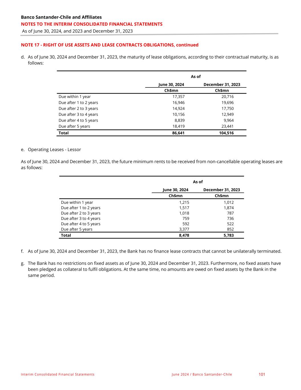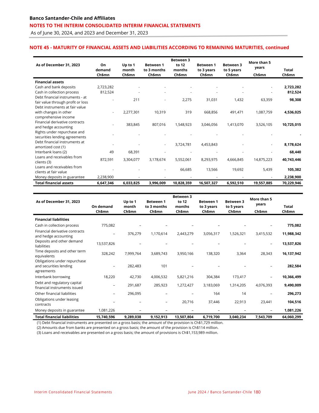 Banco Santander-Chile and Affiliates NOTES TO THE INTERIM CONSOLIDATED INTERIM FINANCIAL STATEMENTS As of June 30, 2024, and 2023 and December 31, 2023 Interim Consolidated Financial Statements June 2024 / Banco Santander -Chile 180 NOTE 45 - MATURITY OF FINANCIAL ASSETS AND LIABILITIES ACCORDING TO REMAINING MATURITIES, continued As of December 31, 2023 On demand Up to 1 month Between 1 to 3 months Between 3 to 12 months Between 1 to 3 years Between 3 to 5 years More than 5 years Total Ch$mn Ch$mn Ch$mn Ch$mn Ch$mn Ch$mn Ch$mn Ch$mn Financial assets Cash and bank deposits 2,723,282 - - - - - - 2,723,282 Cash in collection process 812,524 - - - - - - 812,524 Debt financial instruments - at fair value through profit or loss - 211 - 2,275 31,031 1,432 63,359 98,308 Debt instruments at fair value with changes in other comprehensive income - 2,277,301 10,319 319 668,856 491,471 1,087,759 4,536,025 Financial derivative contracts and hedge accounting - 383,845 807,016 1,548,923 3,046,056 1,413,070 3,526,105 10,725,015 Rights under repurchase and securities lending agreements - - - - - - - - Debt financial instruments at amortized cost (1) - - - 3,724,781 4,453,843 - - 8,178,624 Interbank loans (2) 49 68,391 - - - - - 68,440 Loans and receivables from clients (3) 872,591 3,304,077 3,178,674 5,552,061 8,293,975 4,666,845 14,875,223 40,743,446 Loans and receivables from clients at fair value - - - 66,685 13,566 19,692 5,439 105,382 Money deposits in guarantee 2,238,900 - - - - - - 2,238,900 Total financial assets 6,647,346 6,033,825 3,996,009 10,828,359 16,507,327 6,592,510 19,557,885 70,229,946 As of December 31, 2023 On demand Up to 1 month Between 1 to 3 months Between 3 to 12 months Between 1 to 3 years Between 3 to 5 years More than 5 years Total Ch$mn Ch$mn Ch$mn Ch$mn Ch$mn Ch$mn Ch$mn Ch$mn Financial liabilities Cash in collection process 775,082 – – – – – – 775,082 Financial derivative contracts and hedge accounting – 376,279 1,170,614 2,443,279 3,056,317 1,526,321 3,415,532 11,988,342 Deposits and other demand liabilities 13,537,826 – – – – – – 13,537,826 Time deposits and other term equivalents 328,242 7,999,764 3,689,743 3,950,166 138,320 3,364 28,343 16,137,942 Obligations under repurchase and securities lending agreements – 282,483 101 – – – – 282,584 Interbank borrowing 18,220 42,730 4,006,532 5,821,216 304,384 173,417 – 10,366,499 Debt and regulatory capital financial instruments issued – 291,687 285,923 1,272,427 3,183,069 1,314,205 4,076,393 9,490,009 Other financial liabilities – 296,095 – – 164 14 – 296,273 Obligations under leasing contracts – – – 20,716 37,446 22,913 23,441 104,516 Money deposits in guarantee 1,081,226 – – – – – – 1,081,226 Total financial liabilities 15,740,596 9,289,038 9,152,913 13,507,804 6,719,700 3,040,234 7,543,709 64,060,299 (1) Debt financial instruments are presented on a gross basis; the amount of the provision is Ch$1,729 million. (2) Amounts due from banks are presented on a gross basis; the amount of the provision is Ch$114 million. (3) Loans and receivables are presented on a gross basis; the amount of provisions is Ch$1,153,989 million.