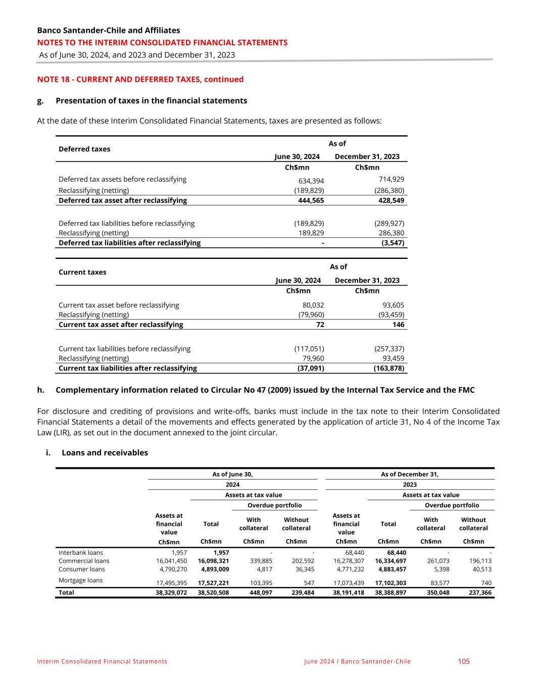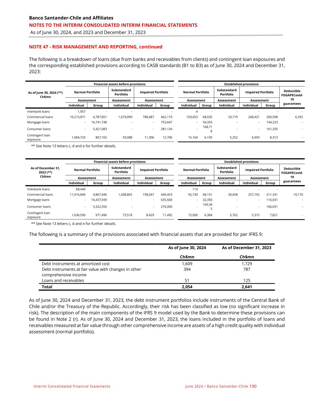 Banco Santander-Chile and Affiliates NOTES TO THE INTERIM CONSOLIDATED INTERIM FINANCIAL STATEMENTS As of June 30, 2024, and 2023 and December 31, 2023 Interim Consolidated Financial Statements June 2024 / Banco Santander -Chile 190 NOTE 47 - RISK MANAGEMENT AND REPORTING, continued The following is a breakdown of loans (due from banks and receivables from clients) and contingent loan exposures and the corresponding established provisions according to CASB standards (B1 to B3) as of June 30, 2024 and December 31, 2023: As of June 30, 2024 (**) Ch$mn Financial assets before provisions Established provisions Normal Portfolio Substandard Portfolio Impaired Portfolio Normal Portfolio Substandard Portfolio Impaired Portfolio Deductible FOGAPECovid- 19 guarantees Assessment Assessment Assessment Assessment Assessment Assessment Individual Group Individual Individual Group Individual Group Individual Individual Group Interbank loans 1,957 - - - - 4 - - - - - Commercial loans 10,213,871 4,787,851 1,074,999 788,487 462,119 103,653 68,035 33,719 268,421 200,598 6,392 Mortgage loans - 16,741,748 - - 753,647 - 34,355 - - 144,223 - Consumer loans - 5,421,083 - - 281,134 - 168,71 8 - - 161,335 - Contingent loan exposure 1,684,725 867,102 93,088 11,306 12,706 15,164 6,195 5,252 6,050 8,313 - ** See Note 13 letters c, d and e for further details. As of December 31, 2023 (**) Ch$mn Financial assets before provisions Established provisions Normal Portfolio Substandard Portfolio Impaired Portfolio Normal Portfolio Substandard Portfolio Impaired Portfolio Deductible FOGAPECovid- 19 guarantees Assessment Assessment Assessment Assessment Assessment Assessment Individual Group Individual Individual Group Individual Group Individual Individual Group Interbank loans 68,440 - - - - 114 - - - - - Commercial loans 11,016,846 4,867,446 1,008,865 738,047 440,453 92,730 68,151 30,658 257,192 211,331 10,170 Mortgage loans - 16,437,939 - - 635,500 - 32,350 - - 116,031 - Consumer loans - 5,322,350 - - 276,000 - 169,34 5 - - 166,031 - Contingent loan exposure 1,636,590 971,496 73,518 8,429 11,492 15,000 6,384 5,762 5,315 7,821 - ** See Note 13 letters c, d and e for further details. The following is a summary of the provisions associated with financial assets that are provided for per IFRS 9: As of June 30, 2024 As of December 31, 2023 Ch$mn Ch$mn Debt instruments at amortized cost 1,609 1,729 Debt instruments at fair value with changes in other comprehensive income 394 787 Loans and receivables 51 125 Total 2,054 2,641 As of June 30, 2024 and December 31, 2023, the debt instrument portfolios include instruments of the Central Bank of Chile and/or the Treasury of the Republic. Accordingly, their risk has been classified as low (no significant increase in risk). The description of the main components of the IFRS 9 model used by the Bank to determine these provisions can be found in Note 2 (r). As of June 30, 2024 and December 31, 2023, the loans included in the portfolio of loans and receivables measured at fair value through other comprehensive income are assets of a high credit quality with individual assessment (normal portfolio).