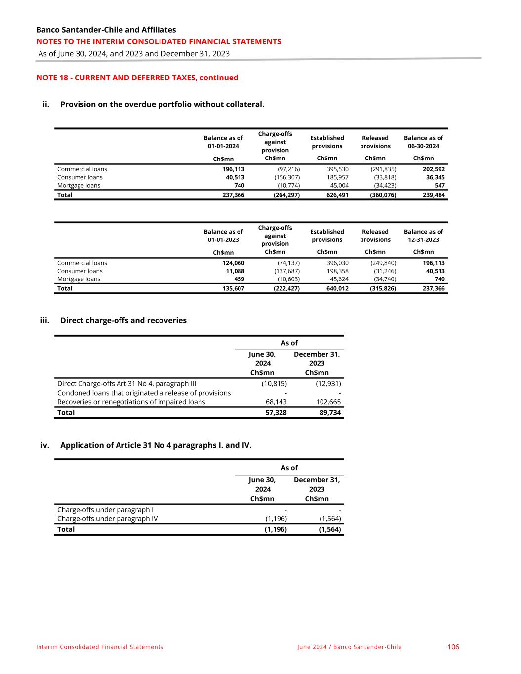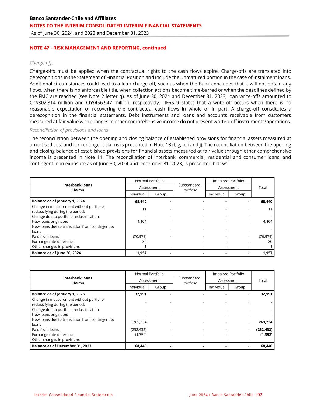 Banco Santander-Chile and Affiliates NOTES TO THE INTERIM CONSOLIDATED INTERIM FINANCIAL STATEMENTS As of June 30, 2024, and 2023 and December 31, 2023 Interim Consolidated Financial Statements June 2024 / Banco Santander -Chile 192 NOTE 47 - RISK MANAGEMENT AND REPORTING, continued Charge-offs Charge-offs must be applied when the contractual rights to the cash flows expire. Charge-offs are translated into derecognitions in the Statement of Financial Position and include the unmatured portion in the case of instalment loans. Additional circumstances could lead to a loan charge-off, such as when the Bank concludes that it will not obtain any flows, when there is no enforceable title, when collection actions become time-barred or when the deadlines defined by the FMC are reached (see Note 2 letter q). As of June 30, 2024 and December 31, 2023, loan write-offs amounted to Ch$302,814 million and Ch$456,947 million, respectively. IFRS 9 states that a write-off occurs when there is no reasonable expectation of recovering the contractual cash flows in whole or in part. A charge-off constitutes a derecognition in the financial statements. Debt instruments and loans and accounts receivable from customers measured at fair value with changes in other comprehensive income do not present written-off instruments/operations. Reconciliation of provisions and loans The reconciliation between the opening and closing balance of established provisions for financial assets measured at amortised cost and for contingent claims is presented in Note 13 (f, g, h, i and j). The reconciliation between the opening and closing balance of established provisions for financial assets measured at fair value through other comprehensive income is presented in Note 11. The reconciliation of interbank, commercial, residential and consumer loans, and contingent loan exposure as of June 30, 2024 and December 31, 2023, is presented below: Interbank loans Ch$mn Normal Portfolio Substandard Portfolio Impaired Portfolio Total Assessment Assessment Individual Group Individual Group Balance as of January 1, 2024 68,440 - - - - 68,440 Change in measurement without portfolio reclassifying during the period: 11 - - - - 11 Change due to portfolio reclassification: - - - - - - New loans originated 4,404 - - - - 4,404 New loans due to translation from contingent to loans - - - - - - Paid from loans (70,979) - - - - (70,979) Exchange rate difference 80 - - - - 80 Other changes in provisions 1 - - - - 1 Balance as of June 30, 2024 1,957 - - - - 1,957 Interbank loans Ch$mn Normal Portfolio Substandard Portfolio Impaired Portfolio Total Assessment Assessment Individual Group Individual Group Balance as of January 1, 2023 32,991 - - - - 32,991 Change in measurement without portfolio reclassifying during the period: - - - - - - Change due to portfolio reclassification: - - - - - - New loans originated - - - - - - New loans due to translation from contingent to loans 269,234 - - - - 269,234 Paid from loans (232,433) - - - - (232,433) Exchange rate difference (1,352) - - - - (1,352) Other changes in provisions - - - - - - Balance as of December 31, 2023 68,440 - - - - 68,440