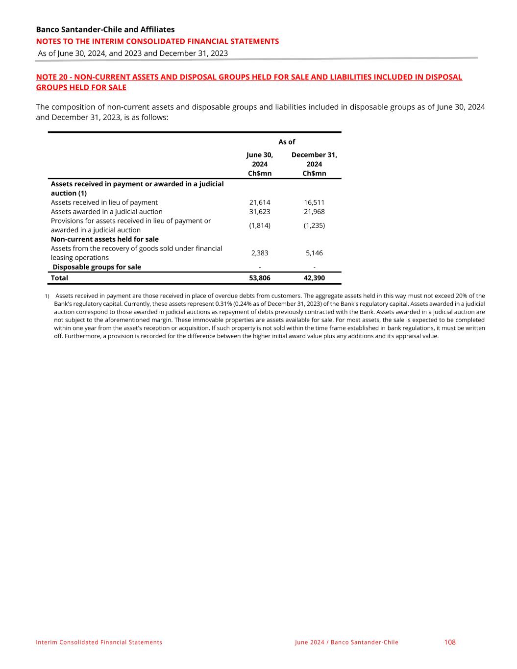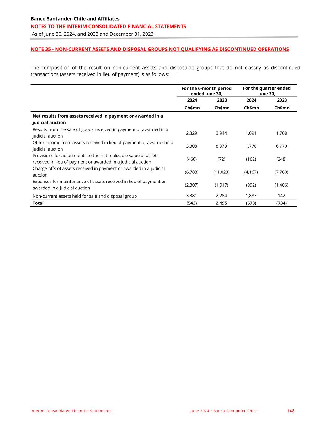 Banco Santander-Chile and Affiliates NOTES TO THE INTERIM CONSOLIDATED FINANCIAL STATEMENTS As of June 30, 2024, and 2023 and December 31, 2023 Interim Consolidated Financial Statements June 2024 / Banco Santander-Chile 148 NOTE 35 - NON-CURRENT ASSETS AND DISPOSAL GROUPS NOT QUALIFYING AS DISCONTINUED OPERATIONS The composition of the result on non-current assets and disposable groups that do not classify as discontinued transactions (assets received in lieu of payment) is as follows: For the 6-month period ended June 30, For the quarter ended June 30, 2024 2023 2024 2023 Ch$mn Ch$mn Ch$mn Ch$mn Net results from assets received in payment or awarded in a judicial auction Results from the sale of goods received in payment or awarded in a judicial auction 2,329 3,944 1,091 1,768 Other income from assets received in lieu of payment or awarded in a judicial auction 3,308 8,979 1,770 6,770 Provisions for adjustments to the net realizable value of assets received in lieu of payment or awarded in a judicial auction (466) (72) (162) (248) Charge-offs of assets received in payment or awarded in a judicial auction (6,788) (11,023) (4,167) (7,760) Expenses for maintenance of assets received in lieu of payment or awarded in a judicial auction (2,307) (1,917) (992) (1,406) Non-current assets held for sale and disposal group 3,381 2,284 1,887 142 Total (543) 2,195 (573) (734)
