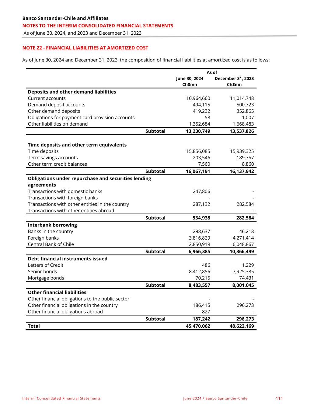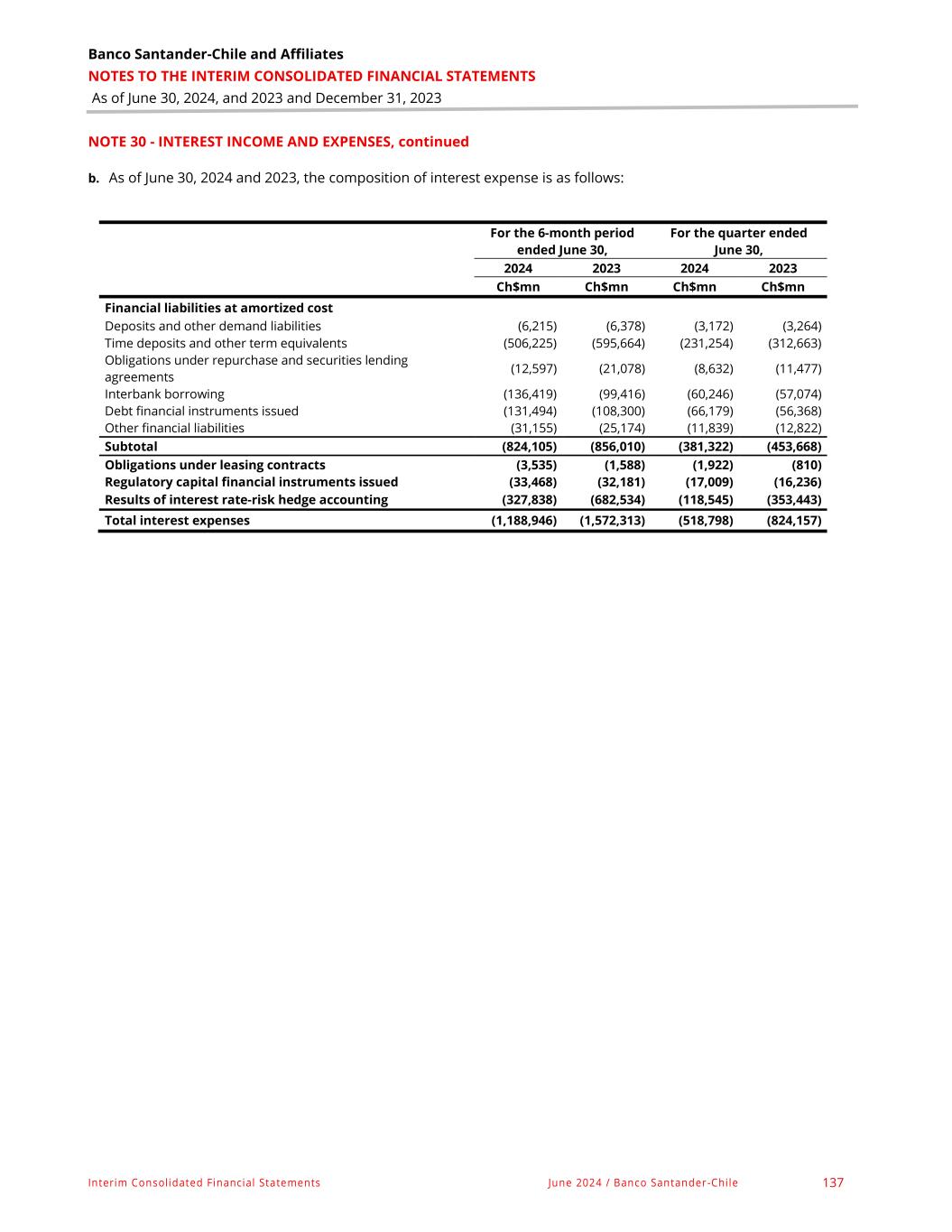 Banco Santander-Chile and Affiliates NOTES TO THE INTERIM CONSOLIDATED FINANCIAL STATEMENTS As of June 30, 2024, and 2023 and December 31, 2023 Interim Consolidated Financial Statements June 2024 / Banco Santander-Chile 137 NOTE 30 - INTEREST INCOME AND EXPENSES, continued b. As of June 30, 2024 and 2023, the composition of interest expense is as follows: For the 6-month period ended June 30, For the quarter ended June 30, 2024 2023 2024 2023 Ch$mn Ch$mn Ch$mn Ch$mn Financial liabilities at amortized cost Deposits and other demand liabilities (6,215) (6,378) (3,172) (3,264) Time deposits and other term equivalents (506,225) (595,664) (231,254) (312,663) Obligations under repurchase and securities lending agreements (12,597) (21,078) (8,632) (11,477) Interbank borrowing (136,419) (99,416) (60,246) (57,074) Debt financial instruments issued (131,494) (108,300) (66,179) (56,368) Other financial liabilities (31,155) (25,174) (11,839) (12,822) Subtotal (824,105) (856,010) (381,322) (453,668) Obligations under leasing contracts (3,535) (1,588) (1,922) (810) Regulatory capital financial instruments issued (33,468) (32,181) (17,009) (16,236) Results of interest rate-risk hedge accounting (327,838) (682,534) (118,545) (353,443) Total interest expenses (1,188,946) (1,572,313) (518,798) (824,157)