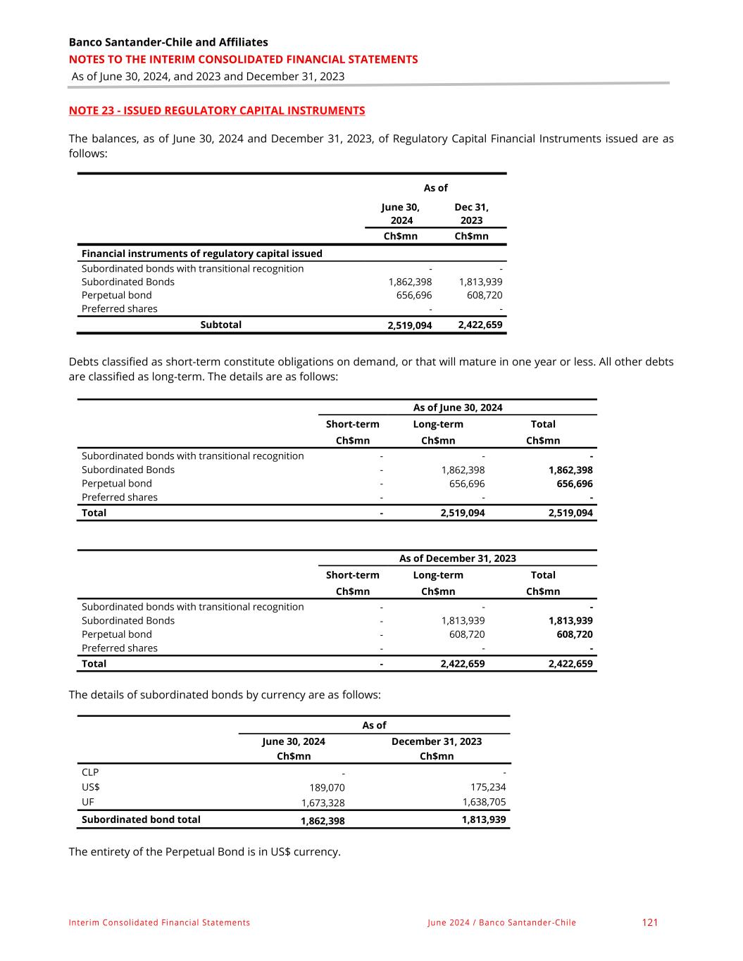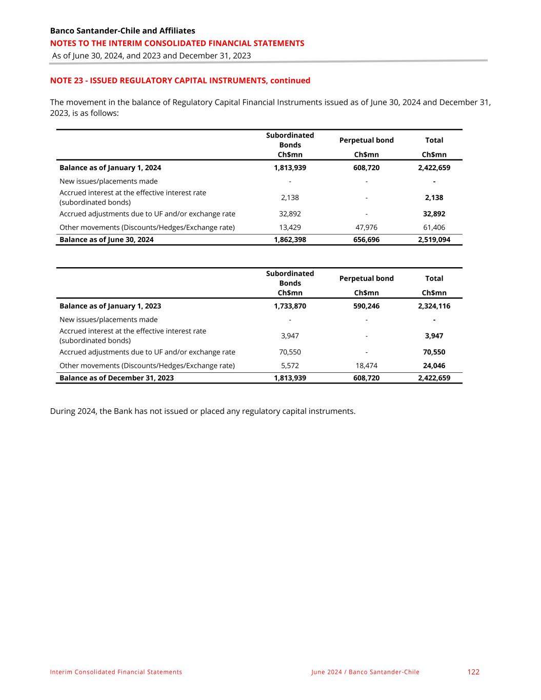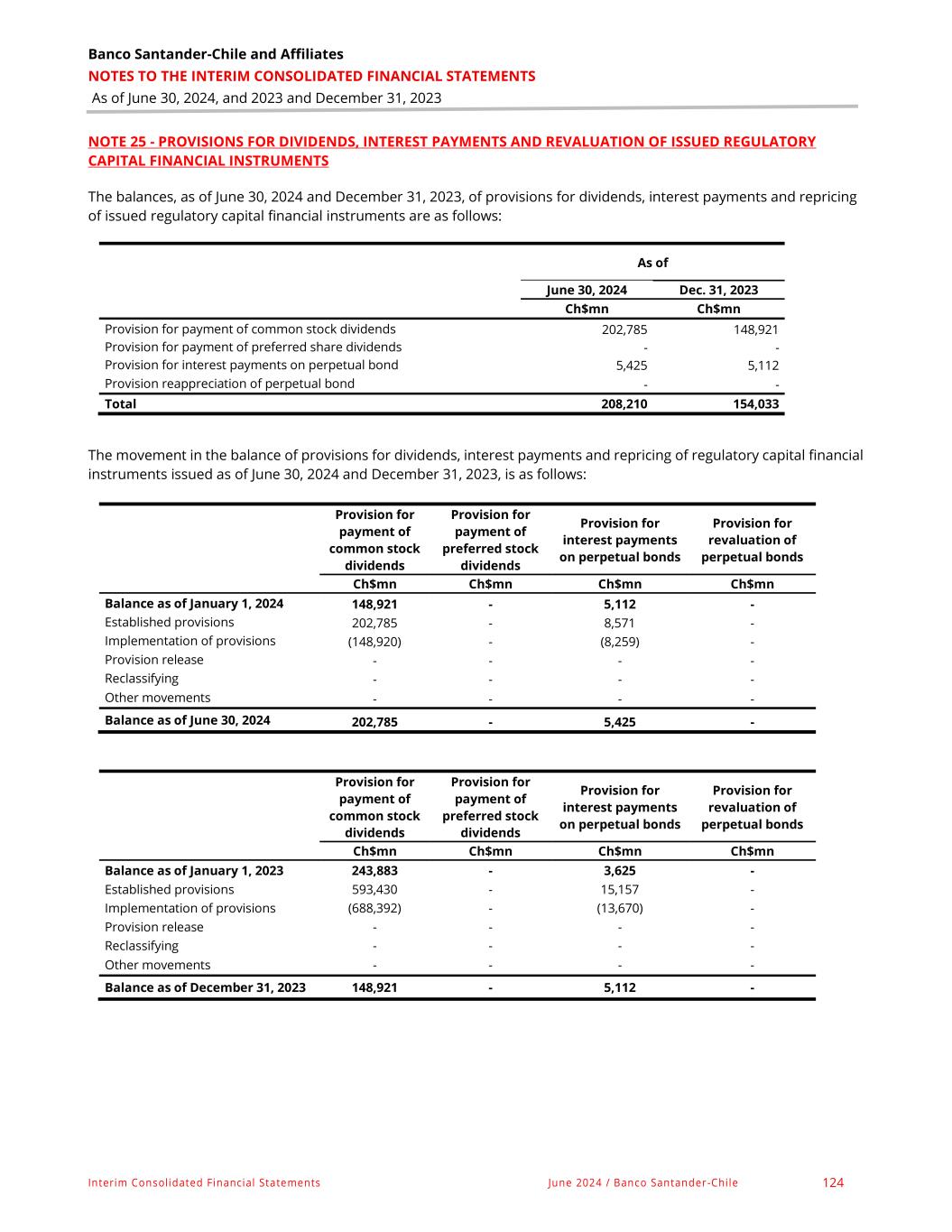 Banco Santander-Chile and Affiliates NOTES TO THE INTERIM CONSOLIDATED FINANCIAL STATEMENTS As of June 30, 2024, and 2023 and December 31, 2023 Interim Consolidated Financial Statements June 2024 / Banco Santander-Chile 124 NOTE 25 - PROVISIONS FOR DIVIDENDS, INTEREST PAYMENTS AND REVALUATION OF ISSUED REGULATORY CAPITAL FINANCIAL INSTRUMENTS The balances, as of June 30, 2024 and December 31, 2023, of provisions for dividends, interest payments and repricing of issued regulatory capital financial instruments are as follows: As of June 30, 2024 Dec. 31, 2023 Ch$mn Ch$mn Provision for payment of common stock dividends 202,785 148,921 Provision for payment of preferred share dividends - - Provision for interest payments on perpetual bond 5,425 5,112 Provision reappreciation of perpetual bond - - Total 208,210 154,033 The movement in the balance of provisions for dividends, interest payments and repricing of regulatory capital financial instruments issued as of June 30, 2024 and December 31, 2023, is as follows: Provision for payment of common stock dividends Provision for payment of preferred stock dividends Provision for interest payments on perpetual bonds Provision for revaluation of perpetual bonds Ch$mn Ch$mn Ch$mn Ch$mn Balance as of January 1, 2024 148,921 - 5,112 - Established provisions 202,785 - 8,571 - Implementation of provisions (148,920) - (8,259) - Provision release - - - - Reclassifying - - - - Other movements - - - - Balance as of June 30, 2024 202,785 - 5,425 - Provision for payment of common stock dividends Provision for payment of preferred stock dividends Provision for interest payments on perpetual bonds Provision for revaluation of perpetual bonds Ch$mn Ch$mn Ch$mn Ch$mn Balance as of January 1, 2023 243,883 - 3,625 - Established provisions 593,430 - 15,157 - Implementation of provisions (688,392) - (13,670) - Provision release - - - - Reclassifying - - - - Other movements - - - - Balance as of December 31, 2023 148,921 - 5,112 -