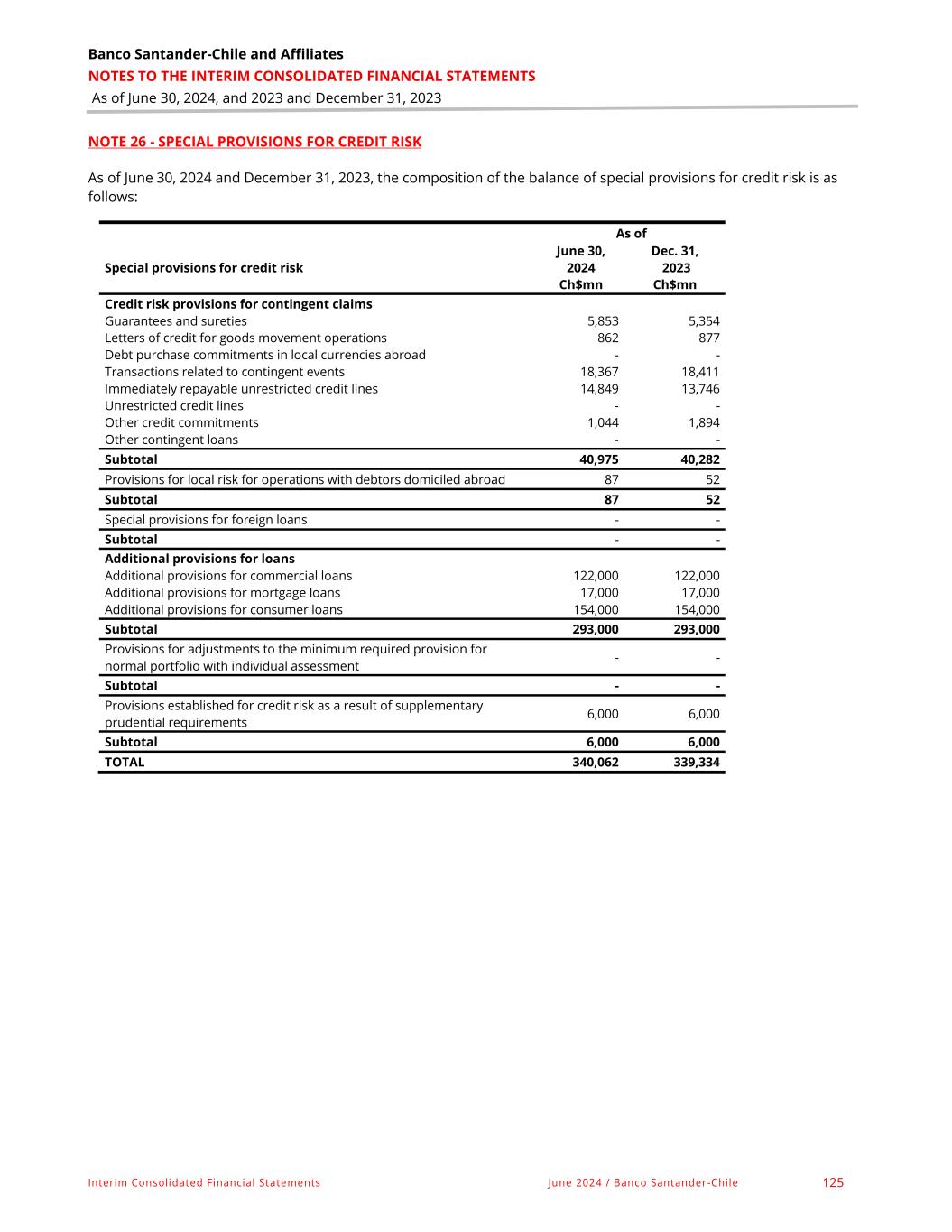 Banco Santander-Chile and Affiliates NOTES TO THE INTERIM CONSOLIDATED FINANCIAL STATEMENTS As of June 30, 2024, and 2023 and December 31, 2023 Interim Consolidated Financial Statements June 2024 / Banco Santander-Chile 125 NOTE 26 - SPECIAL PROVISIONS FOR CREDIT RISK As of June 30, 2024 and December 31, 2023, the composition of the balance of special provisions for credit risk is as follows: As of Special provisions for credit risk June 30, 2024 Dec. 31, 2023 Ch$mn Ch$mn Credit risk provisions for contingent claims Guarantees and sureties 5,853 5,354 Letters of credit for goods movement operations 862 877 Debt purchase commitments in local currencies abroad - - Transactions related to contingent events 18,367 18,411 Immediately repayable unrestricted credit lines 14,849 13,746 Unrestricted credit lines - - Other credit commitments 1,044 1,894 Other contingent loans - - Subtotal 40,975 40,282 Provisions for local risk for operations with debtors domiciled abroad 87 52 Subtotal 87 52 Special provisions for foreign loans - - Subtotal - - Additional provisions for loans Additional provisions for commercial loans 122,000 122,000 Additional provisions for mortgage loans 17,000 17,000 Additional provisions for consumer loans 154,000 154,000 Subtotal 293,000 293,000 Provisions for adjustments to the minimum required provision for normal portfolio with individual assessment - - Subtotal - - Provisions established for credit risk as a result of supplementary prudential requirements 6,000 6,000 Subtotal 6,000 6,000 TOTAL 340,062 339,334