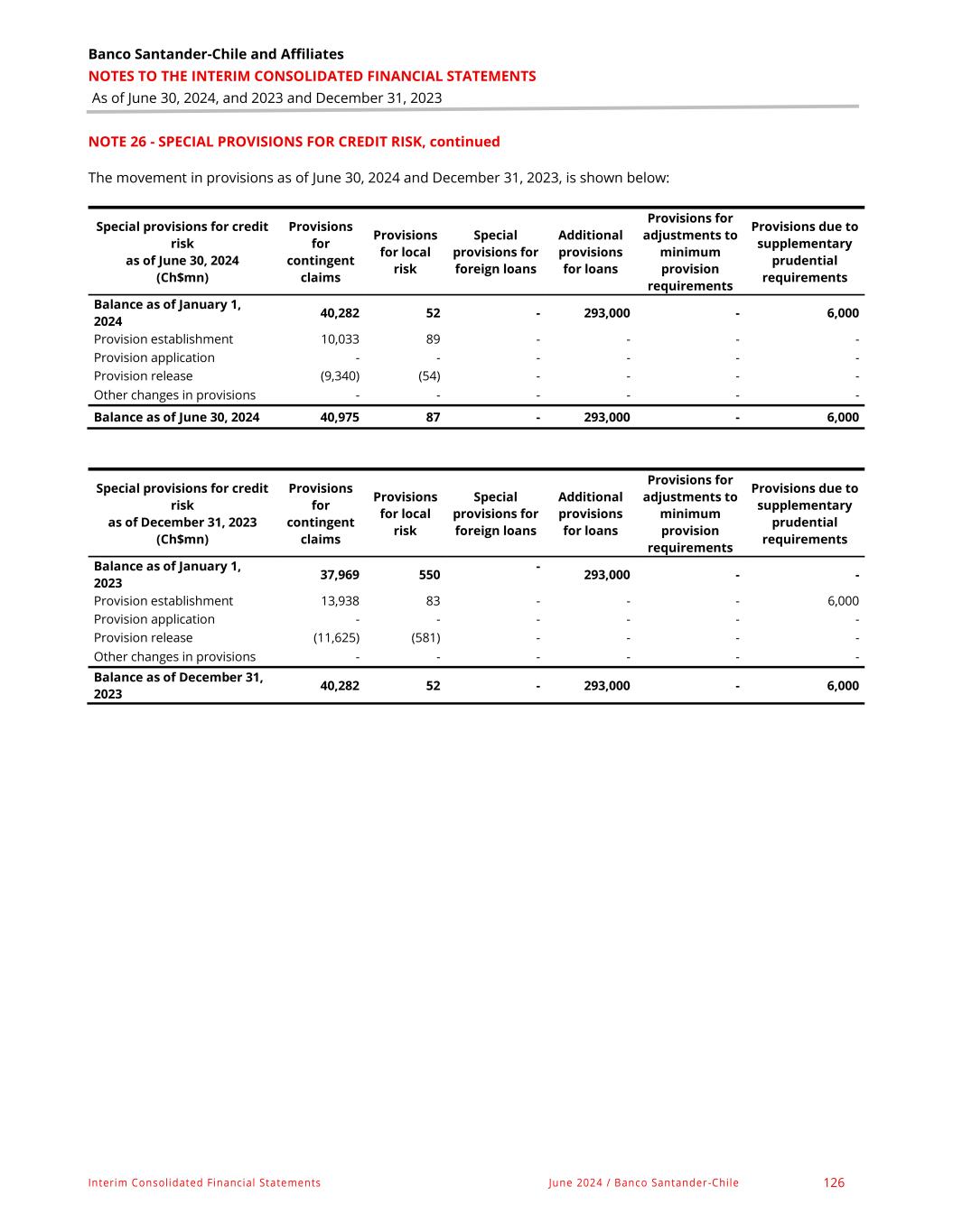 Banco Santander-Chile and Affiliates NOTES TO THE INTERIM CONSOLIDATED FINANCIAL STATEMENTS As of June 30, 2024, and 2023 and December 31, 2023 Interim Consolidated Financial Statements June 2024 / Banco Santander-Chile 126 NOTE 26 - SPECIAL PROVISIONS FOR CREDIT RISK, continued The movement in provisions as of June 30, 2024 and December 31, 2023, is shown below: Special provisions for credit risk as of June 30, 2024 (Ch$mn) Provisions for contingent claims Provisions for local risk Special provisions for foreign loans Additional provisions for loans Provisions for adjustments to minimum provision requirements Provisions due to supplementary prudential requirements Balance as of January 1, 2024 40,282 52 - 293,000 - 6,000 Provision establishment 10,033 89 - - - - Provision application - - - - - - Provision release (9,340) (54) - - - - Other changes in provisions - - - - - - Balance as of June 30, 2024 40,975 87 - 293,000 - 6,000 Special provisions for credit risk as of December 31, 2023 (Ch$mn) Provisions for contingent claims Provisions for local risk Special provisions for foreign loans Additional provisions for loans Provisions for adjustments to minimum provision requirements Provisions due to supplementary prudential requirements Balance as of January 1, 2023 37,969 550 - 293,000 - - Provision establishment 13,938 83 - - - 6,000 Provision application - - - - - - Provision release (11,625) (581) - - - - Other changes in provisions - - - - - - Balance as of December 31, 2023 40,282 52 - 293,000 - 6,000