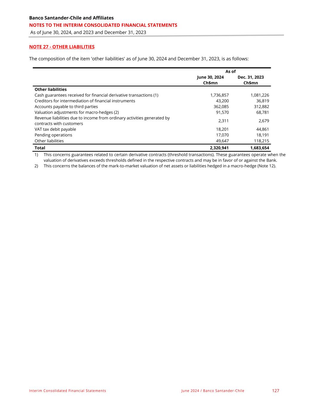 Banco Santander-Chile and Affiliates NOTES TO THE INTERIM CONSOLIDATED FINANCIAL STATEMENTS As of June 30, 2024, and 2023 and December 31, 2023 Interim Consolidated Financial Statements June 2024 / Banco Santander-Chile 127 NOTE 27 - OTHER LIABILITIES The composition of the item 'other liabilities' as of June 30, 2024 and December 31, 2023, is as follows: As of June 30, 2024 Dec. 31, 2023 Ch$mn Ch$mn Other liabilities Cash guarantees received for financial derivative transactions (1) 1,736,857 1,081,226 Creditors for intermediation of financial instruments 43,200 36,819 Accounts payable to third parties 362,085 312,882 Valuation adjustments for macro-hedges (2) 91,570 68,781 Revenue liabilities due to income from ordinary activities generated by contracts with customers 2,311 2,679 VAT tax debit payable 18,201 44,861 Pending operations 17,070 18,191 Other liabilities 49,647 118,215 Total 2,320,941 1,683,654 1) This concerns guarantees related to certain derivative contracts (threshold transactions). These guarantees operate when the valuation of derivatives exceeds thresholds defined in the respective contracts and may be in favor of or against the Bank. 2) This concerns the balances of the mark-to-market valuation of net assets or liabilities hedged in a macro-hedge (Note 12).