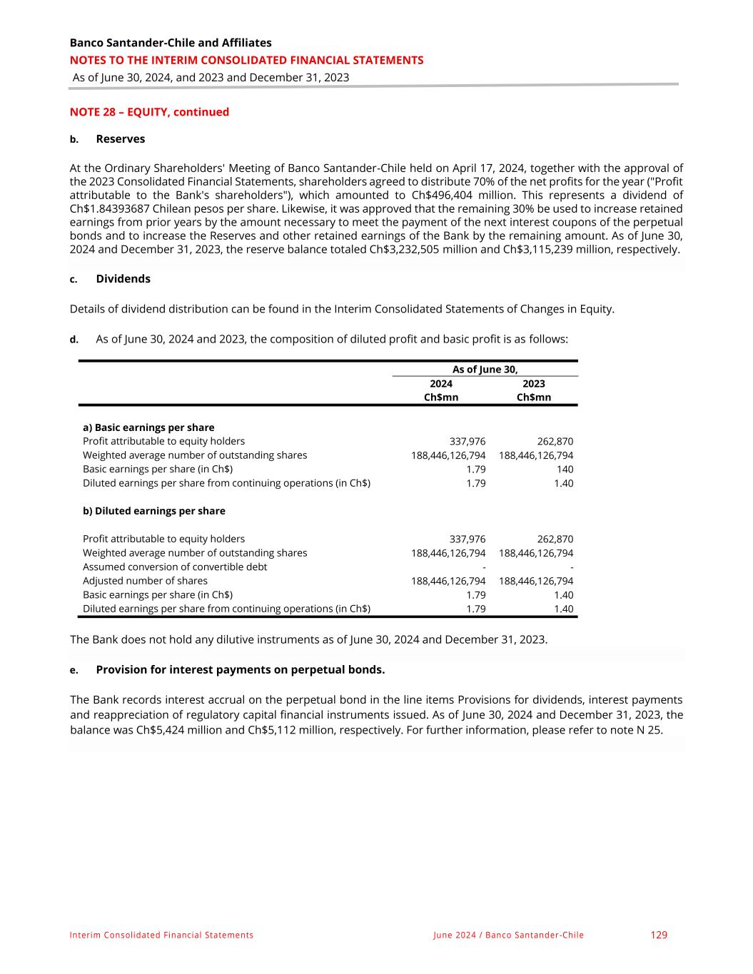Banco Santander-Chile and Affiliates NOTES TO THE INTERIM CONSOLIDATED FINANCIAL STATEMENTS As of June 30, 2024, and 2023 and December 31, 2023 Interim Consolidated Financial Statements June 2024 / Banco Santander-Chile 129 NOTE 28 – EQUITY, continued b. Reserves At the Ordinary Shareholders' Meeting of Banco Santander-Chile held on April 17, 2024, together with the approval of the 2023 Consolidated Financial Statements, shareholders agreed to distribute 70% of the net profits for the year ("Profit attributable to the Bank's shareholders"), which amounted to Ch$496,404 million. This represents a dividend of Ch$1.84393687 Chilean pesos per share. Likewise, it was approved that the remaining 30% be used to increase retained earnings from prior years by the amount necessary to meet the payment of the next interest coupons of the perpetual bonds and to increase the Reserves and other retained earnings of the Bank by the remaining amount. As of June 30, 2024 and December 31, 2023, the reserve balance totaled Ch$3,232,505 million and Ch$3,115,239 million, respectively. c. Dividends Details of dividend distribution can be found in the Interim Consolidated Statements of Changes in Equity. d. As of June 30, 2024 and 2023, the composition of diluted profit and basic profit is as follows: As of June 30, 2024 2023 Ch$mn Ch$mn a) Basic earnings per share Profit attributable to equity holders 337,976 262,870 Weighted average number of outstanding shares 188,446,126,794 188,446,126,794 Basic earnings per share (in Ch$) 1.79 140 Diluted earnings per share from continuing operations (in Ch$) 1.79 1.40 b) Diluted earnings per share Profit attributable to equity holders 337,976 262,870 Weighted average number of outstanding shares 188,446,126,794 188,446,126,794 Assumed conversion of convertible debt - - Adjusted number of shares 188,446,126,794 188,446,126,794 Basic earnings per share (in Ch$) 1.79 1.40 Diluted earnings per share from continuing operations (in Ch$) 1.79 1.40 The Bank does not hold any dilutive instruments as of June 30, 2024 and December 31, 2023. e. Provision for interest payments on perpetual bonds. The Bank records interest accrual on the perpetual bond in the line items Provisions for dividends, interest payments and reappreciation of regulatory capital financial instruments issued. As of June 30, 2024 and December 31, 2023, the balance was Ch$5,424 million and Ch$5,112 million, respectively. For further information, please refer to note N 25.