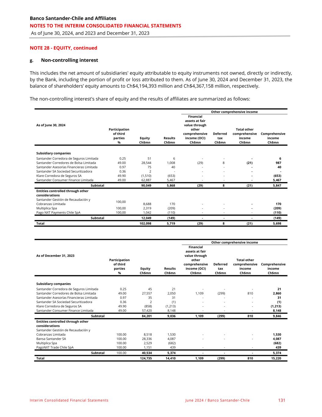 Banco Santander-Chile and Affiliates NOTES TO THE INTERIM CONSOLIDATED FINANCIAL STATEMENTS As of June 30, 2024, and 2023 and December 31, 2023 Interim Consolidated Financial Statements June 2024 / Banco Santander-Chile 131 NOTE 28 - EQUITY, continued g. Non-controlling interest This includes the net amount of subsidiaries' equity attributable to equity instruments not owned, directly or indirectly, by the Bank, including the portion of profit or loss attributed to them. As of June 30, 2024 and December 31, 2023, the balance of shareholders’ equity amounts to Ch$4,194,393 million and Ch$4,367,158 million, respectively. The non-controlling interest's share of equity and the results of affiliates are summarized as follows: Other comprehensive income As of June 30, 2024 Participation of third parties Equity Results Financial assets at fair value through other comprehensive income (OCI) Deferred tax Total other comprehensive income Comprehensive income % Ch$mn Ch$mn Ch$mn Ch$mn Ch$mn Ch$mn Subsidiary companies Santander Corredora de Seguros Limitada 0.25 51 6 - - - 6 Santander Corredores de Bolsa Limitada 49.00 28,544 1,008 (29) 8 (21) 987 Santander Asesorías Financieras Limitada 0.97 75 40 - - - 40 Santander SA Sociedad Securitizadora 0.36 2 - - - - - Klare Corredora de Seguros SA 49.90 (1,510) (653) - - - (653) Santander Consumer Finance Limitada 49.00 62,887 5,467 - - - 5,467 Subtotal 90,049 5,868 (29) 8 (21) 5,847 Entities controlled through other considerations Santander Gestión de Recaudación y Cobranzas Limitada 100,00 8,688 170 - - - 170 Multiplica Spa 100,00 2,319 (209) - - - (209) Pago NXT Payments Chile SpA 100,00 1,042 (110) - - - (110) Subtotal 12,049 (149) - - - (149) Total 102,098 5,719 (29) 8 (21) 5,698 Other comprehensive income As of December 31, 2023 Participation of third parties Equity Results Financial assets at fair value through other comprehensive income (OCI) Deferred tax Total other comprehensive income Comprehensive income % Ch$mn Ch$mn Ch$mn Ch$mn Ch$mn Ch$mn Subsidiary companies Santander Corredora de Seguros Limitada 0.25 45 21 - - - 21 Santander Corredores de Bolsa Limitada 49.00 27,557 2,050 1,109 (299) 810 2,860 Santander Asesorías Financieras Limitada 0.97 35 31 - - - 31 Santander SA Sociedad Securitizadora 0.36 2 (1) - - - (1) Klare Corredora de Seguros SA 49.90 (858) (1,213) - - - (1,213) Santander Consumer Finance Limitada 49.00 57,420 8,148 - - - 8,148 Subtotal 84,201 9,036 1,109 (299) 810 9,846 Entities controlled through other considerations Santander Gestión de Recaudación y Cobranzas Limitada 100.00 8,518 1,530 - - - 1,530 Bansa Santander SA 100.00 28,336 4,087 - - - 4,087 Multiplica Spa 100.00 2,529 (682) (682) PagoNXT Trade Chile SpA 100.00 1,151 439 - - - 439 Subtotal 100.00 40,534 5,374 - - - 5,374 Total 124,735 14,410 1,109 (299) 810 15,220