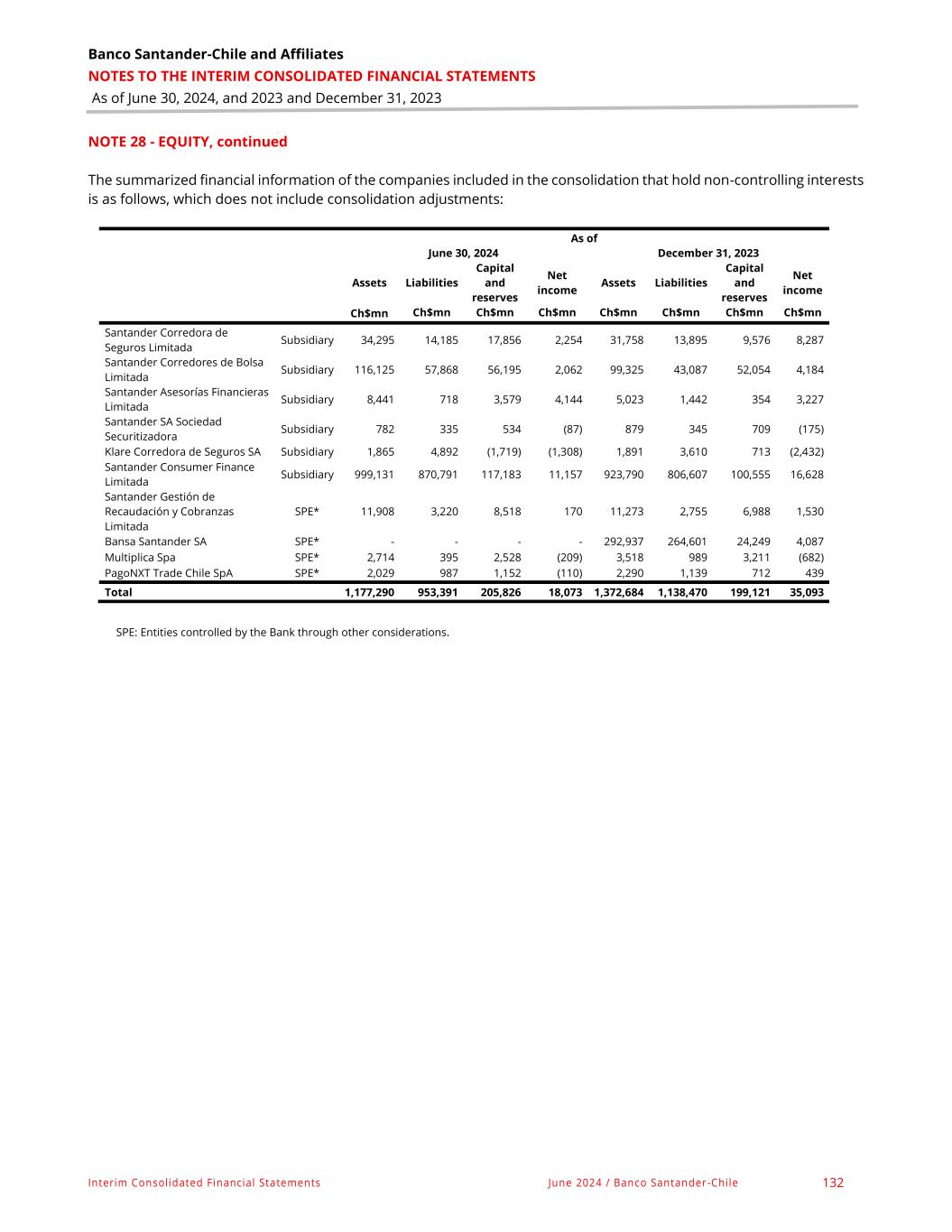 Banco Santander-Chile and Affiliates NOTES TO THE INTERIM CONSOLIDATED FINANCIAL STATEMENTS As of June 30, 2024, and 2023 and December 31, 2023 Interim Consolidated Financial Statements June 2024 / Banco Santander-Chile 132 NOTE 28 - EQUITY, continued The summarized financial information of the companies included in the consolidation that hold non-controlling interests is as follows, which does not include consolidation adjustments: As of June 30, 2024 December 31, 2023 Assets Liabilities Capital and reserves Net income Assets Liabilities Capital and reserves Net income Ch$mn Ch$mn Ch$mn Ch$mn Ch$mn Ch$mn Ch$mn Ch$mn Santander Corredora de Seguros Limitada Subsidiary 34,295 14,185 17,856 2,254 31,758 13,895 9,576 8,287 Santander Corredores de Bolsa Limitada Subsidiary 116,125 57,868 56,195 2,062 99,325 43,087 52,054 4,184 Santander Asesorías Financieras Limitada Subsidiary 8,441 718 3,579 4,144 5,023 1,442 354 3,227 Santander SA Sociedad Securitizadora Subsidiary 782 335 534 (87) 879 345 709 (175) Klare Corredora de Seguros SA Subsidiary 1,865 4,892 (1,719) (1,308) 1,891 3,610 713 (2,432) Santander Consumer Finance Limitada Subsidiary 999,131 870,791 117,183 11,157 923,790 806,607 100,555 16,628 Santander Gestión de Recaudación y Cobranzas Limitada SPE* 11,908 3,220 8,518 170 11,273 2,755 6,988 1,530 Bansa Santander SA SPE* - - - - 292,937 264,601 24,249 4,087 Multiplica Spa SPE* 2,714 395 2,528 (209) 3,518 989 3,211 (682) PagoNXT Trade Chile SpA SPE* 2,029 987 1,152 (110) 2,290 1,139 712 439 Total 1,177,290 953,391 205,826 18,073 1,372,684 1,138,470 199,121 35,093 SPE: Entities controlled by the Bank through other considerations.