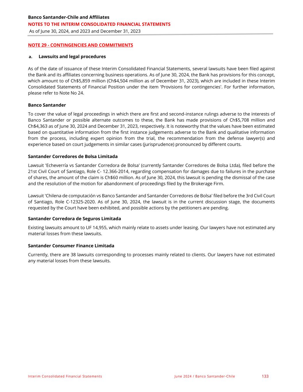Banco Santander-Chile and Affiliates NOTES TO THE INTERIM CONSOLIDATED FINANCIAL STATEMENTS As of June 30, 2024, and 2023 and December 31, 2023 Interim Consolidated Financial Statements June 2024 / Banco Santander-Chile 133 NOTE 29 - CONTINGENCIES AND COMMITMENTS a. Lawsuits and legal procedures As of the date of issuance of these Interim Consolidated Financial Statements, several lawsuits have been filed against the Bank and its affiliates concerning business operations. As of June 30, 2024, the Bank has provisions for this concept, which amount to of Ch$5,859 million (Ch$4,504 million as of December 31, 2023), which are included in these Interim Consolidated Statements of Financial Position under the item 'Provisions for contingencies'. For further information, please refer to Note No 24. Banco Santander To cover the value of legal proceedings in which there are first and second-instance rulings adverse to the interests of Banco Santander or possible alternate outcomes to these, the Bank has made provisions of Ch$5,708 million and Ch$4,363 as of June 30, 2024 and December 31, 2023, respectively. It is noteworthy that the values have been estimated based on quantitative information from the first instance judgements adverse to the Bank and qualitative information from the process, including expert opinion from the trial, the recommendation from the defense lawyer(s) and experience based on court judgements in similar cases (jurisprudence) pronounced by different courts. Santander Corredores de Bolsa Limitada Lawsuit 'Echeverría vs Santander Corredora de Bolsa' (currently Santander Corredores de Bolsa Ltda), filed before the 21st Civil Court of Santiago, Role C- 12.366-2014, regarding compensation for damages due to failures in the purchase of shares, the amount of the claim is Ch$60 million. As of June 30, 2024, this lawsuit is pending the dismissal of the case and the resolution of the motion for abandonment of proceedings filed by the Brokerage Firm. Lawsuit 'Chilena de computación vs Banco Santander and Santander Corredores de Bolsa' filed before the 3rd Civil Court of Santiago, Role C-12325-2020. As of June 30, 2024, the lawsuit is in the current discussion stage, the documents requested by the Court have been exhibited, and possible actions by the petitioners are pending. Santander Corredora de Seguros Limitada Existing lawsuits amount to UF 14,955, which mainly relate to assets under leasing. Our lawyers have not estimated any material losses from these lawsuits. Santander Consumer Finance Limitada Currently, there are 38 lawsuits corresponding to processes mainly related to clients. Our lawyers have not estimated any material losses from these lawsuits.
