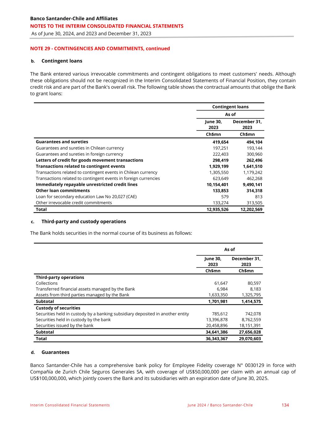 Banco Santander-Chile and Affiliates NOTES TO THE INTERIM CONSOLIDATED FINANCIAL STATEMENTS As of June 30, 2024, and 2023 and December 31, 2023 Interim Consolidated Financial Statements June 2024 / Banco Santander-Chile 134 NOTE 29 - CONTINGENCIES AND COMMITMENTS, continued b. Contingent loans The Bank entered various irrevocable commitments and contingent obligations to meet customers' needs. Although these obligations should not be recognized in the Interim Consolidated Statements of Financial Position, they contain credit risk and are part of the Bank's overall risk. The following table shows the contractual amounts that oblige the Bank to grant loans: Contingent loans As of June 30, 2023 December 31, 2023 Ch$mn Ch$mn Guarantees and sureties 419,654 494,104 Guarantees and sureties in Chilean currency 197,251 193,144 Guarantees and sureties in foreign currency 222,403 300,960 Letters of credit for goods movement transactions 298,419 262,496 Transactions related to contingent events 1,929,199 1,641,510 Transactions related to contingent events in Chilean currency 1,305,550 1,179,242 Transactions related to contingent events in foreign currencies 623,649 462,268 Immediately repayable unrestricted credit lines 10,154,401 9,490,141 Other loan commitments 133,853 314,318 Loan for secondary education Law No 20,027 (CAE) 579 813 Other irrevocable credit commitments 133,274 313,505 Total 12,935,526 12,202,569 c. Third-party and custody operations The Bank holds securities in the normal course of its business as follows: As of June 30, 2023 December 31, 2023 Ch$mn Ch$mn Third-party operations Collections 61,647 80,597 Transferred financial assets managed by the Bank 6,984 8,183 Assets from third parties managed by the Bank 1,633,350 1,325,795 Subtotal 1,701,981 1,414,575 Custody of securities Securities held in custody by a banking subsidiary deposited in another entity 785,612 742,078 Securities held in custody by the bank 13,396,878 8,762,559 Securities issued by the bank 20,458,896 18,151,391 Subtotal 34,641,386 27,656,028 Total 36,343,367 29,070,603 d. Guarantees Banco Santander-Chile has a comprehensive bank policy for Employee Fidelity coverage N° 0030129 in force with Compañía de Zurich Chile Seguros Generales SA, with coverage of US$50,000,000 per claim with an annual cap of US$100,000,000, which jointly covers the Bank and its subsidiaries with an expiration date of June 30, 2025.