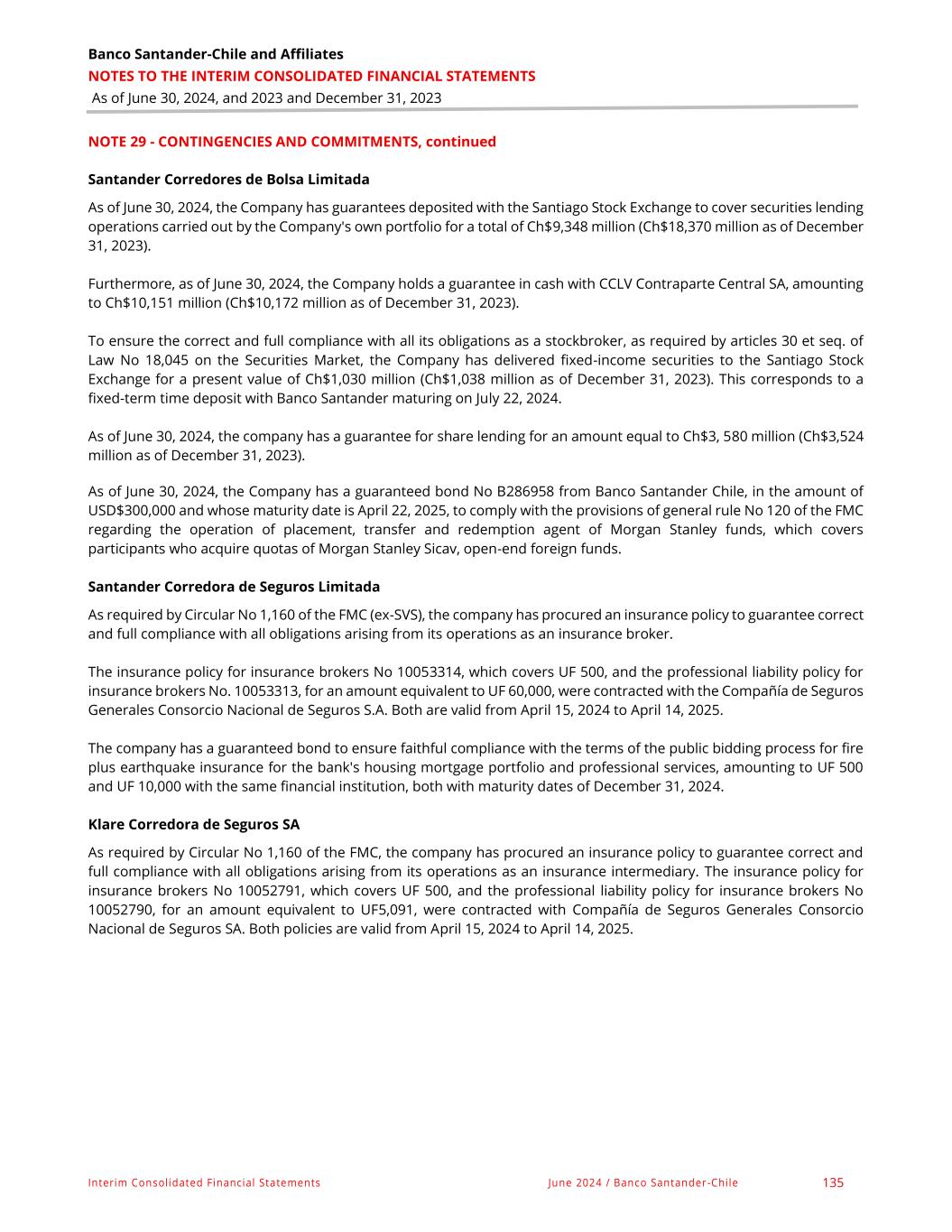 Banco Santander-Chile and Affiliates NOTES TO THE INTERIM CONSOLIDATED FINANCIAL STATEMENTS As of June 30, 2024, and 2023 and December 31, 2023 Interim Consolidated Financial Statements June 2024 / Banco Santander-Chile 135 NOTE 29 - CONTINGENCIES AND COMMITMENTS, continued Santander Corredores de Bolsa Limitada As of June 30, 2024, the Company has guarantees deposited with the Santiago Stock Exchange to cover securities lending operations carried out by the Company's own portfolio for a total of Ch$9,348 million (Ch$18,370 million as of December 31, 2023). Furthermore, as of June 30, 2024, the Company holds a guarantee in cash with CCLV Contraparte Central SA, amounting to Ch$10,151 million (Ch$10,172 million as of December 31, 2023). To ensure the correct and full compliance with all its obligations as a stockbroker, as required by articles 30 et seq. of Law No 18,045 on the Securities Market, the Company has delivered fixed-income securities to the Santiago Stock Exchange for a present value of Ch$1,030 million (Ch$1,038 million as of December 31, 2023). This corresponds to a fixed-term time deposit with Banco Santander maturing on July 22, 2024. As of June 30, 2024, the company has a guarantee for share lending for an amount equal to Ch$3, 580 million (Ch$3,524 million as of December 31, 2023). As of June 30, 2024, the Company has a guaranteed bond No B286958 from Banco Santander Chile, in the amount of USD$300,000 and whose maturity date is April 22, 2025, to comply with the provisions of general rule No 120 of the FMC regarding the operation of placement, transfer and redemption agent of Morgan Stanley funds, which covers participants who acquire quotas of Morgan Stanley Sicav, open-end foreign funds. Santander Corredora de Seguros Limitada As required by Circular No 1,160 of the FMC (ex-SVS), the company has procured an insurance policy to guarantee correct and full compliance with all obligations arising from its operations as an insurance broker. The insurance policy for insurance brokers No 10053314, which covers UF 500, and the professional liability policy for insurance brokers No. 10053313, for an amount equivalent to UF 60,000, were contracted with the Compañía de Seguros Generales Consorcio Nacional de Seguros S.A. Both are valid from April 15, 2024 to April 14, 2025. The company has a guaranteed bond to ensure faithful compliance with the terms of the public bidding process for fire plus earthquake insurance for the bank's housing mortgage portfolio and professional services, amounting to UF 500 and UF 10,000 with the same financial institution, both with maturity dates of December 31, 2024. Klare Corredora de Seguros SA As required by Circular No 1,160 of the FMC, the company has procured an insurance policy to guarantee correct and full compliance with all obligations arising from its operations as an insurance intermediary. The insurance policy for insurance brokers No 10052791, which covers UF 500, and the professional liability policy for insurance brokers No 10052790, for an amount equivalent to UF5,091, were contracted with Compañía de Seguros Generales Consorcio Nacional de Seguros SA. Both policies are valid from April 15, 2024 to April 14, 2025.