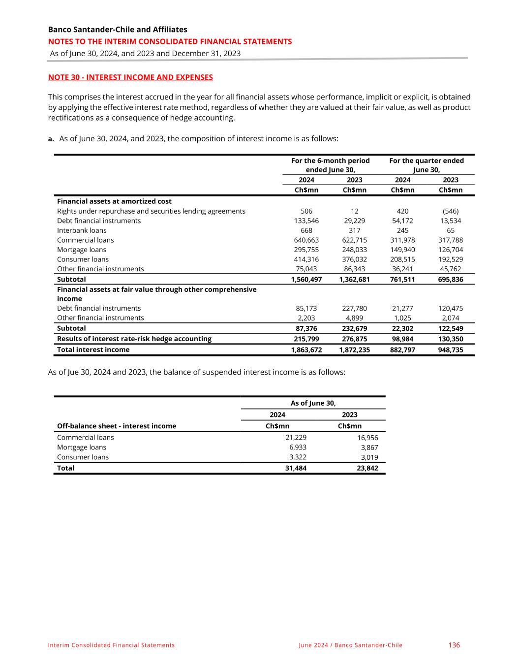 Banco Santander-Chile and Affiliates NOTES TO THE INTERIM CONSOLIDATED FINANCIAL STATEMENTS As of June 30, 2024, and 2023 and December 31, 2023 Interim Consolidated Financial Statements June 2024 / Banco Santander-Chile 136 NOTE 30 - INTEREST INCOME AND EXPENSES This comprises the interest accrued in the year for all financial assets whose performance, implicit or explicit, is obtained by applying the effective interest rate method, regardless of whether they are valued at their fair value, as well as product rectifications as a consequence of hedge accounting. a. As of June 30, 2024, and 2023, the composition of interest income is as follows: For the 6-month period ended June 30, For the quarter ended June 30, 2024 2023 2024 2023 Ch$mn Ch$mn Ch$mn Ch$mn Financial assets at amortized cost Rights under repurchase and securities lending agreements 506 12 420 (546) Debt financial instruments 133,546 29,229 54,172 13,534 Interbank loans 668 317 245 65 Commercial loans 640,663 622,715 311,978 317,788 Mortgage loans 295,755 248,033 149,940 126,704 Consumer loans 414,316 376,032 208,515 192,529 Other financial instruments 75,043 86,343 36,241 45,762 Subtotal 1,560,497 1,362,681 761,511 695,836 Financial assets at fair value through other comprehensive income Debt financial instruments 85,173 227,780 21,277 120,475 Other financial instruments 2,203 4,899 1,025 2,074 Subtotal 87,376 232,679 22,302 122,549 Results of interest rate-risk hedge accounting 215,799 276,875 98,984 130,350 Total interest income 1,863,672 1,872,235 882,797 948,735 As of Jue 30, 2024 and 2023, the balance of suspended interest income is as follows: As of June 30, 2024 2023 Off-balance sheet - interest income Ch$mn Ch$mn Commercial loans 21,229 16,956 Mortgage loans 6,933 3,867 Consumer loans 3,322 3,019 Total 31,484 23,842