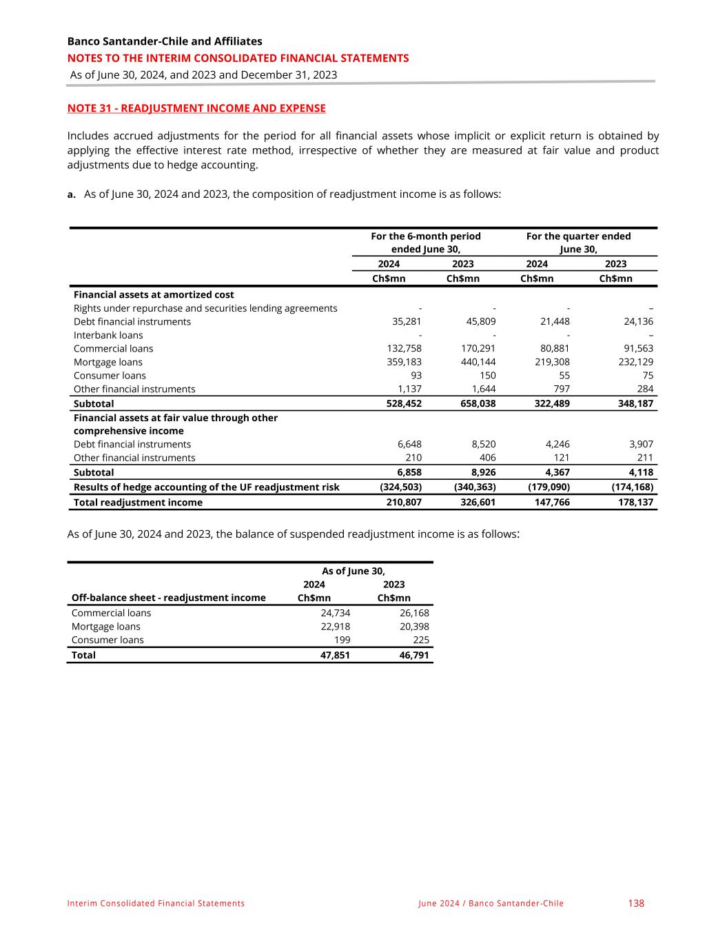 Banco Santander-Chile and Affiliates NOTES TO THE INTERIM CONSOLIDATED FINANCIAL STATEMENTS As of June 30, 2024, and 2023 and December 31, 2023 Interim Consolidated Financial Statements June 2024 / Banco Santander-Chile 138 NOTE 31 - READJUSTMENT INCOME AND EXPENSE Includes accrued adjustments for the period for all financial assets whose implicit or explicit return is obtained by applying the effective interest rate method, irrespective of whether they are measured at fair value and product adjustments due to hedge accounting. a. As of June 30, 2024 and 2023, the composition of readjustment income is as follows: For the 6-month period ended June 30, For the quarter ended June 30, 2024 2023 2024 2023 Ch$mn Ch$mn Ch$mn Ch$mn Financial assets at amortized cost Rights under repurchase and securities lending agreements - - - – Debt financial instruments 35,281 45,809 21,448 24,136 Interbank loans - - - – Commercial loans 132,758 170,291 80,881 91,563 Mortgage loans 359,183 440,144 219,308 232,129 Consumer loans 93 150 55 75 Other financial instruments 1,137 1,644 797 284 Subtotal 528,452 658,038 322,489 348,187 Financial assets at fair value through other comprehensive income Debt financial instruments 6,648 8,520 4,246 3,907 Other financial instruments 210 406 121 211 Subtotal 6,858 8,926 4,367 4,118 Results of hedge accounting of the UF readjustment risk (324,503) (340,363) (179,090) (174,168) Total readjustment income 210,807 326,601 147,766 178,137 As of June 30, 2024 and 2023, the balance of suspended readjustment income is as follows: As of June 30, 2024 2023 Off-balance sheet - readjustment income Ch$mn Ch$mn Commercial loans 24,734 26,168 Mortgage loans 22,918 20,398 Consumer loans 199 225 Total 47,851 46,791
