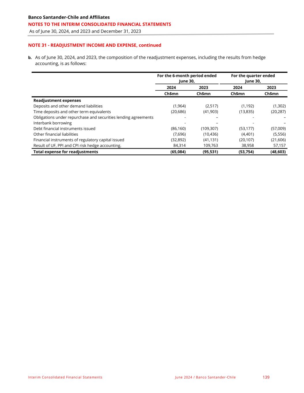 Banco Santander-Chile and Affiliates NOTES TO THE INTERIM CONSOLIDATED FINANCIAL STATEMENTS As of June 30, 2024, and 2023 and December 31, 2023 Interim Consolidated Financial Statements June 2024 / Banco Santander-Chile 139 NOTE 31 - READJUSTMENT INCOME AND EXPENSE, continued b. As of June 30, 2024, and 2023, the composition of the readjustment expenses, including the results from hedge accounting, is as follows: For the 6-month period ended June 30, For the quarter ended June 30, 2024 2023 2024 2023 Ch$mn Ch$mn Ch$mn Ch$mn Readjustment expenses Deposits and other demand liabilities (1,964) (2,517) (1,192) (1,302) Time deposits and other term equivalents (20,686) (41,903) (13,835) (20,287) Obligations under repurchase and securities lending agreements - – - – Interbank borrowing - – - – Debt financial instruments issued (86,160) (109,307) (53,177) (57,009) Other financial liabilities (7,696) (10,436) (4,401) (5,556) Financial instruments of regulatory capital issued (32,892) (41,131) (20,107) (21,606) Result of UF, PPI and CPI risk hedge accounting. 84,314 109,763 38,958 57,157 Total expense for readjustments (65,084) (95,531) (53,754) (48,603)