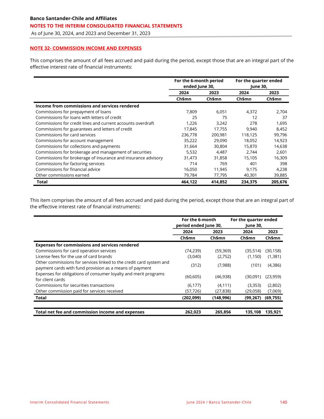 Banco Santander-Chile and Affiliates NOTES TO THE INTERIM CONSOLIDATED FINANCIAL STATEMENTS As of June 30, 2024, and 2023 and December 31, 2023 Interim Consolidated Financial Statements June 2024 / Banco Santander-Chile 140 NOTE 32- COMMISSION INCOME AND EXPENSES This comprises the amount of all fees accrued and paid during the period, except those that are an integral part of the effective interest rate of financial instruments: For the 6-month period ended June 30, For the quarter ended June 30, 2024 2023 2024 2023 Ch$mn Ch$mn Ch$mn Ch$mn Income from commissions and services rendered Commissions for prepayment of loans 7,809 6,051 4,372 2,704 Commissions for loans with letters of credit 25 75 12 37 Commissions for credit lines and current accounts overdraft 1,226 3,242 278 1,695 Commissions for guarantees and letters of credit 17,845 17,755 9,940 8,452 Commissions for card services 236,778 200,981 118,125 99,796 Commissions for account management 35,222 29,090 18,052 14,923 Commissions for collections and payments 31,664 30,804 15,870 14,638 Commissions for brokerage and management of securities 5,532 4,487 2,744 2,601 Commissions for brokerage of insurance and insurance advisory 31,473 31,858 15,105 16,309 Commissions for factoring services 714 769 401 398 Commissions for financial advice 16,050 11,945 9,175 4,238 Other commissions earned 79,784 77,795 40,301 39,885 Total 464,122 414,852 234,375 205,676 This item comprises the amount of all fees accrued and paid during the period, except those that are an integral part of the effective interest rate of financial instruments: For the 6-month period ended June 30, For the quarter ended June 30, 2024 2023 2024 2023 Ch$mn Ch$mn Ch$mn Ch$mn Expenses for commissions and services rendered Commissions for card operation services (74,239) (59,369) (35,514) (30,158) License fees for the use of card brands (3,040) (2,752) (1,150) (1,381) Other commissions for services linked to the credit card system and payment cards with fund provision as a means of payment (312) (7,988) (101) (4,386) Expenses for obligations of consumer loyalty and merit programs for client cards (60,605) (46,938) (30,091) (23,959) Commissions for securities transactions (6,177) (4,111) (3,353) (2,802) Other commission paid for services received (57,726) (27,838) (29,058) (7,069) Total (202,099) (148,996) (99,267) (69,755) Total net fee and commission income and expenses 262,023 265,856 135,108 135,921