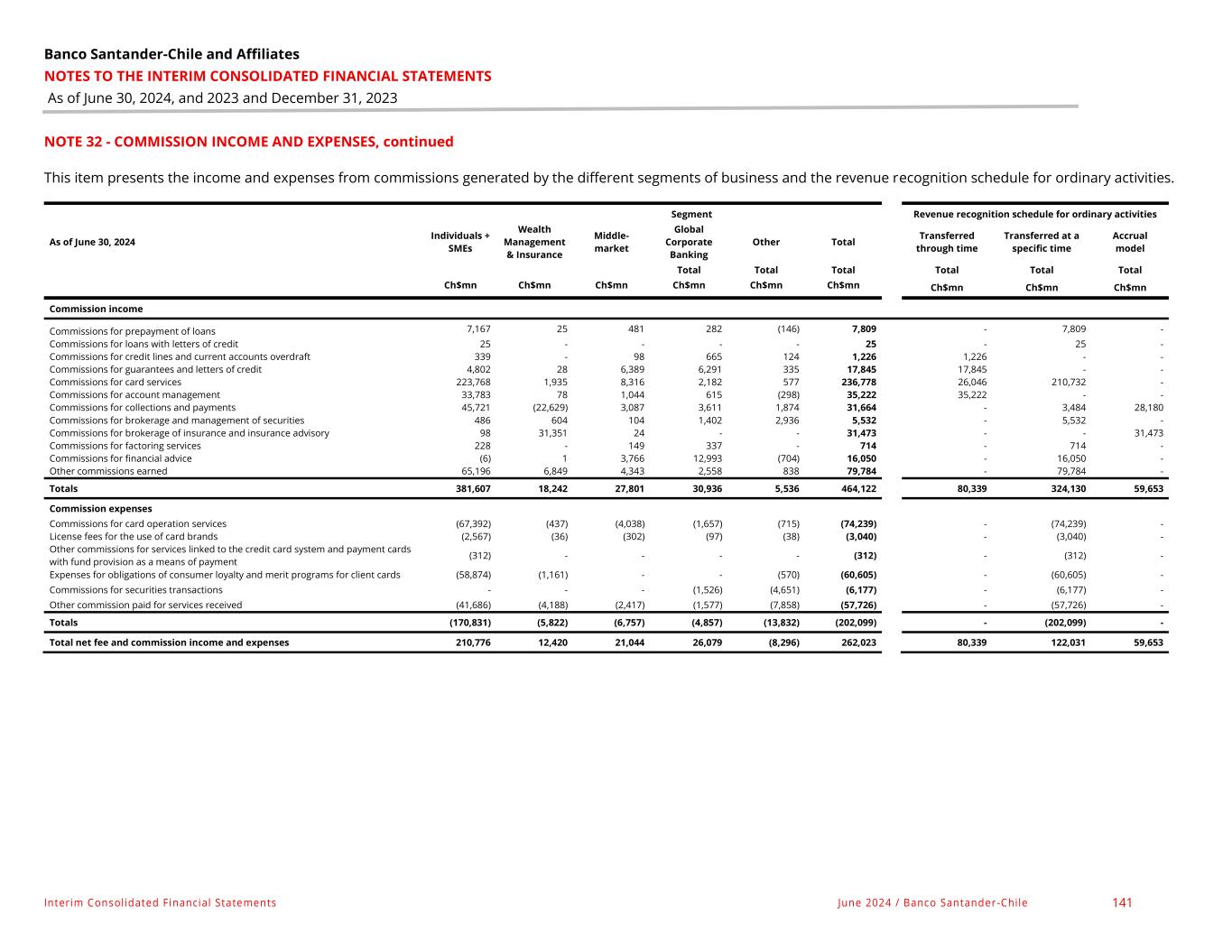 Banco Santander-Chile and Affiliates NOTES TO THE INTERIM CONSOLIDATED FINANCIAL STATEMENTS As of June 30, 2024, and 2023 and December 31, 2023 Interim Consolidated Financial Statements June 2024 / Banco Santander -Chile 141 NOTE 32 - COMMISSION INCOME AND EXPENSES, continued This item presents the income and expenses from commissions generated by the different segments of business and the revenue recognition schedule for ordinary activities. Segment Revenue recognition schedule for ordinary activities As of June 30, 2024 Individuals + SMEs Wealth Management & Insurance Middle- market Global Corporate Banking Other Total Transferred through time Transferred at a specific time Accrual model Total Total Total Total Total Total Ch$mn Ch$mn Ch$mn Ch$mn Ch$mn Ch$mn Ch$mn Ch$mn Ch$mn Commission income Commissions for prepayment of loans 7,167 25 481 282 (146) 7,809 - 7,809 - Commissions for loans with letters of credit 25 - - - - 25 - 25 - Commissions for credit lines and current accounts overdraft 339 - 98 665 124 1,226 1,226 - - Commissions for guarantees and letters of credit 4,802 28 6,389 6,291 335 17,845 17,845 - - Commissions for card services 223,768 1,935 8,316 2,182 577 236,778 26,046 210,732 - Commissions for account management 33,783 78 1,044 615 (298) 35,222 35,222 - - Commissions for collections and payments 45,721 (22,629) 3,087 3,611 1,874 31,664 - 3,484 28,180 Commissions for brokerage and management of securities 486 604 104 1,402 2,936 5,532 - 5,532 - Commissions for brokerage of insurance and insurance advisory 98 31,351 24 - - 31,473 - - 31,473 Commissions for factoring services 228 - 149 337 - 714 - 714 - Commissions for financial advice (6) 1 3,766 12,993 (704) 16,050 - 16,050 - Other commissions earned 65,196 6,849 4,343 2,558 838 79,784 - 79,784 - Totals 381,607 18,242 27,801 30,936 5,536 464,122 80,339 324,130 59,653 Commission expenses Commissions for card operation services (67,392) (437) (4,038) (1,657) (715) (74,239) - (74,239) - License fees for the use of card brands (2,567) (36) (302) (97) (38) (3,040) - (3,040) - Other commissions for services linked to the credit card system and payment cards with fund provision as a means of payment (312) - - - - (312) - (312) - Expenses for obligations of consumer loyalty and merit programs for client cards (58,874) (1,161) - - (570) (60,605) - (60,605) - Commissions for securities transactions - - - (1,526) (4,651) (6,177) - (6,177) - Other commission paid for services received (41,686) (4,188) (2,417) (1,577) (7,858) (57,726) - (57,726) - Totals (170,831) (5,822) (6,757) (4,857) (13,832) (202,099) - (202,099) - Total net fee and commission income and expenses 210,776 12,420 21,044 26,079 (8,296) 262,023 80,339 122,031 59,653