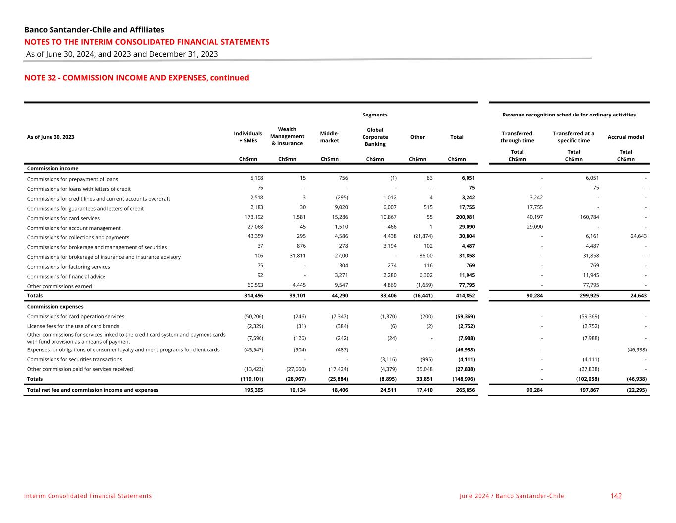 Banco Santander-Chile and Affiliates NOTES TO THE INTERIM CONSOLIDATED FINANCIAL STATEMENTS As of June 30, 2024, and 2023 and December 31, 2023 Interim Consolidated Financial Statements June 2024 / Banco Santander -Chile 142 NOTE 32 - COMMISSION INCOME AND EXPENSES, continued Segments Revenue recognition schedule for ordinary activities As of June 30, 2023 Individuals + SMEs Wealth Management & Insurance Middle- market Global Corporate Banking Other Total Transferred through time Transferred at a specific time Accrual model Total Total Total Ch$mn Ch$mn Ch$mn Ch$mn Ch$mn Ch$mn Ch$mn Ch$mn Ch$mn Commission income Commissions for prepayment of loans 5,198 15 756 (1) 83 6,051 - 6,051 - Commissions for loans with letters of credit 75 - - - - 75 - 75 - Commissions for credit lines and current accounts overdraft 2,518 3 (295) 1,012 4 3,242 3,242 - - Commissions for guarantees and letters of credit 2,183 30 9,020 6,007 515 17,755 17,755 - - Commissions for card services 173,192 1,581 15,286 10,867 55 200,981 40,197 160,784 - Commissions for account management 27,068 45 1,510 466 1 29,090 29,090 - - Commissions for collections and payments 43,359 295 4,586 4,438 (21,874) 30,804 - 6,161 24,643 Commissions for brokerage and management of securities 37 876 278 3,194 102 4,487 - 4,487 - Commissions for brokerage of insurance and insurance advisory 106 31,811 27,00 - -86,00 31,858 - 31,858 - Commissions for factoring services 75 - 304 274 116 769 - 769 - Commissions for financial advice 92 - 3,271 2,280 6,302 11,945 - 11,945 - Other commissions earned 60,593 4,445 9,547 4,869 (1,659) 77,795 - 77,795 - Totals 314,496 39,101 44,290 33,406 (16,441) 414,852 90,284 299,925 24,643 Commission expenses Commissions for card operation services (50,206) (246) (7,347) (1,370) (200) (59,369) - (59,369) - License fees for the use of card brands (2,329) (31) (384) (6) (2) (2,752) - (2,752) - Other commissions for services linked to the credit card system and payment cards with fund provision as a means of payment (7,596) (126) (242) (24) - (7,988) - (7,988) - Expenses for obligations of consumer loyalty and merit programs for client cards (45,547) (904) (487) - - (46,938) - - (46,938) Commissions for securities transactions - - - (3,116) (995) (4,111) - (4,111) - Other commission paid for services received (13,423) (27,660) (17,424) (4,379) 35,048 (27,838) - (27,838) - Totals (119,101) (28,967) (25,884) (8,895) 33,851 (148,996) - (102,058) (46,938) Total net fee and commission income and expenses 195,395 10,134 18,406 24,511 17,410 265,856 90,284 197,867 (22,295)