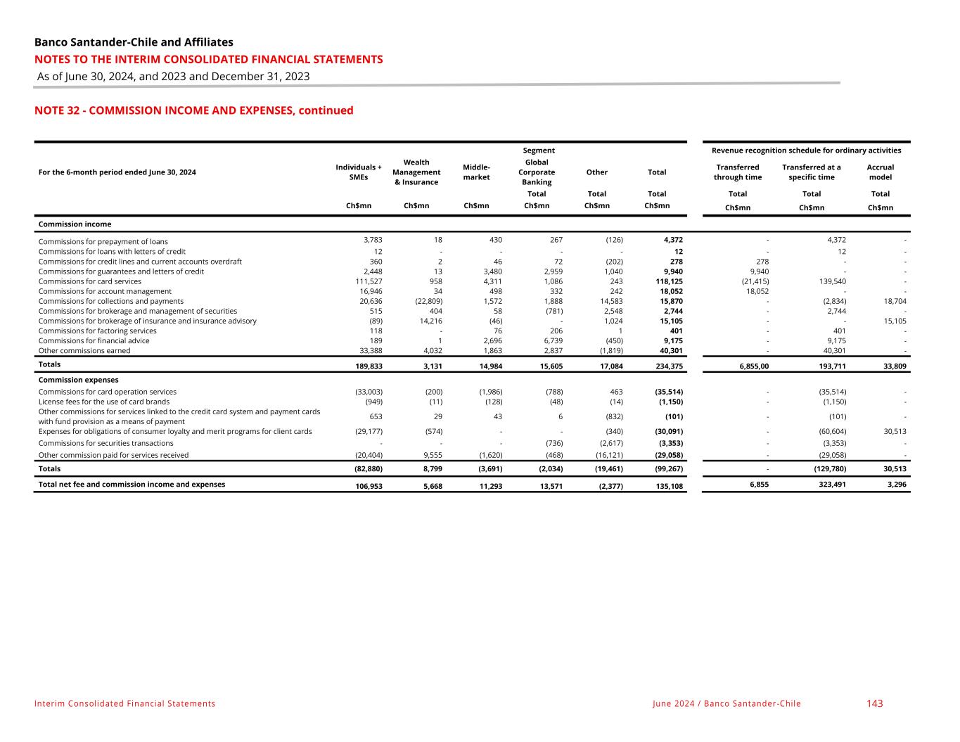 Banco Santander-Chile and Affiliates NOTES TO THE INTERIM CONSOLIDATED FINANCIAL STATEMENTS As of June 30, 2024, and 2023 and December 31, 2023 Interim Consolidated Financial Statements June 2024 / Banco Santander -Chile 143 NOTE 32 - COMMISSION INCOME AND EXPENSES, continued Segment Revenue recognition schedule for ordinary activities For the 6-month period ended June 30, 2024 Individuals + SMEs Wealth Management & Insurance Middle- market Global Corporate Banking Other Total Transferred through time Transferred at a specific time Accrual model Total Total Total Total Total Total Ch$mn Ch$mn Ch$mn Ch$mn Ch$mn Ch$mn Ch$mn Ch$mn Ch$mn Commission income Commissions for prepayment of loans 3,783 18 430 267 (126) 4,372 - 4,372 - Commissions for loans with letters of credit 12 - - - - 12 - 12 - Commissions for credit lines and current accounts overdraft 360 2 46 72 (202) 278 278 - - Commissions for guarantees and letters of credit 2,448 13 3,480 2,959 1,040 9,940 9,940 - - Commissions for card services 111,527 958 4,311 1,086 243 118,125 (21,415) 139,540 - Commissions for account management 16,946 34 498 332 242 18,052 18,052 - - Commissions for collections and payments 20,636 (22,809) 1,572 1,888 14,583 15,870 - (2,834) 18,704 Commissions for brokerage and management of securities 515 404 58 (781) 2,548 2,744 - 2,744 - Commissions for brokerage of insurance and insurance advisory (89) 14,216 (46) - 1,024 15,105 - - 15,105 Commissions for factoring services 118 - 76 206 1 401 - 401 - Commissions for financial advice 189 1 2,696 6,739 (450) 9,175 - 9,175 - Other commissions earned 33,388 4,032 1,863 2,837 (1,819) 40,301 - 40,301 - Totals 189,833 3,131 14,984 15,605 17,084 234,375 6,855,00 193,711 33,809 Commission expenses Commissions for card operation services (33,003) (200) (1,986) (788) 463 (35,514) - (35,514) - License fees for the use of card brands (949) (11) (128) (48) (14) (1,150) - (1,150) - Other commissions for services linked to the credit card system and payment cards with fund provision as a means of payment 653 29 43 6 (832) (101) - (101) - Expenses for obligations of consumer loyalty and merit programs for client cards (29,177) (574) - - (340) (30,091) - (60,604) 30,513 Commissions for securities transactions - - - (736) (2,617) (3,353) - (3,353) - Other commission paid for services received (20,404) 9,555 (1,620) (468) (16,121) (29,058) - (29,058) - Totals (82,880) 8,799 (3,691) (2,034) (19,461) (99,267) - (129,780) 30,513 Total net fee and commission income and expenses 106,953 5,668 11,293 13,571 (2,377) 135,108 6,855 323,491 3,296