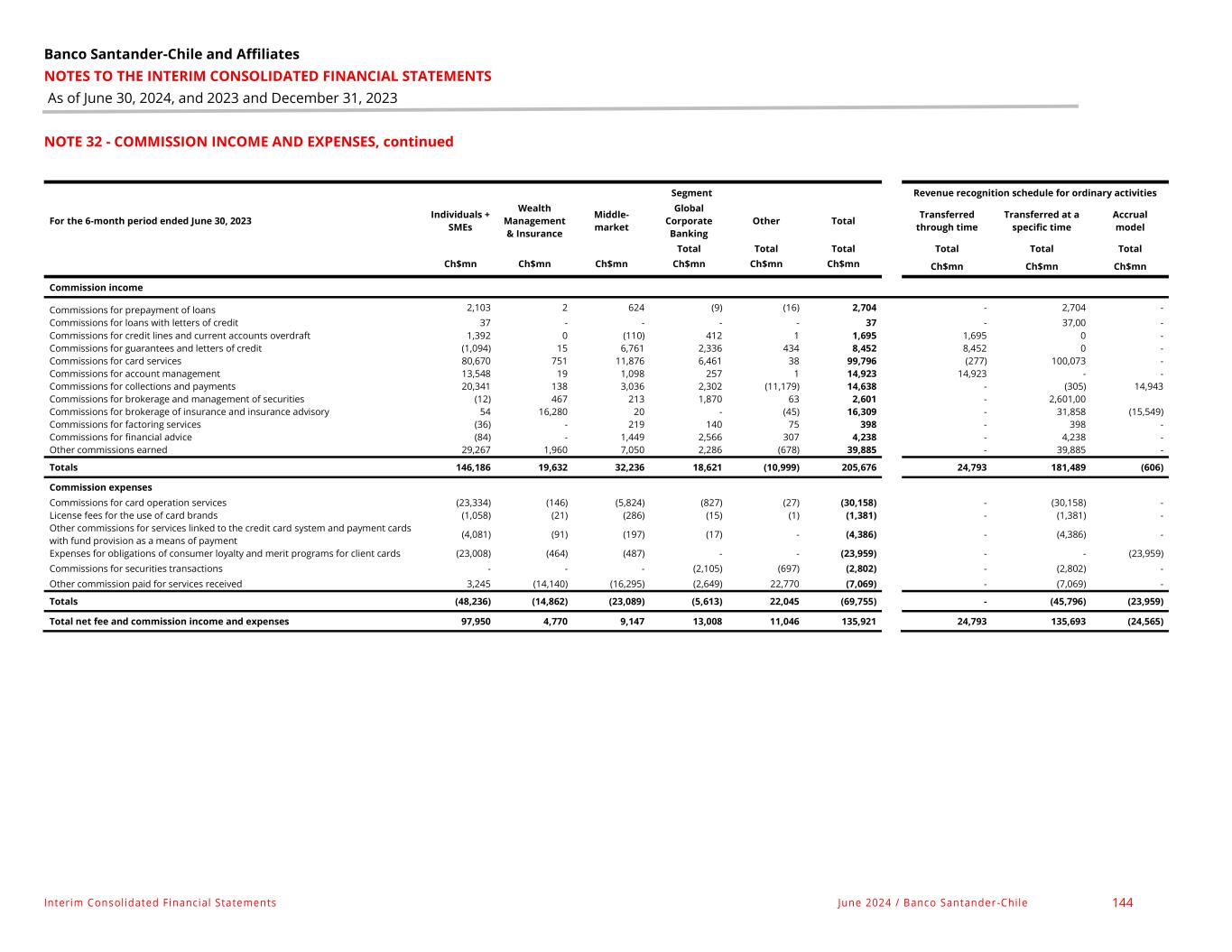 Banco Santander-Chile and Affiliates NOTES TO THE INTERIM CONSOLIDATED FINANCIAL STATEMENTS As of June 30, 2024, and 2023 and December 31, 2023 Interim Consolidated Financial Statements June 2024 / Banco Santander -Chile 144 NOTE 32 - COMMISSION INCOME AND EXPENSES, continued Segment Revenue recognition schedule for ordinary activities For the 6-month period ended June 30, 2023 Individuals + SMEs Wealth Management & Insurance Middle- market Global Corporate Banking Other Total Transferred through time Transferred at a specific time Accrual model Total Total Total Total Total Total Ch$mn Ch$mn Ch$mn Ch$mn Ch$mn Ch$mn Ch$mn Ch$mn Ch$mn Commission income Commissions for prepayment of loans 2,103 2 624 (9) (16) 2,704 - 2,704 - Commissions for loans with letters of credit 37 - - - - 37 - 37,00 - Commissions for credit lines and current accounts overdraft 1,392 0 (110) 412 1 1,695 1,695 0 - Commissions for guarantees and letters of credit (1,094) 15 6,761 2,336 434 8,452 8,452 0 - Commissions for card services 80,670 751 11,876 6,461 38 99,796 (277) 100,073 - Commissions for account management 13,548 19 1,098 257 1 14,923 14,923 - - Commissions for collections and payments 20,341 138 3,036 2,302 (11,179) 14,638 - (305) 14,943 Commissions for brokerage and management of securities (12) 467 213 1,870 63 2,601 - 2,601,00 Commissions for brokerage of insurance and insurance advisory 54 16,280 20 - (45) 16,309 - 31,858 (15,549) Commissions for factoring services (36) - 219 140 75 398 - 398 - Commissions for financial advice (84) - 1,449 2,566 307 4,238 - 4,238 - Other commissions earned 29,267 1,960 7,050 2,286 (678) 39,885 - 39,885 - Totals 146,186 19,632 32,236 18,621 (10,999) 205,676 24,793 181,489 (606) Commission expenses Commissions for card operation services (23,334) (146) (5,824) (827) (27) (30,158) - (30,158) - License fees for the use of card brands (1,058) (21) (286) (15) (1) (1,381) - (1,381) - Other commissions for services linked to the credit card system and payment cards with fund provision as a means of payment (4,081) (91) (197) (17) - (4,386) - (4,386) - Expenses for obligations of consumer loyalty and merit programs for client cards (23,008) (464) (487) - - (23,959) - - (23,959) Commissions for securities transactions - - - (2,105) (697) (2,802) - (2,802) - Other commission paid for services received 3,245 (14,140) (16,295) (2,649) 22,770 (7,069) - (7,069) - Totals (48,236) (14,862) (23,089) (5,613) 22,045 (69,755) - (45,796) (23,959) Total net fee and commission income and expenses 97,950 4,770 9,147 13,008 11,046 135,921 24,793 135,693 (24,565)