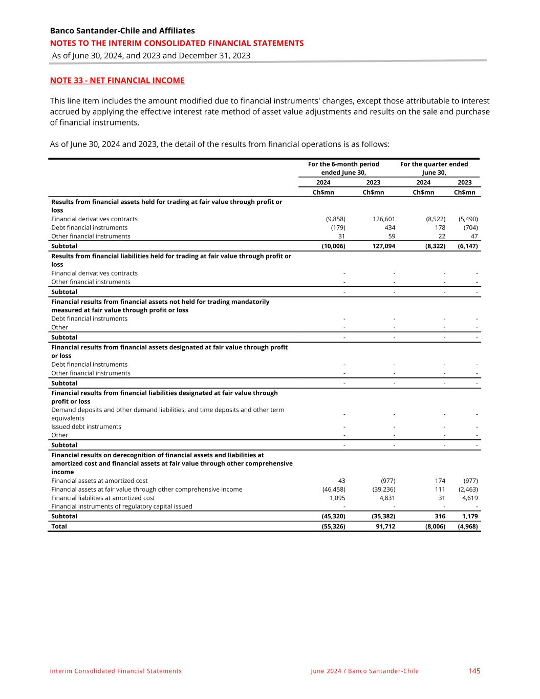 Banco Santander-Chile and Affiliates NOTES TO THE INTERIM CONSOLIDATED FINANCIAL STATEMENTS As of June 30, 2024, and 2023 and December 31, 2023 Interim Consolidated Financial Statements June 2024 / Banco Santander-Chile 145 NOTE 33 - NET FINANCIAL INCOME This line item includes the amount modified due to financial instruments' changes, except those attributable to interest accrued by applying the effective interest rate method of asset value adjustments and results on the sale and purchase of financial instruments. As of June 30, 2024 and 2023, the detail of the results from financial operations is as follows: For the 6-month period ended June 30, For the quarter ended June 30, 2024 2023 2024 2023 Ch$mn Ch$mn Ch$mn Ch$mn Results from financial assets held for trading at fair value through profit or loss Financial derivatives contracts (9,858) 126,601 (8,522) (5,490) Debt financial instruments (179) 434 178 (704) Other financial instruments 31 59 22 47 Subtotal (10,006) 127,094 (8,322) (6,147) Results from financial liabilities held for trading at fair value through profit or loss Financial derivatives contracts - - - - Other financial instruments - - - - Subtotal - - - - Financial results from financial assets not held for trading mandatorily measured at fair value through profit or loss Debt financial instruments - - - - Other - - - - Subtotal - - - - Financial results from financial assets designated at fair value through profit or loss Debt financial instruments - - - - Other financial instruments - - - - Subtotal - - - - Financial results from financial liabilities designated at fair value through profit or loss Demand deposits and other demand liabilities, and time deposits and other term equivalents - - - - Issued debt instruments - - - - Other - - - - Subtotal - - - - Financial results on derecognition of financial assets and liabilities at amortized cost and financial assets at fair value through other comprehensive income Financial assets at amortized cost 43 (977) 174 (977) Financial assets at fair value through other comprehensive income (46,458) (39,236) 111 (2,463) Financial liabilities at amortized cost 1,095 4,831 31 4,619 Financial instruments of regulatory capital issued - - - - Subtotal (45,320) (35,382) 316 1,179 Total (55,326) 91,712 (8,006) (4,968)