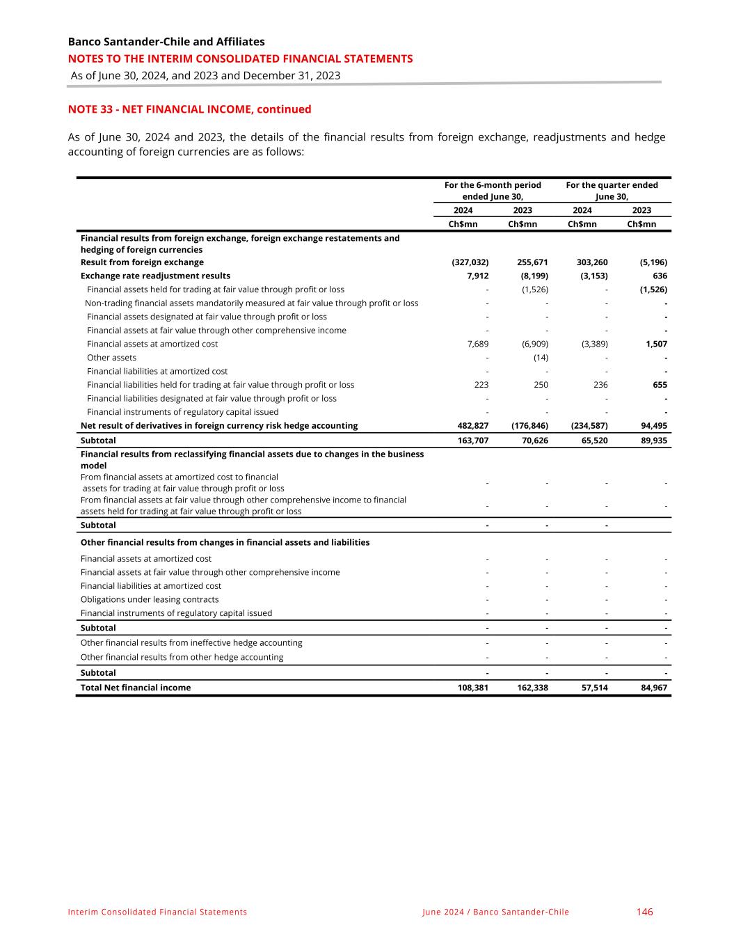 Banco Santander-Chile and Affiliates NOTES TO THE INTERIM CONSOLIDATED FINANCIAL STATEMENTS As of June 30, 2024, and 2023 and December 31, 2023 Interim Consolidated Financial Statements June 2024 / Banco Santander-Chile 146 NOTE 33 - NET FINANCIAL INCOME, continued As of June 30, 2024 and 2023, the details of the financial results from foreign exchange, readjustments and hedge accounting of foreign currencies are as follows: For the 6-month period ended June 30, For the quarter ended June 30, 2024 2023 2024 2023 Ch$mn Ch$mn Ch$mn Ch$mn Financial results from foreign exchange, foreign exchange restatements and hedging of foreign currencies Result from foreign exchange (327,032) 255,671 303,260 (5,196) Exchange rate readjustment results 7,912 (8,199) (3,153) 636 Financial assets held for trading at fair value through profit or loss - (1,526) - (1,526) Non-trading financial assets mandatorily measured at fair value through profit or loss - - - - Financial assets designated at fair value through profit or loss - - - - Financial assets at fair value through other comprehensive income - - - - Financial assets at amortized cost 7,689 (6,909) (3,389) 1,507 Other assets - (14) - - Financial liabilities at amortized cost - - - - Financial liabilities held for trading at fair value through profit or loss 223 250 236 655 Financial liabilities designated at fair value through profit or loss - - - - Financial instruments of regulatory capital issued - - - - Net result of derivatives in foreign currency risk hedge accounting 482,827 (176,846) (234,587) 94,495 Subtotal 163,707 70,626 65,520 89,935 Financial results from reclassifying financial assets due to changes in the business model From financial assets at amortized cost to financial assets for trading at fair value through profit or loss - - - - From financial assets at fair value through other comprehensive income to financial assets held for trading at fair value through profit or loss - - - - Subtotal - - - Other financial results from changes in financial assets and liabilities Financial assets at amortized cost - - - - Financial assets at fair value through other comprehensive income - - - - Financial liabilities at amortized cost - - - - Obligations under leasing contracts - - - - Financial instruments of regulatory capital issued - - - - Subtotal - - - - Other financial results from ineffective hedge accounting - - - - Other financial results from other hedge accounting - - - - Subtotal - - - - Total Net financial income 108,381 162,338 57,514 84,967