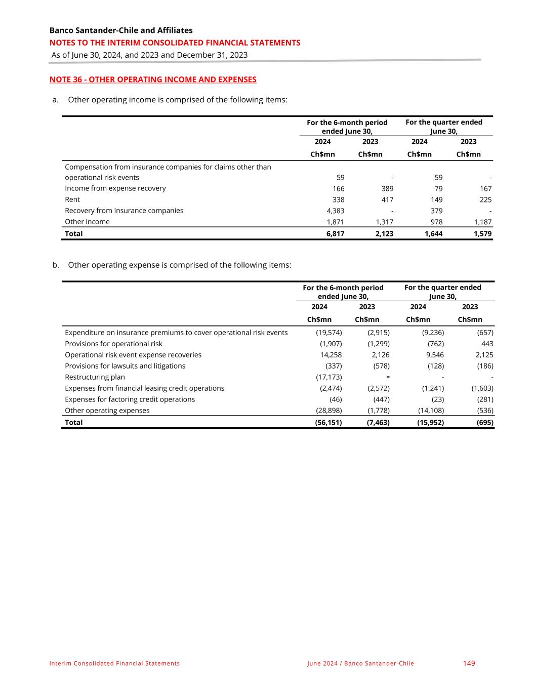 Banco Santander-Chile and Affiliates NOTES TO THE INTERIM CONSOLIDATED FINANCIAL STATEMENTS As of June 30, 2024, and 2023 and December 31, 2023 Interim Consolidated Financial Statements June 2024 / Banco Santander-Chile 149 NOTE 36 - OTHER OPERATING INCOME AND EXPENSES a. Other operating income is comprised of the following items: For the 6-month period ended June 30, For the quarter ended June 30, 2024 2023 2024 2023 Ch$mn Ch$mn Ch$mn Ch$mn Compensation from insurance companies for claims other than operational risk events 59 - 59 - Income from expense recovery 166 389 79 167 Rent 338 417 149 225 Recovery from Insurance companies 4,383 - 379 - Other income 1,871 1,317 978 1,187 Total 6,817 2,123 1,644 1,579 b. Other operating expense is comprised of the following items: For the 6-month period ended June 30, For the quarter ended June 30, 2024 2023 2024 2023 Ch$mn Ch$mn Ch$mn Ch$mn Expenditure on insurance premiums to cover operational risk events (19,574) (2,915) (9,236) (657) Provisions for operational risk (1,907) (1,299) (762) 443 Operational risk event expense recoveries 14,258 2,126 9,546 2,125 Provisions for lawsuits and litigations (337) (578) (128) (186) Restructuring plan (17,173) - - - Expenses from financial leasing credit operations (2,474) (2,572) (1,241) (1,603) Expenses for factoring credit operations (46) (447) (23) (281) Other operating expenses (28,898) (1,778) (14,108) (536) Total (56,151) (7,463) (15,952) (695)