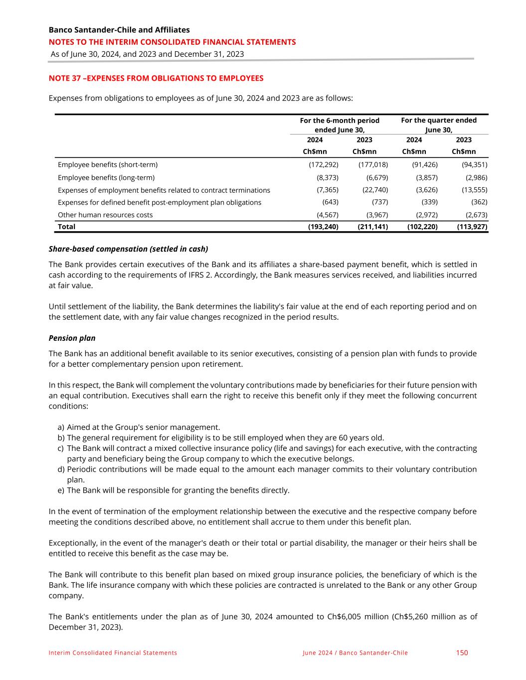 Banco Santander-Chile and Affiliates NOTES TO THE INTERIM CONSOLIDATED FINANCIAL STATEMENTS As of June 30, 2024, and 2023 and December 31, 2023 Interim Consolidated Financial Statements June 2024 / Banco Santander-Chile 150 NOTE 37 –EXPENSES FROM OBLIGATIONS TO EMPLOYEES Expenses from obligations to employees as of June 30, 2024 and 2023 are as follows: For the 6-month period ended June 30, For the quarter ended June 30, 2024 2023 2024 2023 Ch$mn Ch$mn Ch$mn Ch$mn Employee benefits (short-term) (172,292) (177,018) (91,426) (94,351) Employee benefits (long-term) (8,373) (6,679) (3,857) (2,986) Expenses of employment benefits related to contract terminations (7,365) (22,740) (3,626) (13,555) Expenses for defined benefit post-employment plan obligations (643) (737) (339) (362) Other human resources costs (4,567) (3,967) (2,972) (2,673) Total (193,240) (211,141) (102,220) (113,927) Share-based compensation (settled in cash) The Bank provides certain executives of the Bank and its affiliates a share-based payment benefit, which is settled in cash according to the requirements of IFRS 2. Accordingly, the Bank measures services received, and liabilities incurred at fair value. Until settlement of the liability, the Bank determines the liability's fair value at the end of each reporting period and on the settlement date, with any fair value changes recognized in the period results. Pension plan The Bank has an additional benefit available to its senior executives, consisting of a pension plan with funds to provide for a better complementary pension upon retirement. In this respect, the Bank will complement the voluntary contributions made by beneficiaries for their future pension with an equal contribution. Executives shall earn the right to receive this benefit only if they meet the following concurrent conditions: a) Aimed at the Group's senior management. b) The general requirement for eligibility is to be still employed when they are 60 years old. c) The Bank will contract a mixed collective insurance policy (life and savings) for each executive, with the contracting party and beneficiary being the Group company to which the executive belongs. d) Periodic contributions will be made equal to the amount each manager commits to their voluntary contribution plan. e) The Bank will be responsible for granting the benefits directly. In the event of termination of the employment relationship between the executive and the respective company before meeting the conditions described above, no entitlement shall accrue to them under this benefit plan. Exceptionally, in the event of the manager's death or their total or partial disability, the manager or their heirs shall be entitled to receive this benefit as the case may be. The Bank will contribute to this benefit plan based on mixed group insurance policies, the beneficiary of which is the Bank. The life insurance company with which these policies are contracted is unrelated to the Bank or any other Group company. The Bank's entitlements under the plan as of June 30, 2024 amounted to Ch$6,005 million (Ch$5,260 million as of December 31, 2023).