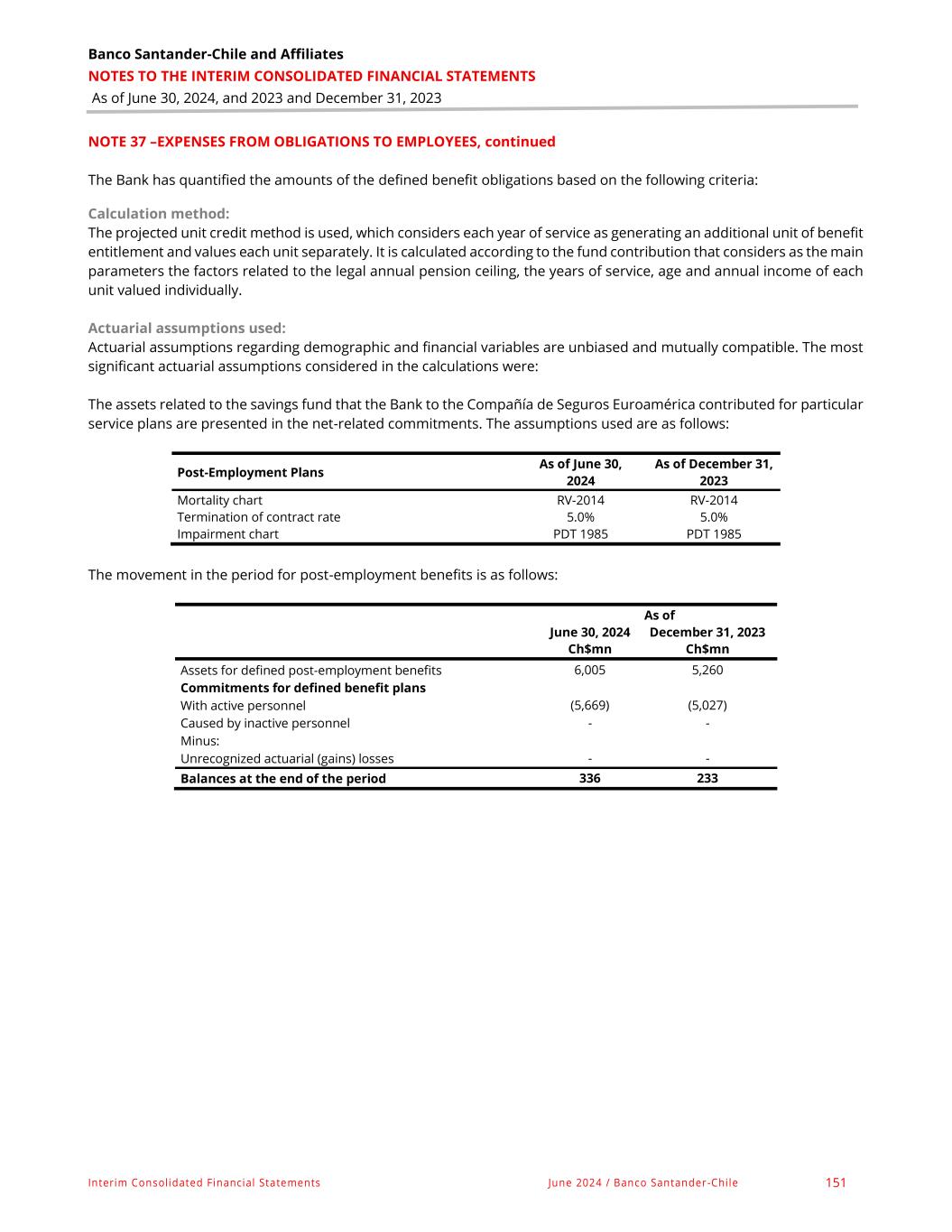 Banco Santander-Chile and Affiliates NOTES TO THE INTERIM CONSOLIDATED FINANCIAL STATEMENTS As of June 30, 2024, and 2023 and December 31, 2023 Interim Consolidated Financial Statements June 2024 / Banco Santander-Chile 151 NOTE 37 –EXPENSES FROM OBLIGATIONS TO EMPLOYEES, continued The Bank has quantified the amounts of the defined benefit obligations based on the following criteria: Calculation method: The projected unit credit method is used, which considers each year of service as generating an additional unit of benefit entitlement and values each unit separately. It is calculated according to the fund contribution that considers as the main parameters the factors related to the legal annual pension ceiling, the years of service, age and annual income of each unit valued individually. Actuarial assumptions used: Actuarial assumptions regarding demographic and financial variables are unbiased and mutually compatible. The most significant actuarial assumptions considered in the calculations were: The assets related to the savings fund that the Bank to the Compañía de Seguros Euroamérica contributed for particular service plans are presented in the net-related commitments. The assumptions used are as follows: Post-Employment Plans As of June 30, 2024 As of December 31, 2023 Mortality chart RV-2014 RV-2014 Termination of contract rate 5.0% 5.0% Impairment chart PDT 1985 PDT 1985 The movement in the period for post-employment benefits is as follows: As of June 30, 2024 December 31, 2023 Ch$mn Ch$mn Assets for defined post-employment benefits 6,005 5,260 Commitments for defined benefit plans With active personnel (5,669) (5,027) Caused by inactive personnel - - Minus: Unrecognized actuarial (gains) losses - - Balances at the end of the period 336 233