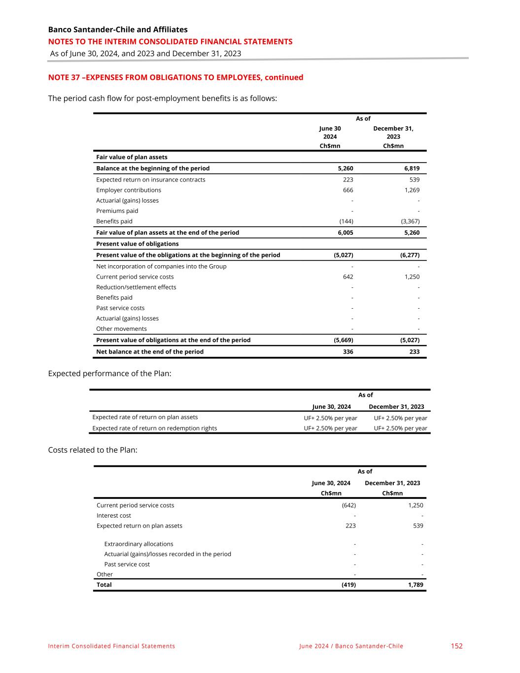 Banco Santander-Chile and Affiliates NOTES TO THE INTERIM CONSOLIDATED FINANCIAL STATEMENTS As of June 30, 2024, and 2023 and December 31, 2023 Interim Consolidated Financial Statements June 2024 / Banco Santander-Chile 152 NOTE 37 –EXPENSES FROM OBLIGATIONS TO EMPLOYEES, continued The period cash flow for post-employment benefits is as follows: As of June 30 2024 December 31, 2023 Ch$mn Ch$mn Fair value of plan assets Balance at the beginning of the period 5,260 6,819 Expected return on insurance contracts 223 539 Employer contributions 666 1,269 Actuarial (gains) losses - - Premiums paid - - Benefits paid (144) (3,367) Fair value of plan assets at the end of the period 6,005 5,260 Present value of obligations Present value of the obligations at the beginning of the period (5,027) (6,277) Net incorporation of companies into the Group - - Current period service costs 642 1,250 Reduction/settlement effects - - Benefits paid - - Past service costs - - Actuarial (gains) losses - - Other movements - - Present value of obligations at the end of the period (5,669) (5,027) Net balance at the end of the period 336 233 Expected performance of the Plan: As of June 30, 2024 December 31, 2023 Expected rate of return on plan assets UF+ 2.50% per year UF+ 2.50% per year Expected rate of return on redemption rights UF+ 2.50% per year UF+ 2.50% per year Costs related to the Plan: As of June 30, 2024 December 31, 2023 Ch$mn Ch$mn Current period service costs (642) 1,250 Interest cost - - Expected return on plan assets 223 539 Extraordinary allocations - - Actuarial (gains)/losses recorded in the period - - Past service cost - - Other - - Total (419) 1,789