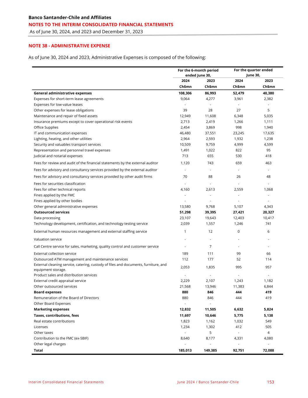 Banco Santander-Chile and Affiliates NOTES TO THE INTERIM CONSOLIDATED FINANCIAL STATEMENTS As of June 30, 2024, and 2023 and December 31, 2023 Interim Consolidated Financial Statements June 2024 / Banco Santander-Chile 153 NOTE 38 - ADMINISTRATIVE EXPENSE As of June 30, 2024 and 2023, Administrative Expenses is composed of the following: For the 6-month period ended June 30, For the quarter ended June 30, 2024 2023 2024 2023 Ch$mn Ch$mn Ch$mn Ch$mn General administrative expenses 108,306 86,993 52,479 40,380 Expenses for short-term lease agreements 9,064 4,277 3,961 2,382 Expenses for low-value leases - - - - Other expenses for lease obligations 39 28 27 5 Maintenance and repair of fixed assets 12,949 11,608 6,348 5,035 Insurance premiums except to cover operational risk events 2,713 2,419 1,266 1,111 Office Supplies 2,454 3,869 998 1,940 IT and communication expenses 46,480 37,551 23,245 17,635 Lighting, heating, and other utilities 2,964 2,593 1,932 1,238 Security and valuables transport services 10,509 9,759 4,999 4,599 Representation and personnel travel expenses 1,491 1,022 822 95 Judicial and notarial expenses 713 655 530 418 Fees for review and audit of the financial statements by the external auditor 1,120 743 659 463 Fees for advisory and consultancy services provided by the external auditor - - - - Fees for advisory and consultancy services provided by other audit firms 70 88 26 48 Fees for securities classification - - - - Fees for other technical reports 4,160 2,613 2,559 1,068 Fines applied by the FMC - - - - Fines applied by other bodies - - - - Other general administrative expenses 13,580 9,768 5,107 4,343 Outsourced services 51,298 39,395 27,421 20,327 Data processing 23,107 19,643 12,403 10,417 Technology development, certification, and technology testing service 2,039 1,557 1,246 741 External human resources management and external staffing service 1 12 0 6 Valuation service - - - - Call Centre service for sales, marketing, quality control and customer service - 7 - - External collection service 189 111 99 66 Outsourced ATM management and maintenance services 112 177 52 114 External cleaning service, catering, custody of files and documents, furniture, and equipment storage. 2,053 1,835 995 957 Product sales and distribution services - - - - External credit appraisal service 2,229 2,107 1,243 1,182 Other outsourced services 21,568 13,946 11,383 6,844 Board expenses 880 846 444 419 Remuneration of the Board of Directors 880 846 444 419 Other Board Expenses - - Marketing expenses 12,832 11,505 6,632 5,824 Taxes, contributions, fees 11,697 10,646 5,775 5,138 Real estate contributions 1,823 1,162 1,032 549 Licenses 1,234 1,302 412 505 Other taxes - 5 - 4 Contribution to the FMC (ex-SBIF) 8,640 8,177 4,331 4,080 Other legal charges - - - - Total 185,013 149,385 92,751 72,088