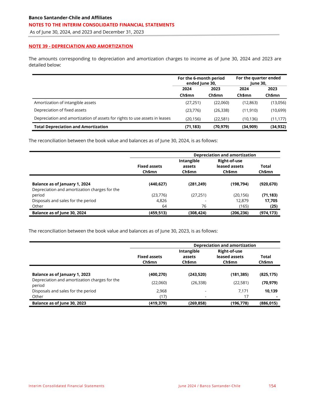Banco Santander-Chile and Affiliates NOTES TO THE INTERIM CONSOLIDATED FINANCIAL STATEMENTS As of June 30, 2024, and 2023 and December 31, 2023 Interim Consolidated Financial Statements June 2024 / Banco Santander-Chile 154 NOTE 39 - DEPRECIATION AND AMORTIZATION The amounts corresponding to depreciation and amortization charges to income as of June 30, 2024 and 2023 are detailed below: For the 6-month period ended June 30, For the quarter ended June 30, 2024 2023 2024 2023 Ch$mn Ch$mn Ch$mn Ch$mn Amortization of intangible assets (27,251) (22,060) (12,863) (13,056) Depreciation of fixed assets (23,776) (26,338) (11,910) (10,699) Depreciation and amortization of assets for rights to use assets in leases (20,156) (22,581) (10,136) (11,177) Total Depreciation and Amortization (71,183) (70,979) (34,909) (34,932) The reconciliation between the book value and balances as of June 30, 2024, is as follows: The reconciliation between the book value and balances as of June 30, 2023, is as follows: Depreciation and amortization Fixed assets Intangible assets Right-of-use leased assets Total Ch$mn Ch$mn Ch$mn Ch$mn Balance as of January 1, 2024 (440,627) (281,249) (198,794) (920,670) Depreciation and amortization charges for the period (23,776) (27,251) (20,156) (71,183) Disposals and sales for the period 4,826 - 12,879 17,705 Other 64 76 (165) (25) Balance as of June 30, 2024 (459,513) (308,424) (206,236) (974,173) Depreciation and amortization Fixed assets Intangible assets Right-of-use leased assets Total Ch$mn Ch$mn Ch$mn Ch$mn Balance as of January 1, 2023 (400,270) (243,520) (181,385) (825,175) Depreciation and amortization charges for the period (22,060) (26,338) (22,581) (70,979) Disposals and sales for the period 2,968 - 7,171 10,139 Other (17) - 17 - Balance as of June 30, 2023 (419,379) (269,858) (196,778) (886,015)
