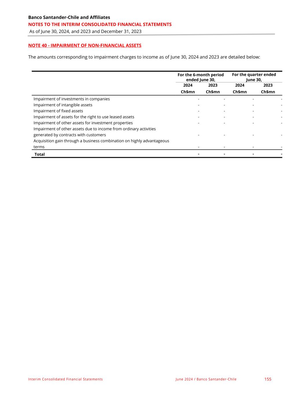 Banco Santander-Chile and Affiliates NOTES TO THE INTERIM CONSOLIDATED FINANCIAL STATEMENTS As of June 30, 2024, and 2023 and December 31, 2023 Interim Consolidated Financial Statements June 2024 / Banco Santander-Chile 155 NOTE 40 - IMPAIRMENT OF NON-FINANCIAL ASSETS The amounts corresponding to impairment charges to income as of June 30, 2024 and 2023 are detailed below: For the 6-month period ended June 30, For the quarter ended June 30, 2024 2023 2024 2023 Ch$mn Ch$mn Ch$mn Ch$mn Impairment of investments in companies - - - - Impairment of intangible assets - - - - Impairment of fixed assets - - - - Impairment of assets for the right to use leased assets - - - - Impairment of other assets for investment properties - - - - Impairment of other assets due to income from ordinary activities generated by contracts with customers - - - - Acquisition gain through a business combination on highly advantageous terms - - - - Total - - - -