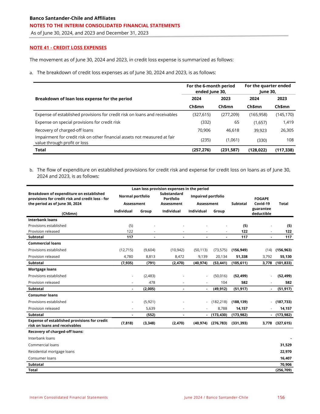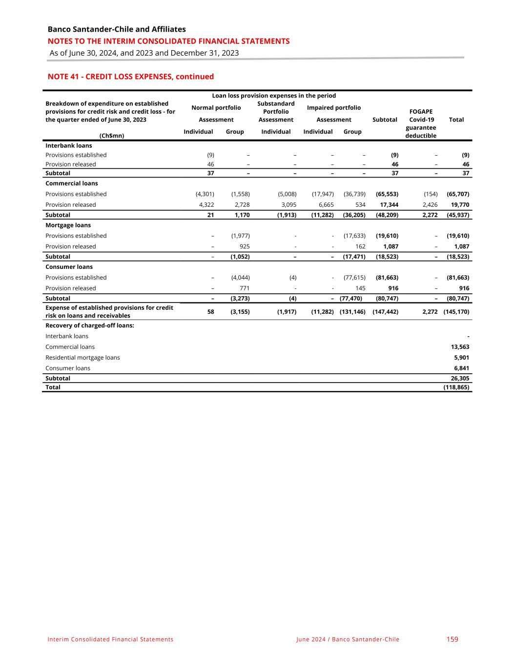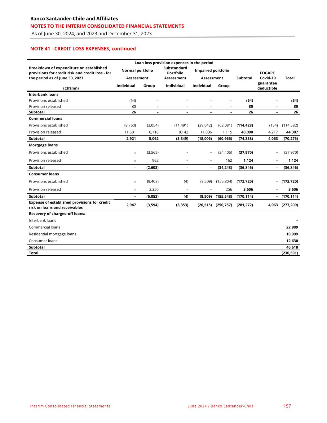 Banco Santander-Chile and Affiliates NOTES TO THE INTERIM CONSOLIDATED FINANCIAL STATEMENTS As of June 30, 2024, and 2023 and December 31, 2023 Interim Consolidated Financial Statements June 2024 / Banco Santander-Chile 157 NOTE 41 - CREDIT LOSS EXPENSES, continued Breakdown of expenditure on established provisions for credit risk and credit loss - for the period as of June 30, 2023 Loan loss provision expenses in the period Normal portfolio Substandard Portfolio Impaired portfolio Subtotal FOGAPE Covid-19 guarantee deductible Assessment Assessment Assessment Total Individual Group Individual Individual Group (Ch$mn) Interbank loans Provisions established (54) – – – – (54) – (54) Provision released 80 – – – – 80 – 80 Subtotal 26 – – – – 26 – 26 Commercial loans Provisions established (8,760) (3,054) (11,491) (29,042) (62,081) (114,428) (154) (114,582) Provision released 11,681 8,116 8,142 11,036 1,115 40,090 4,217 44,307 Subtotal 2,921 5,062 (3,349) (18,006) (60,966) (74,338) 4,063 (70,275) Mortgage loans Provisions established - (3,565) – – (34,405) (37,970) – (37,970) Provision released - 962 – – 162 1,124 – 1,124 Subtotal – (2,603) – – (34,243) (36,846) – (36,846) Consumer loans Provisions established - (9,403) (4) (8,509) (155,804) (173,720) – (173,720) Provision released - 3,350 – – 256 3,606 – 3,606 Subtotal – (6,053) (4) (8,509) (155,548) (170,114) – (170,114) Expense of established provisions for credit risk on loans and receivables 2,947 (3,594) (3,353) (26,515) (250,757) (281,272) 4,063 (277,209) Recovery of charged-off loans: Interbank loans – Commercial loans 22,989 Residential mortgage loans 10,999 Consumer loans 12,630 Subtotal 46,618 Total (230,591)